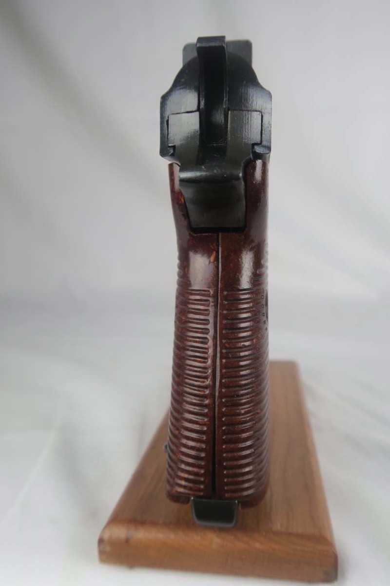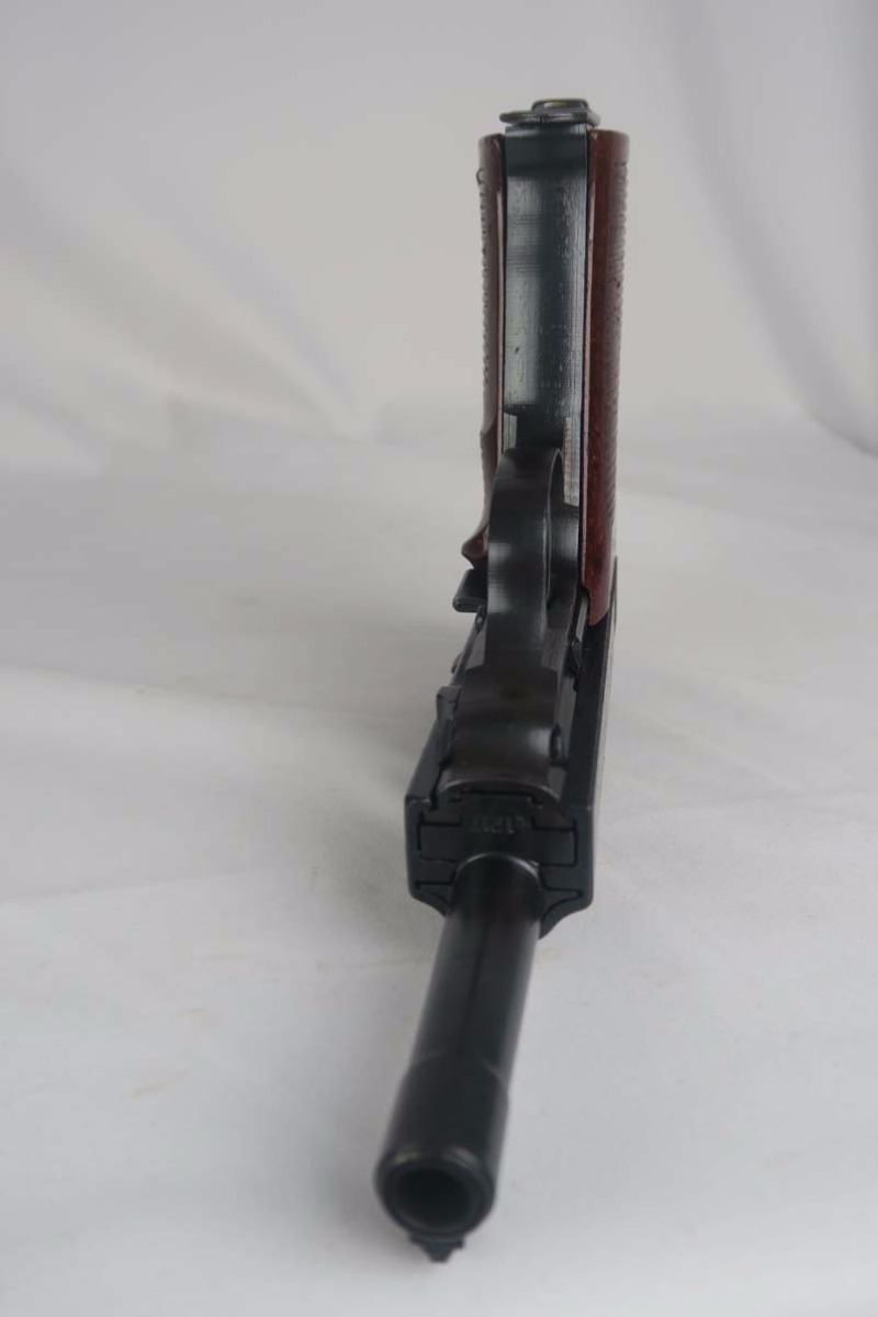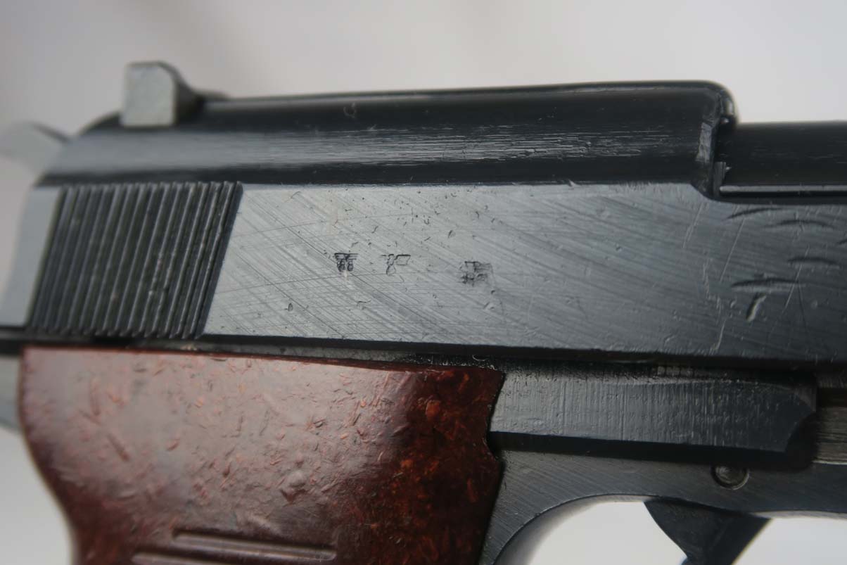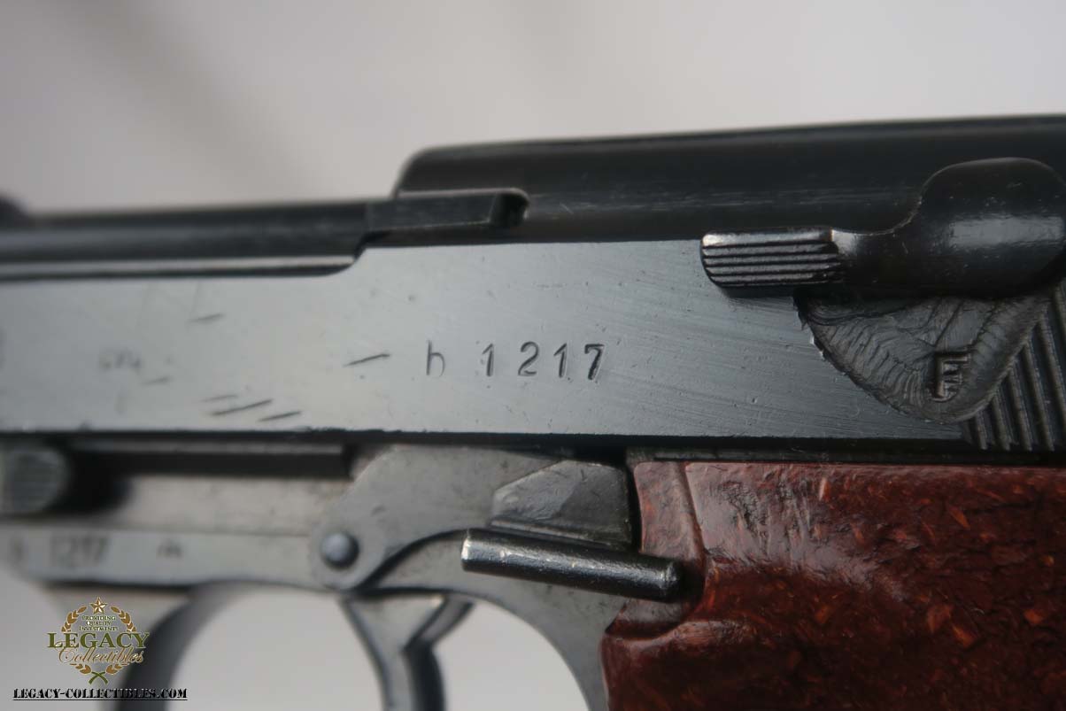 3/27/17 – This is a late-war Spreewerk P.38 in mint condition.  The b-prefix serial number denotes this pistol as having been produced in 1945,  and the rough machining on this pistol aligns with the late-war date.  There are dings in the metal on both sides of the slide, but the finish on this pistol is minty, with no wear to mention.  It has not been re-blued or Russian dipped.  Correct and beautiful reddish Spreewerk grips.  Magazine is E/359 proofed on the spine.  Bore has slight frosting but strong rifling, I’d rate it an 8/10.
