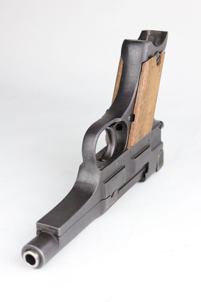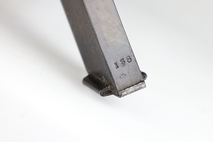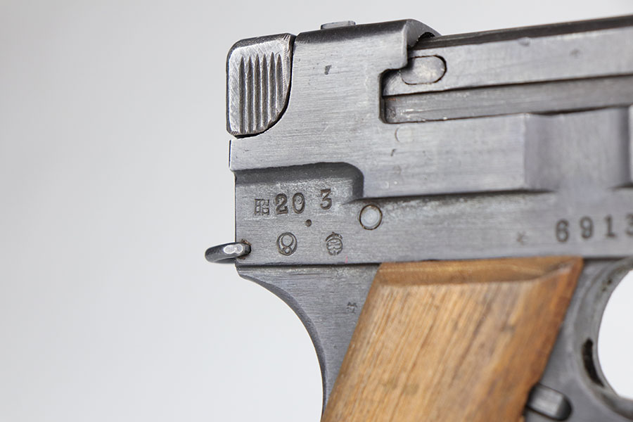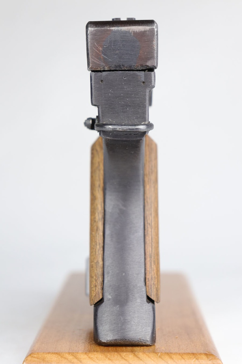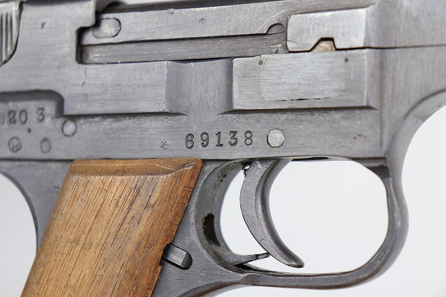 4/30/20 – This is a mint, end of war Type 94 Nambu with the original, matching magazine. It’s a square frame example that was made in March of 1945. It has tiny bits of edge wear but is virtually mint overall. Mint bore and excellent, unmarked grips.