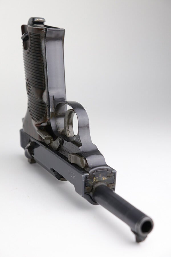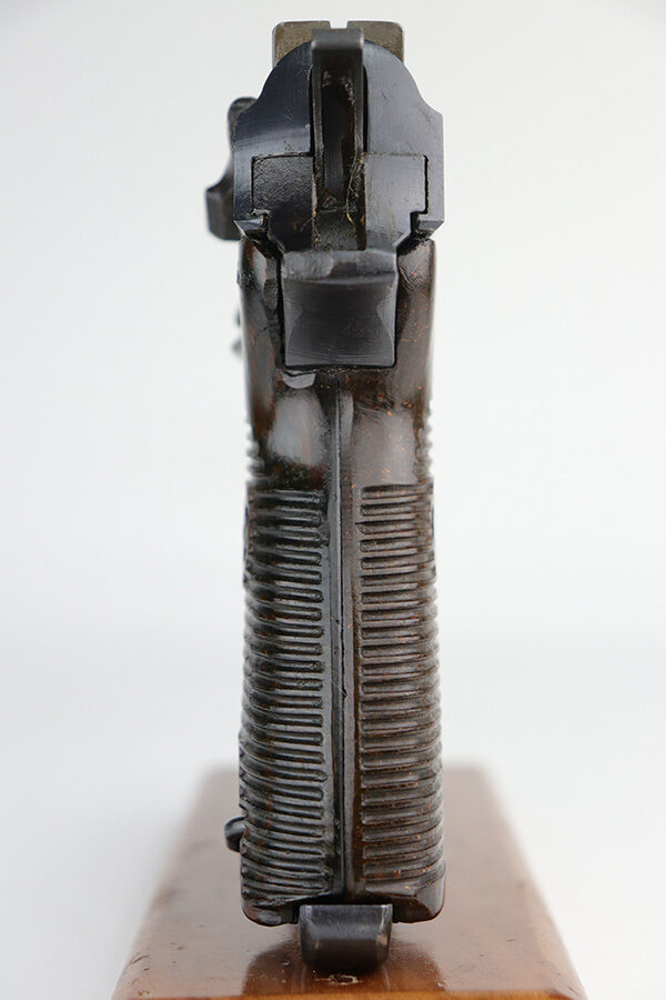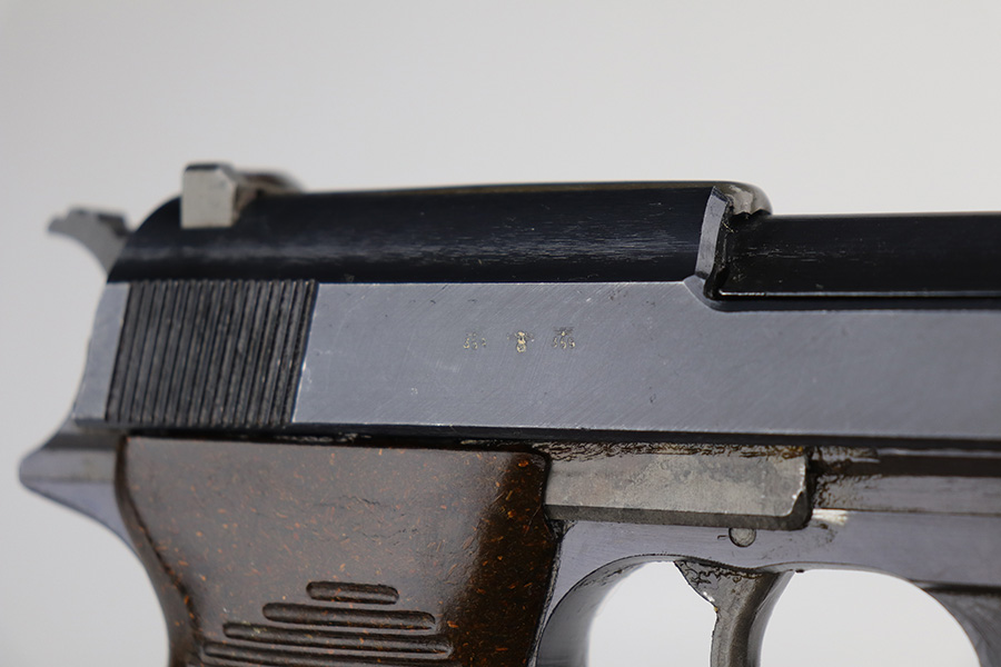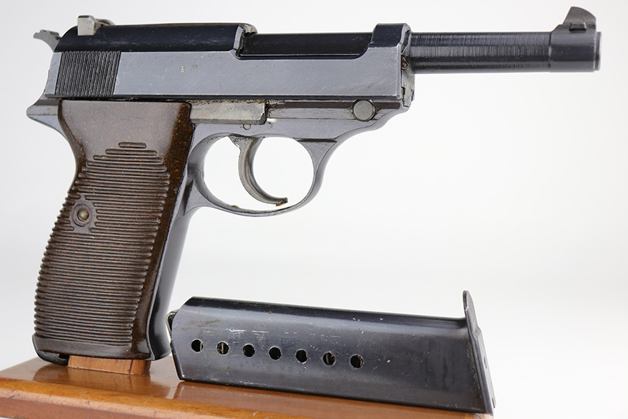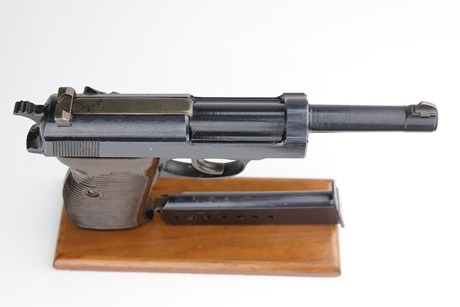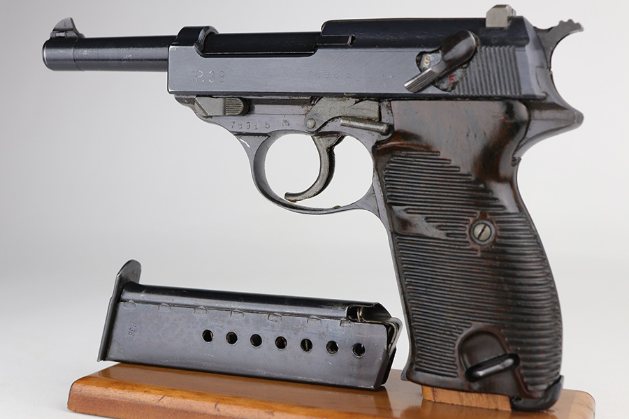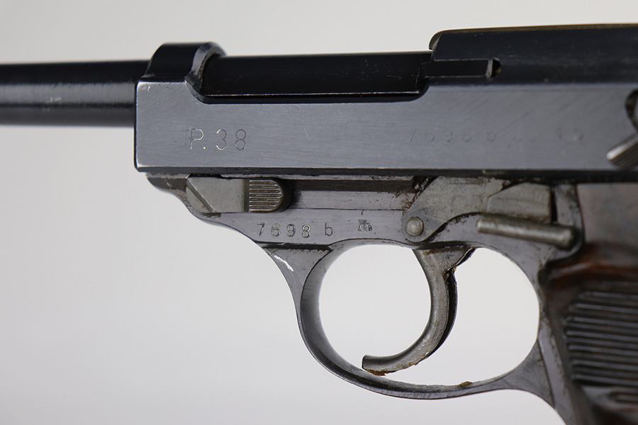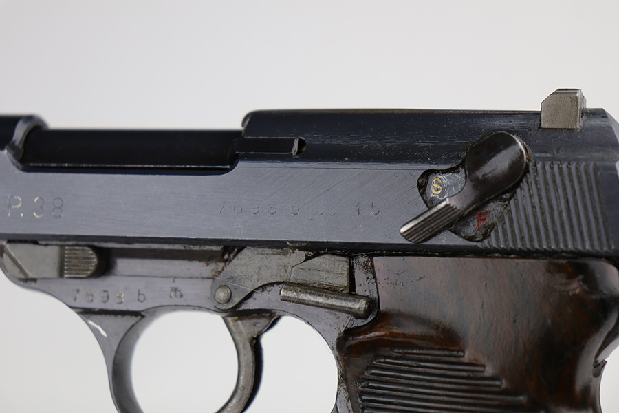 9/8/21 – This is a mint example of a Walther P.38 issued to the Nazi military at the very end of WW2, in 1945. It is all matching and has the proper “Eagle 259” military acceptance proofs. It has the proper late-war features such as a cog hammer and phosphate small parts. It has a rare FNH-made barrel. The gun has retained about 99% of its original finish. There is just a hint of wear on some of the high edges. Rough machining marks typical of late war guns. There is spotty discoloration on the phosphate parts, also typical. Comes with excellent late-war grips and a period-correct magazine. De-cocker is functional. Mint bore.
