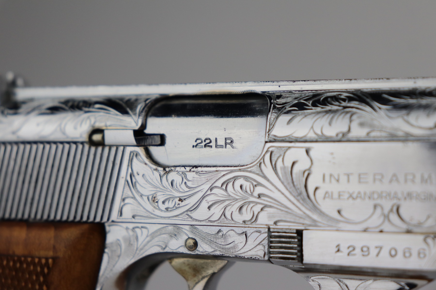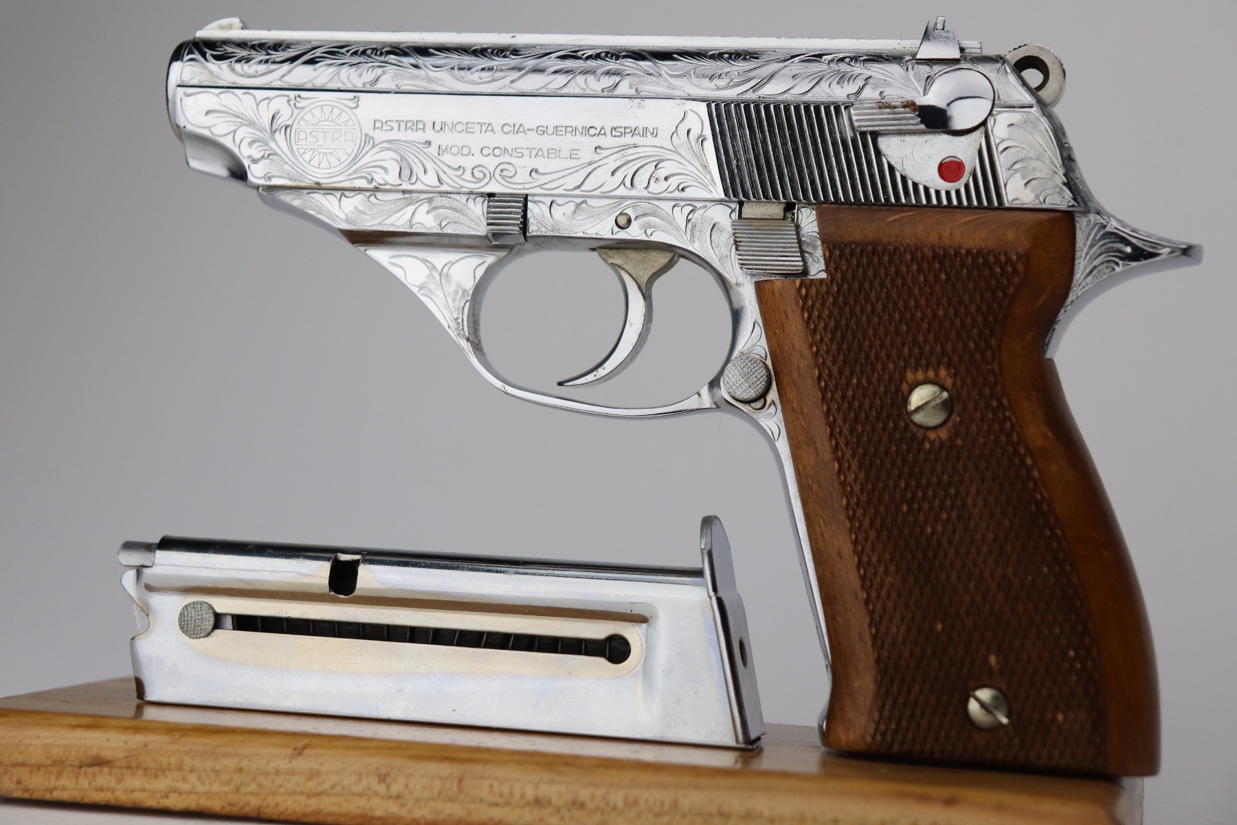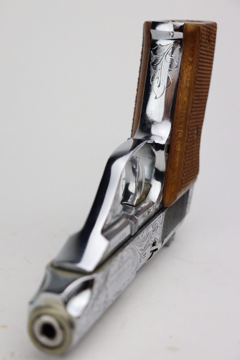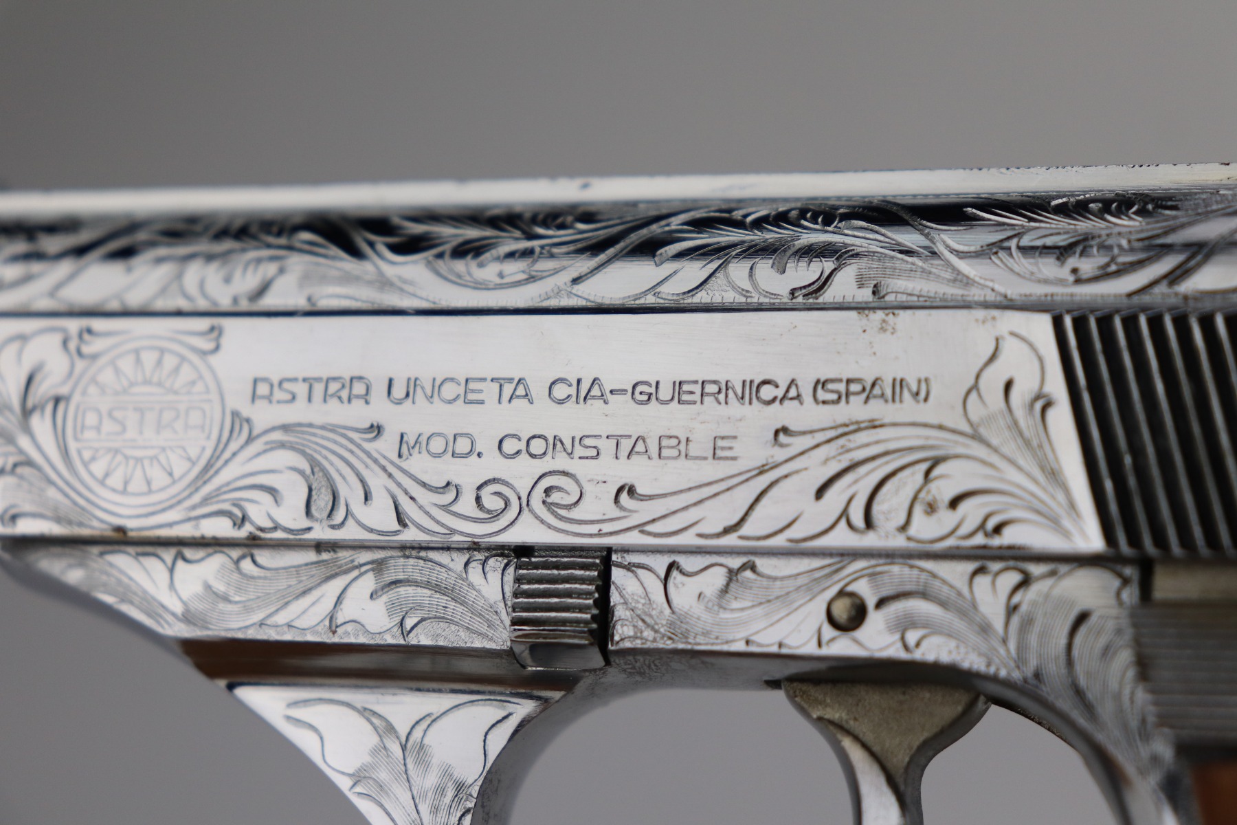 3/5/21 – This is a mint example of a factory-engraved Astra Constable, chambered in .22LR. The gun features a nice nickel finish with gorgeous flor engraving throughout. It is has retained virtually all of its finish with very minor pin-pricking on the front strap. Comes with excellent grips and a nickeled magazine. The bore is mint.