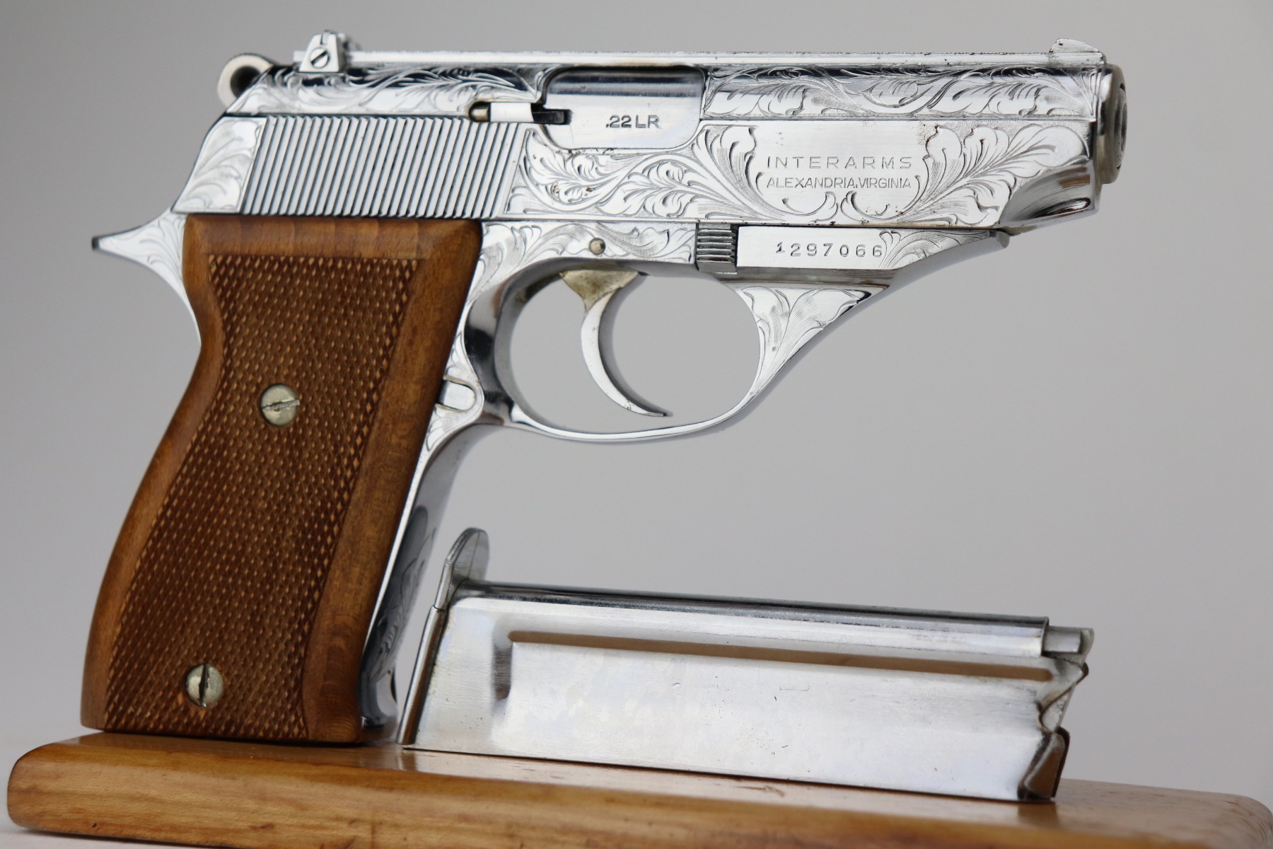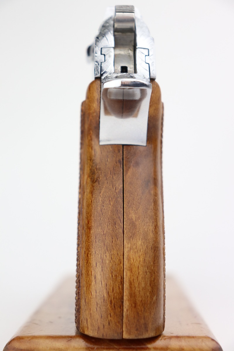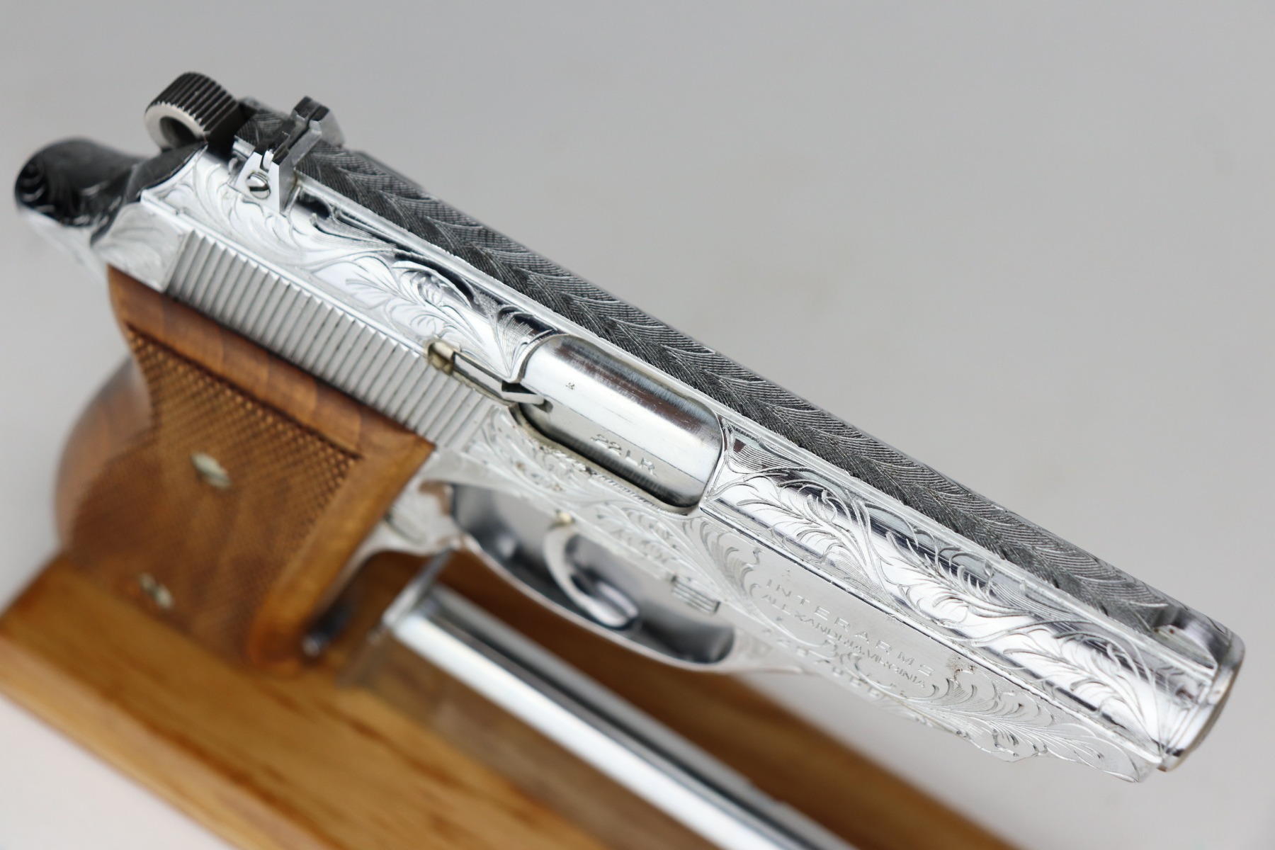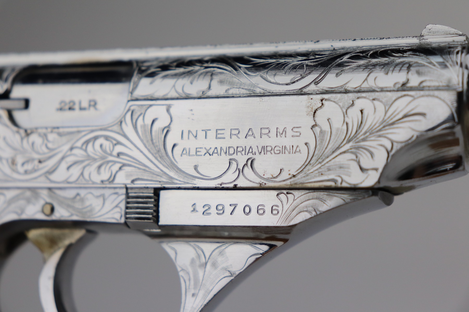 3/5/21 – This is a mint example of a factory-engraved Astra Constable, chambered in .22LR. The gun features a nice nickel finish with gorgeous flor engraving throughout. It is has retained virtually all of its finish with very minor pin-pricking on the front strap. Comes with excellent grips and a nickeled magazine. The bore is mint.