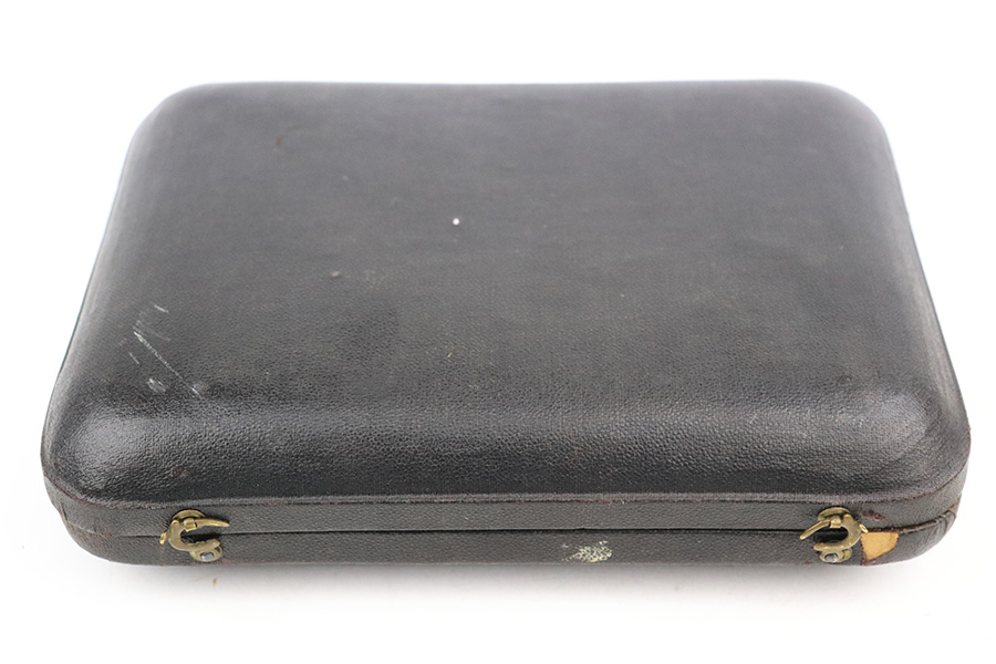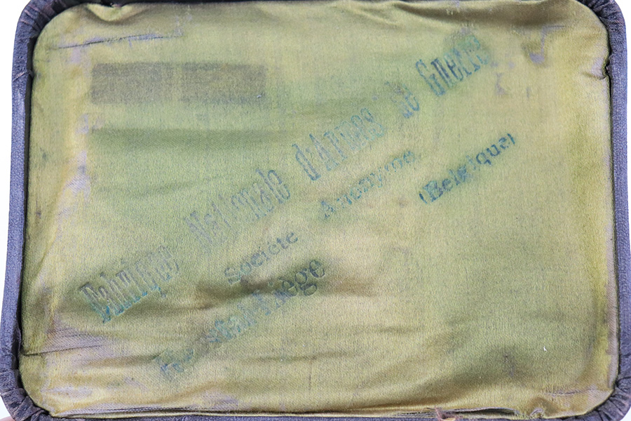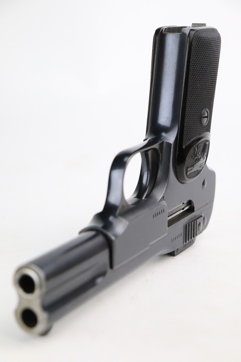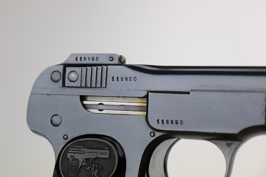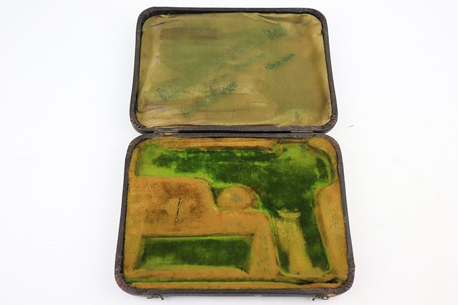 7/26/22 – This is a a very cool offering, comprised of the finest FN Browning Model 1900 we’ve offered and a very rare, original presentation case. The pistol is matching and original with 99% of the blue remaining. Just a hint of muzzle wear, and hardly any other bluing wear to mention. Minty bore and grips, though the grips are different colors so it’s possible one panel was replaced. But far more rare than the pistol, is the original FN case. The lining is embroidered fairly clearly with ‘Fabrique Nationale d’Armes De Guerre’ over ‘Societe Anonyme’ and ‘Herstal Liege (Belgique)’. This is the first such case we’ve encountered and is fitted for the magazine and cleaning rod. The interior is in good shape overall, with a couple of tears but no abnormal wear/damage. The outer hard case is exterior is in great shape with just a few small patches of material missing.
