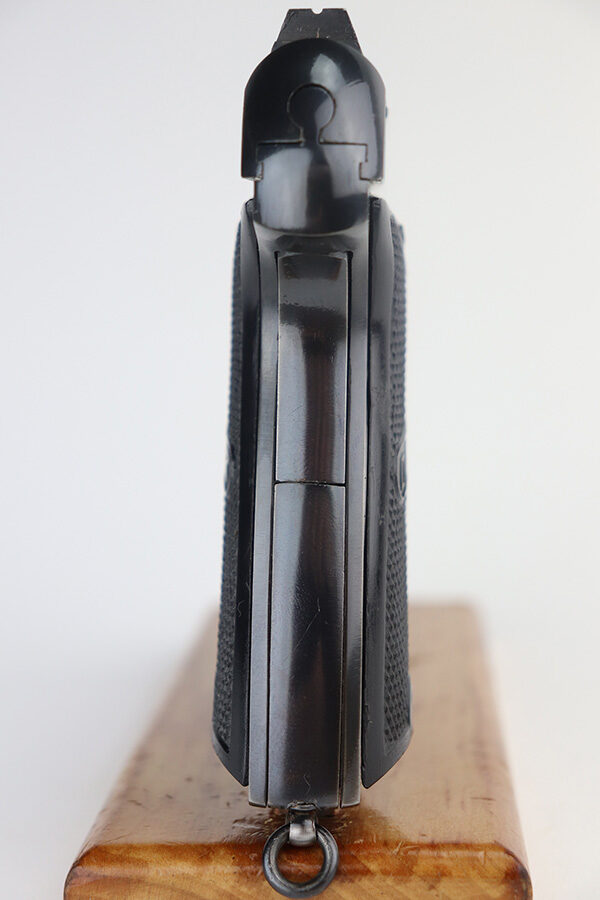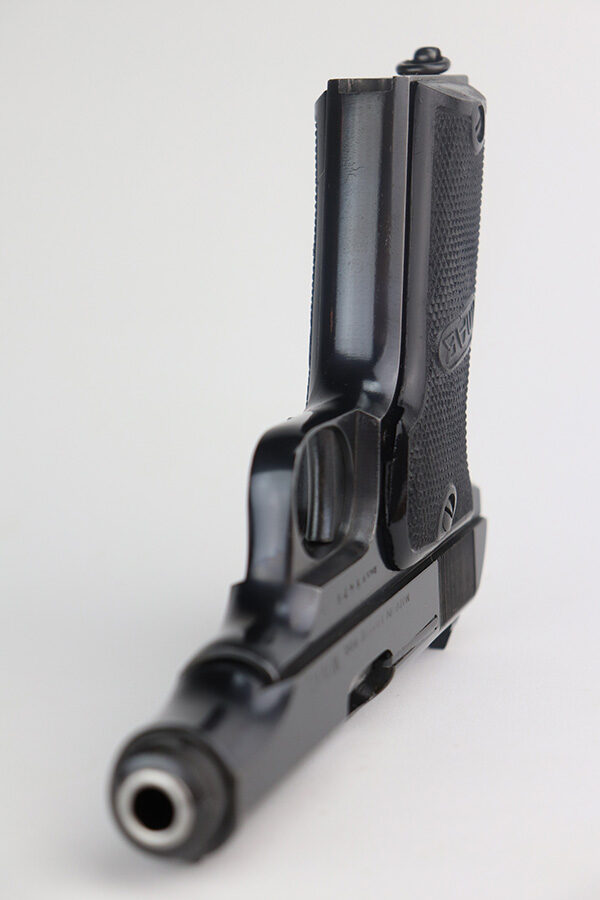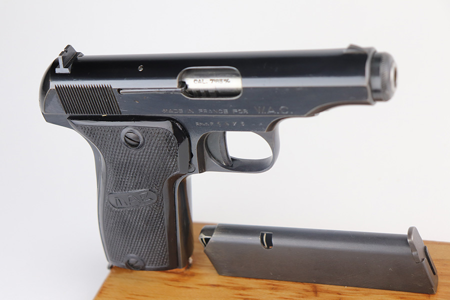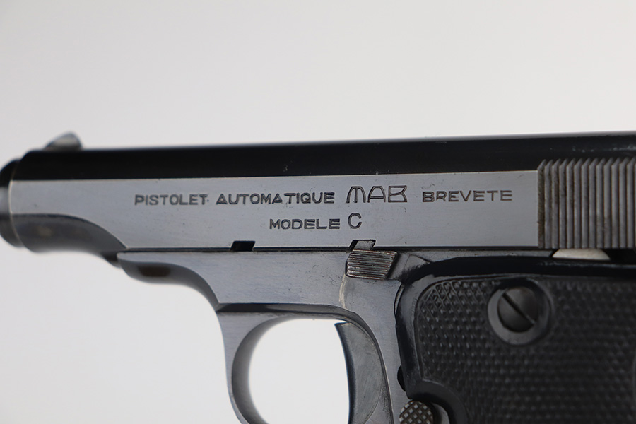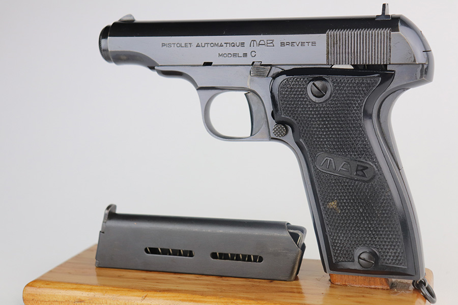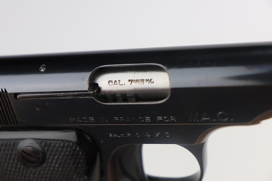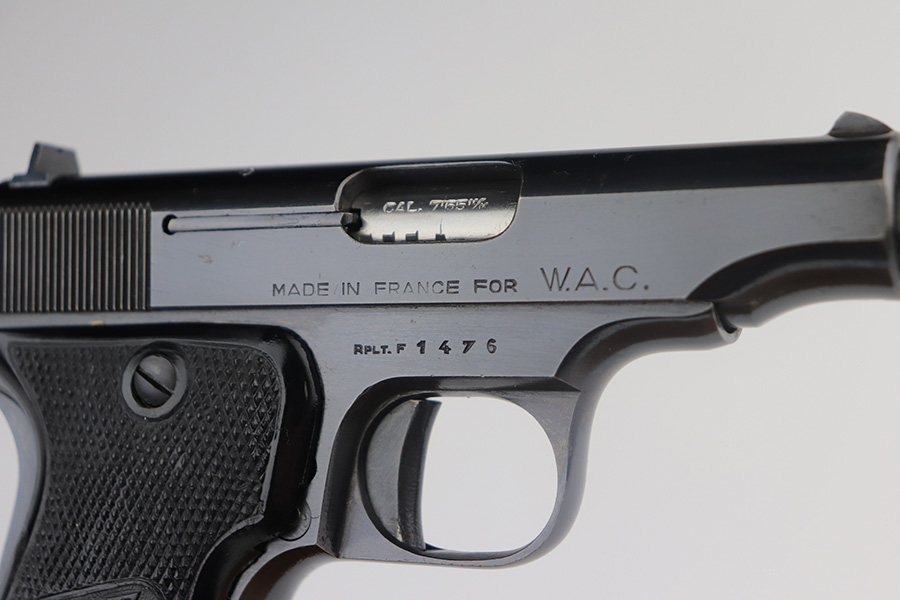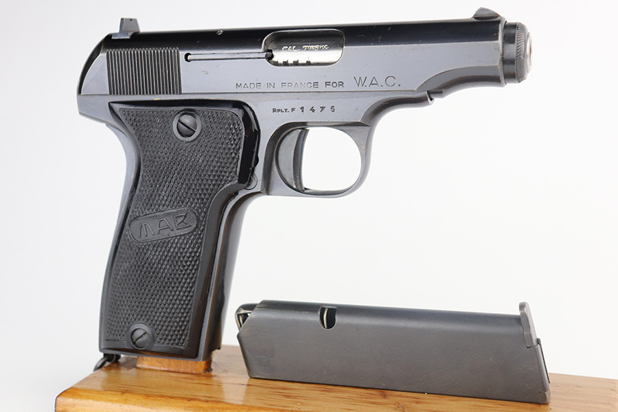 6/1/21 – This is a mint example of a post-WW2 French MAB Model C made for the WAC (Winfield Arms Corp). The gun is all matching and has the proper “WAC” marking on the right side of the slide. Lanyard ring at the base of the frame. It has retained about 99% of its bluing. There is just a hint of wear on some of the high edges and two tiny dots of wear on the right side of the slide. Comes with excellent grips and a proper magazine. Mint bore.