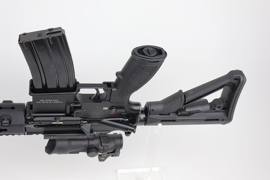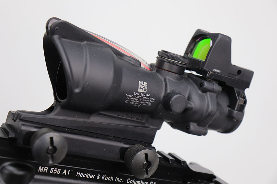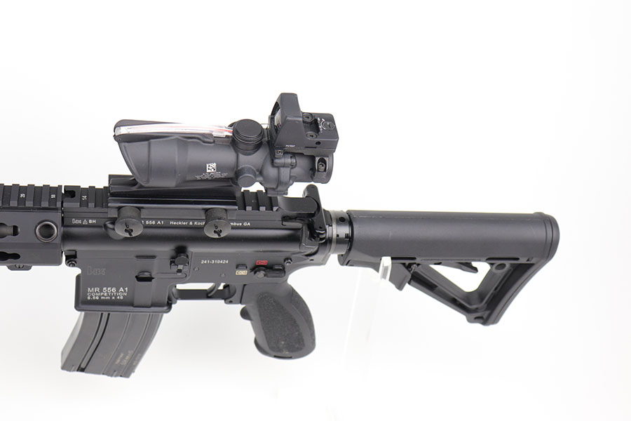 10/9/20 – This is a mint, unfired Heckler & Koch MR 556A1 Competition model rifle with Trijicon ACOG 4×32 scope with top mounted red dot peeper sight. Reticle is red crosshairs. The scope is powered under tritium so no batteries required. The gun was never fired by the previous owner so is in perfect condition. Optics on the sights are crystal clear. Magazine is made by E-Lander.