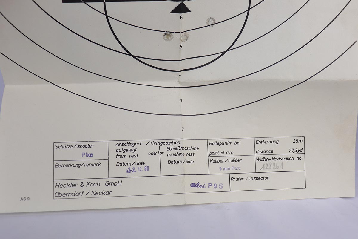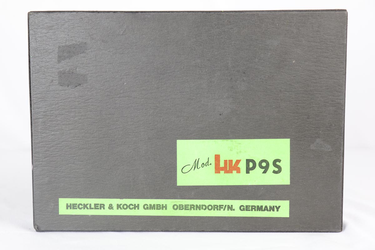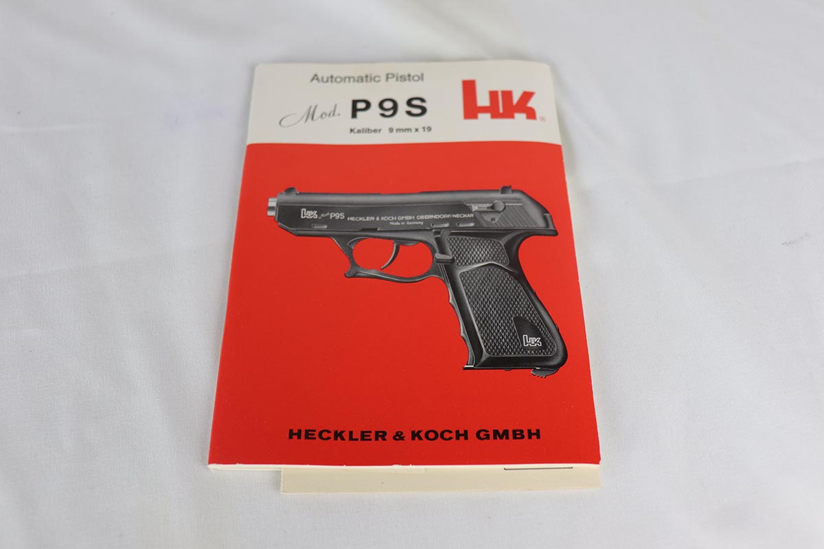 10/10/18 – This is a mint H&K P9S Target pistol in 9mm Para caliber, as new in the box. A very uncommon P9S model, this 9mm Target model comes with an adjustable rear sight, raised “shark fin” front sight and black plastic grips. The gun appears unfired and is complete with original box, manual, test target and 2 magazines. It is marked with a date code “IA” and was made in 1980. German Eagle/N and Oberndorf “antler” proofs are present as well. Very few of these target guns made it into US and are very difficult to find, especially in such pristine condition. The gun is all matching and original. It is a companion gun to the .45 target P9S listed on our website. A must for any advanced HK collector.