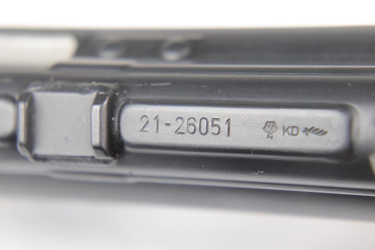 5/8/18 –  SOLD – This is an “as new” unfired German H&K SP89 pistol, chambered in 9mm Para, which is essentially a semi-auto version of selective fire MP5 pistol and was imported for a short period of time in late 80s and early 90s. The importation was banned in 1994 and no more guns can be brought in to the US. This one is virtually new with no evidence of it being fired. It comes with three mags and a ‘brand new in the box’  brace that attaches to the gun and makes it look super cool! The gun is German proofed and date coded KD on top of the receiver, which represents ’93. A great example of hard to find pistol.