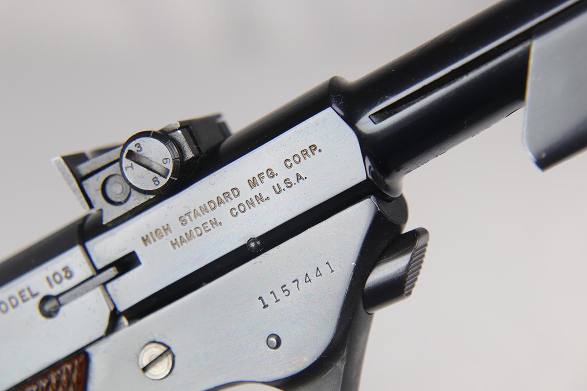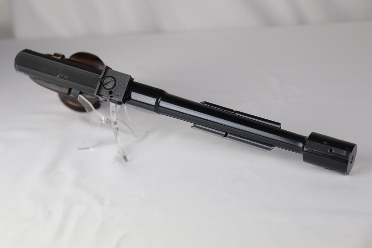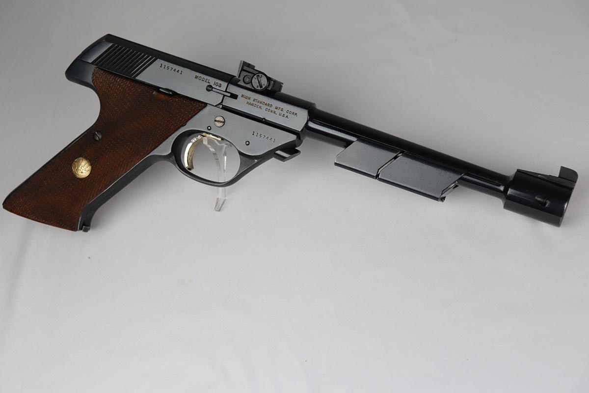 6/12/18 – This is a beautiful Hi-Standard Supermatic Trophy target pistol, chambered in .22LR and made in the early 60s. It is in 99% original condition and only has a few miniscule handling marks. The “Trophy” Hi-standard pistols of that era were finished to the highest standards (no pun intended) and were considered to be the “cadillacs” of the Hi-Standard line of target guns. Additionally, they were designed to look like “space guns” – the way the space guns were perceived to look at that time (think Flash Gordon). They sported long barrels and rear sight mounted on the rear of the barrel, not on the slide. The muzzle brake was machined integral to the barrel and gave the gun an even more futuristic appearance. The blueing on Trophy pistols was highly polished, almost to a mirror-like finish. Each gun came with a set of adjustable weights that could be moved along the length of the barrel to fit the shooter’s needs. Grips were beautifully checkered and equipped with a very comfortable thumb rest. But above all, these were first class target guns, on par with the German Olympias and Swiss Hammerlies. It was, without a doubt, the best target gun made in the US. This particular pistol is in almost new condition and has a very desirable 8-inch barrel and both barrel weights. The bore and grips are mint. A superb example that begs to be taken to the range.