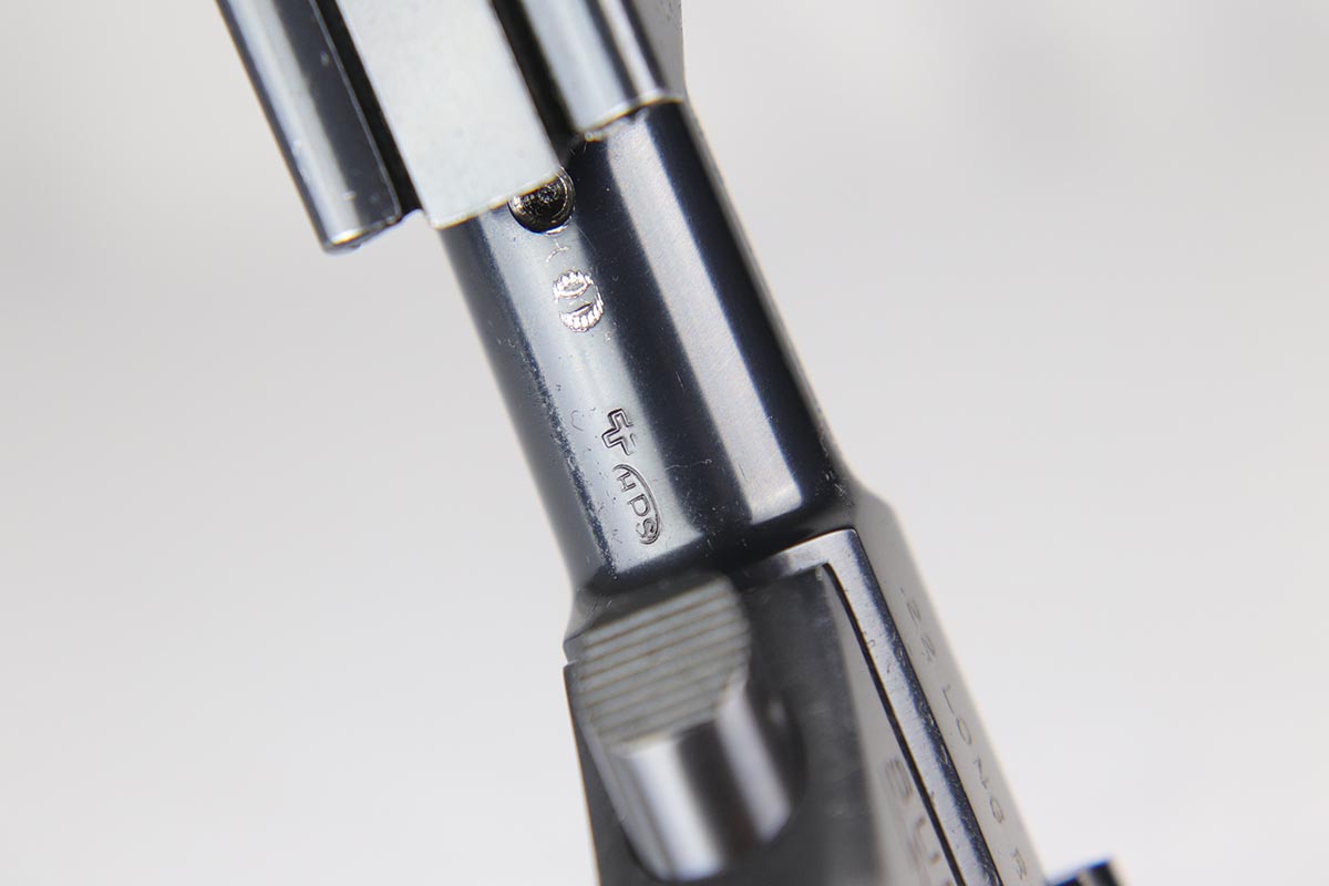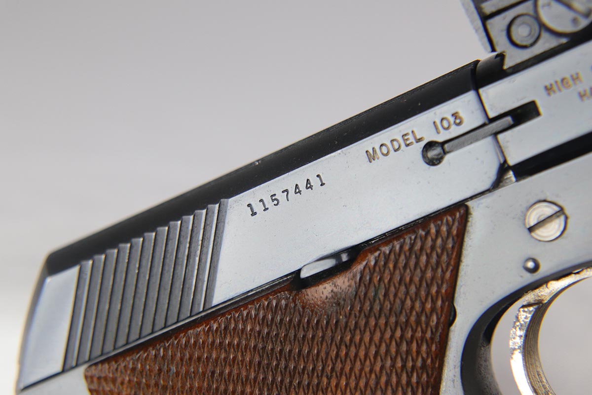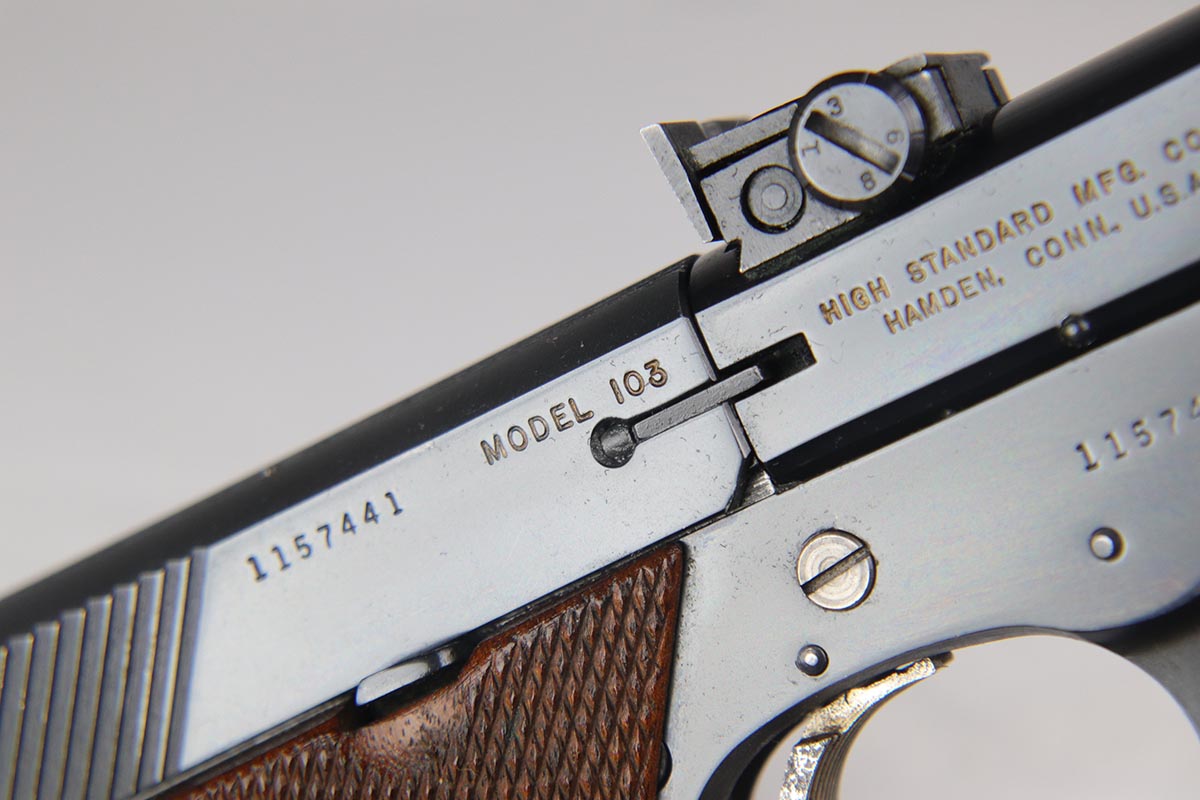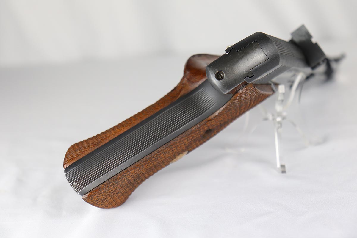 6/12/18 – This is a beautiful Hi-Standard Supermatic Trophy target pistol, chambered in .22LR and made in the early 60s. It is in 99% original condition and only has a few miniscule handling marks. The “Trophy” Hi-standard pistols of that era were finished to the highest standards (no pun intended) and were considered to be the “cadillacs” of the Hi-Standard line of target guns. Additionally, they were designed to look like “space guns” – the way the space guns were perceived to look at that time (think Flash Gordon). They sported long barrels and rear sight mounted on the rear of the barrel, not on the slide. The muzzle brake was machined integral to the barrel and gave the gun an even more futuristic appearance. The blueing on Trophy pistols was highly polished, almost to a mirror-like finish. Each gun came with a set of adjustable weights that could be moved along the length of the barrel to fit the shooter’s needs. Grips were beautifully checkered and equipped with a very comfortable thumb rest. But above all, these were first class target guns, on par with the German Olympias and Swiss Hammerlies. It was, without a doubt, the best target gun made in the US. This particular pistol is in almost new condition and has a very desirable 8-inch barrel and both barrel weights. The bore and grips are mint. A superb example that begs to be taken to the range.