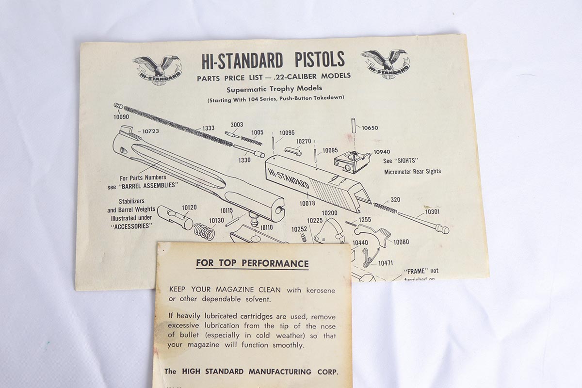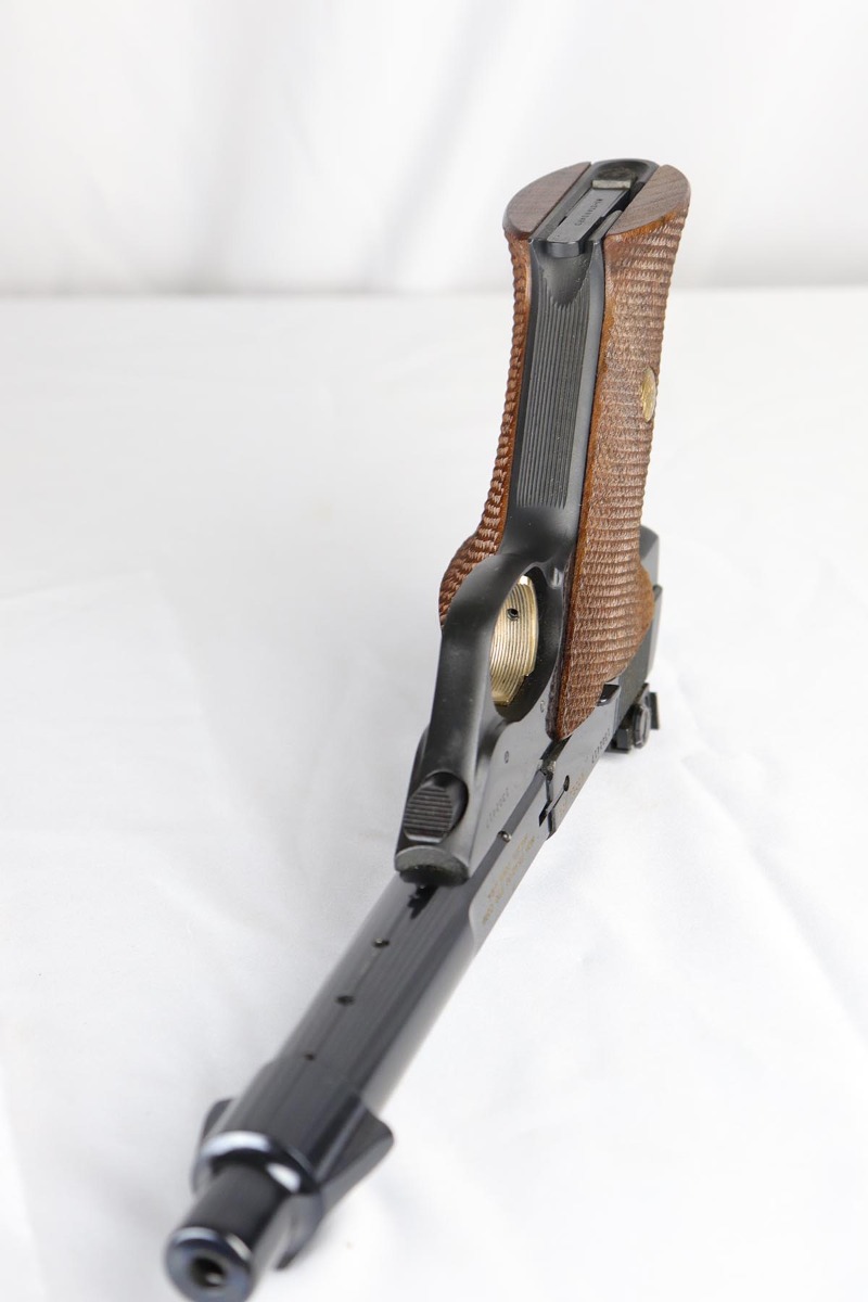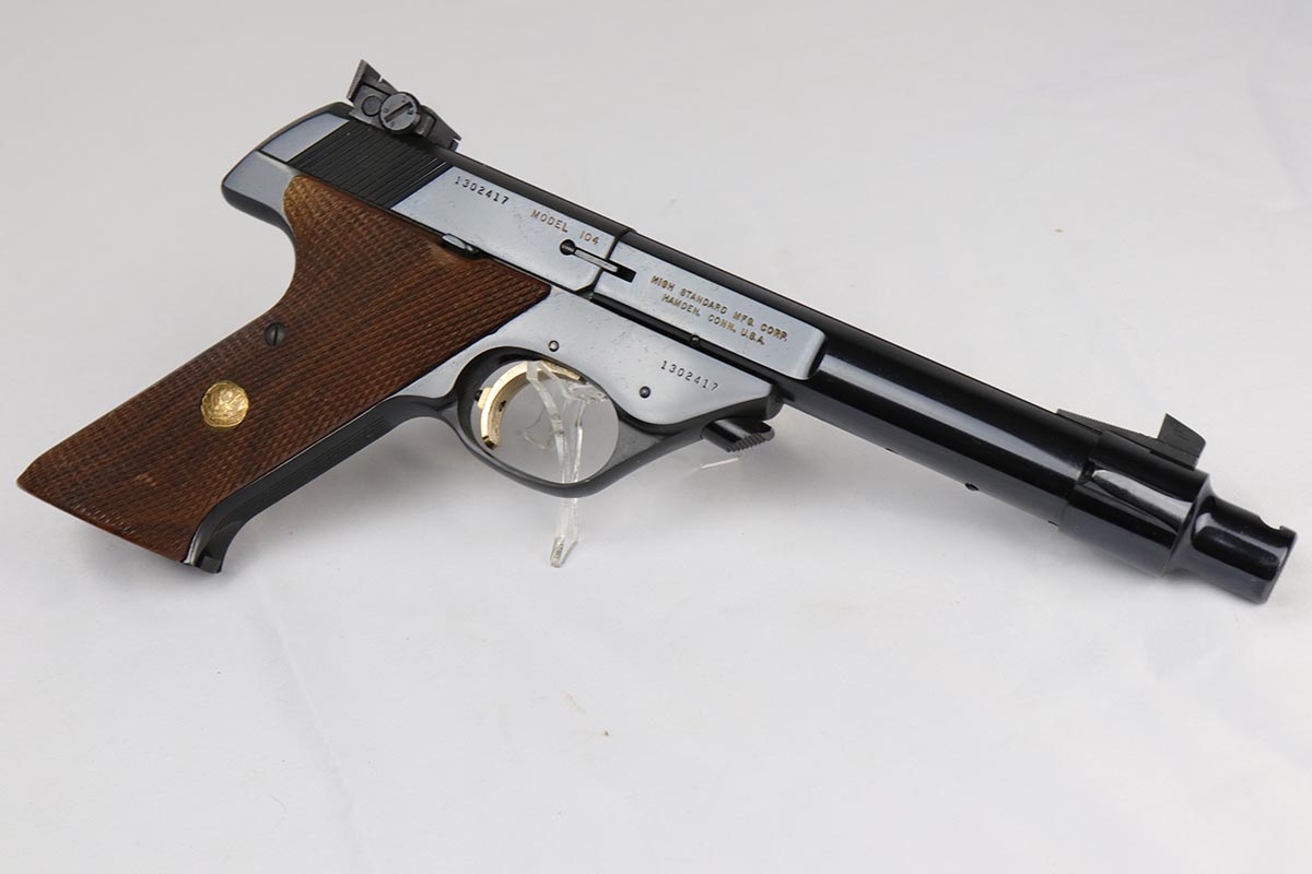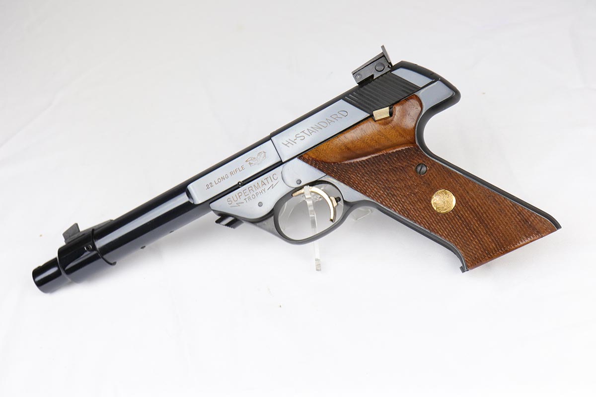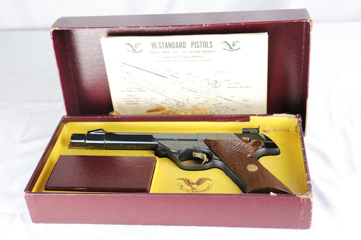 6/12/18 – This is a perfect example of an ANIB Hi-Standard Supermatic Trophy 104, made in the early 60s. The “Trophy” line of target pistols were the “Cadillacs” of High Standard production. Finished in high gloss blue with gold filled lettering and strawed small parts, these pistols had been used in competition but also offered the owner an opportunity to own a piece of art. The slanted grip and a “space” design earned them the nickname of “space guns”, that became highly prized by collectors. This set is complete with an original numbered box, both weights in it original wrapper, a muzzle break and all the original paperwork.  Also comes with a second magazine. A great example of the American-made target pistol of the bygone years that cannot be upgraded.