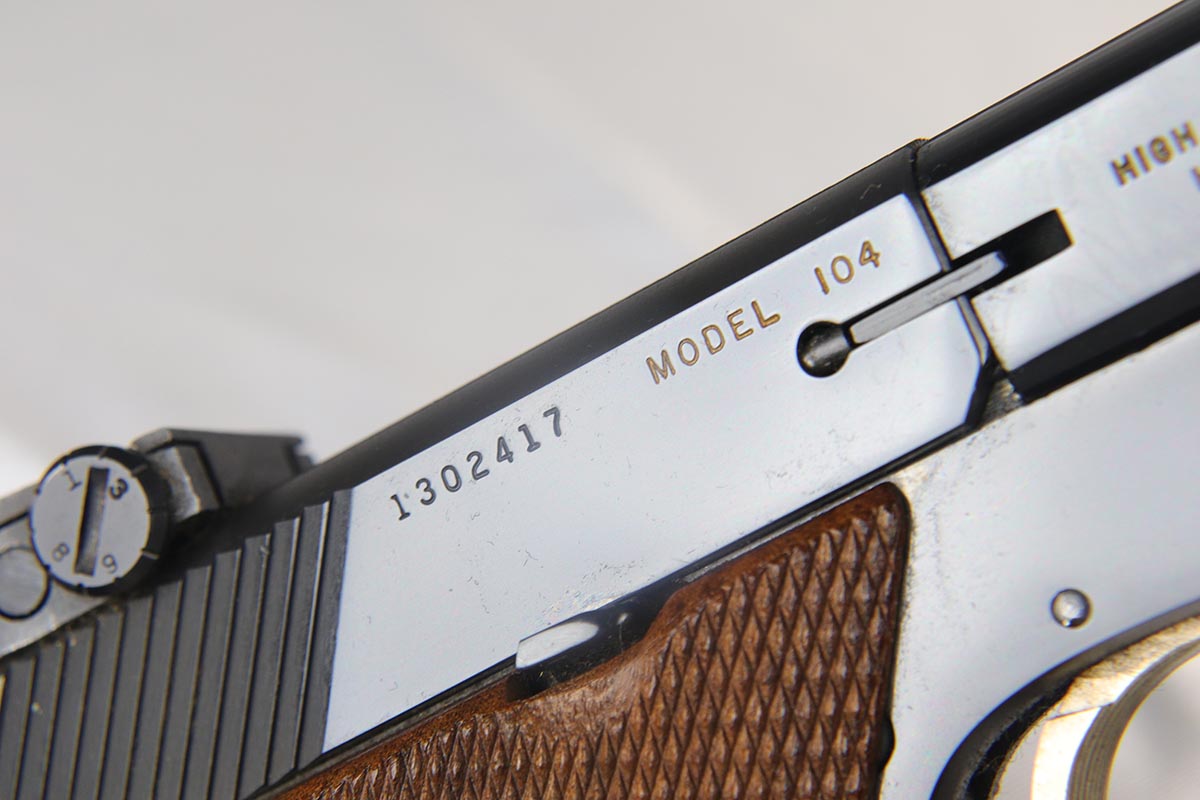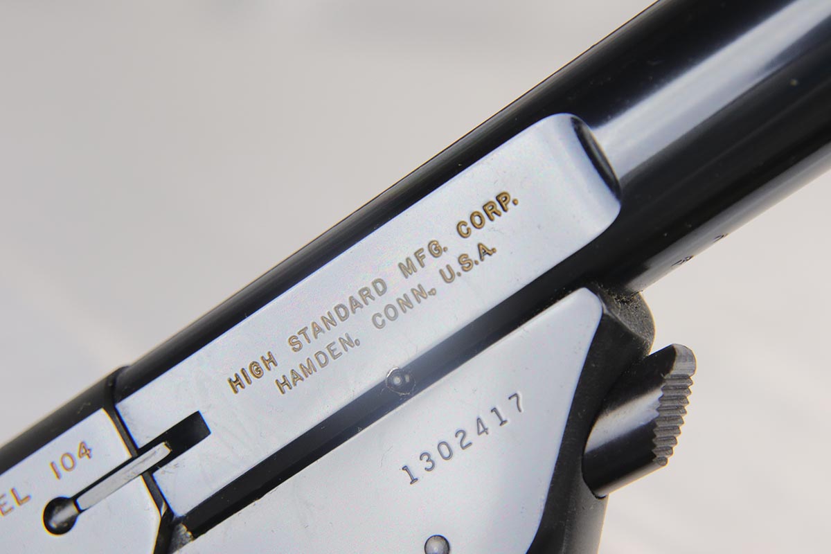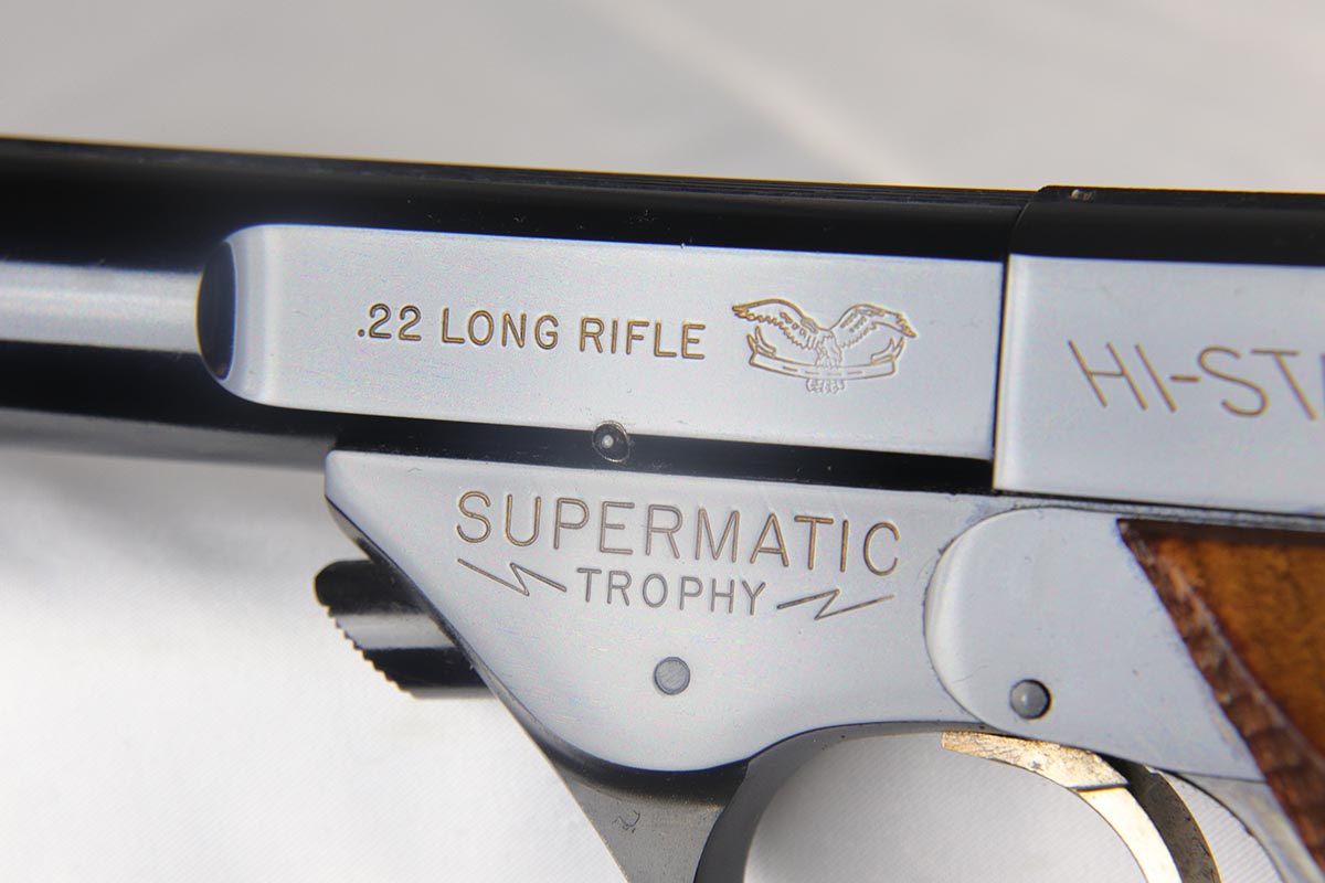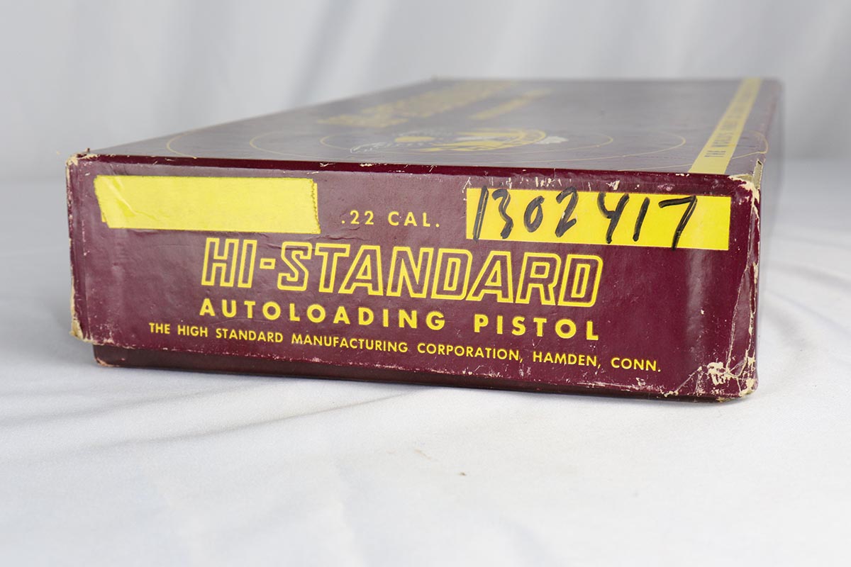 6/12/18 – This is a perfect example of an ANIB Hi-Standard Supermatic Trophy 104, made in the early 60s. The “Trophy” line of target pistols were the “Cadillacs” of High Standard production. Finished in high gloss blue with gold filled lettering and strawed small parts, these pistols had been used in competition but also offered the owner an opportunity to own a piece of art. The slanted grip and a “space” design earned them the nickname of “space guns”, that became highly prized by collectors. This set is complete with an original numbered box, both weights in it original wrapper, a muzzle break and all the original paperwork.  Also comes with a second magazine. A great example of the American-made target pistol of the bygone years that cannot be upgraded.