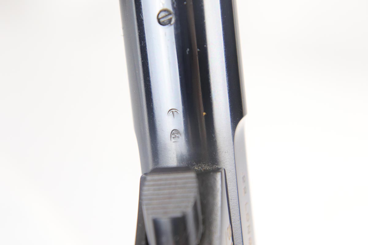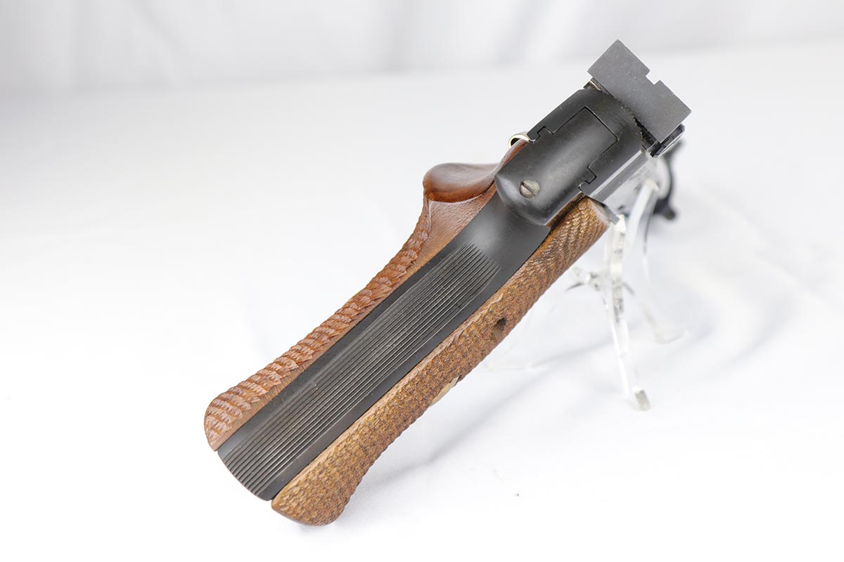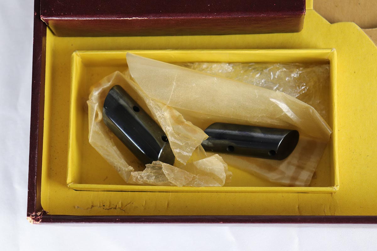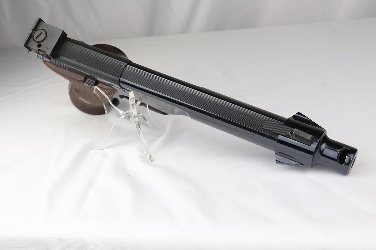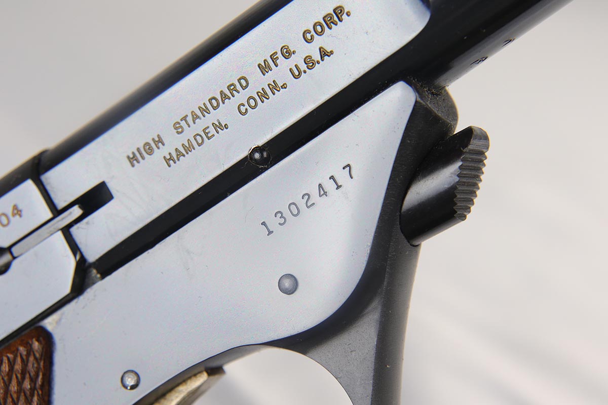 6/12/18 – This is a perfect example of an ANIB Hi-Standard Supermatic Trophy 104, made in the early 60s. The “Trophy” line of target pistols were the “Cadillacs” of High Standard production. Finished in high gloss blue with gold filled lettering and strawed small parts, these pistols had been used in competition but also offered the owner an opportunity to own a piece of art. The slanted grip and a “space” design earned them the nickname of “space guns”, that became highly prized by collectors. This set is complete with an original numbered box, both weights in it original wrapper, a muzzle break and all the original paperwork.  Also comes with a second magazine. A great example of the American-made target pistol of the bygone years that cannot be upgraded.