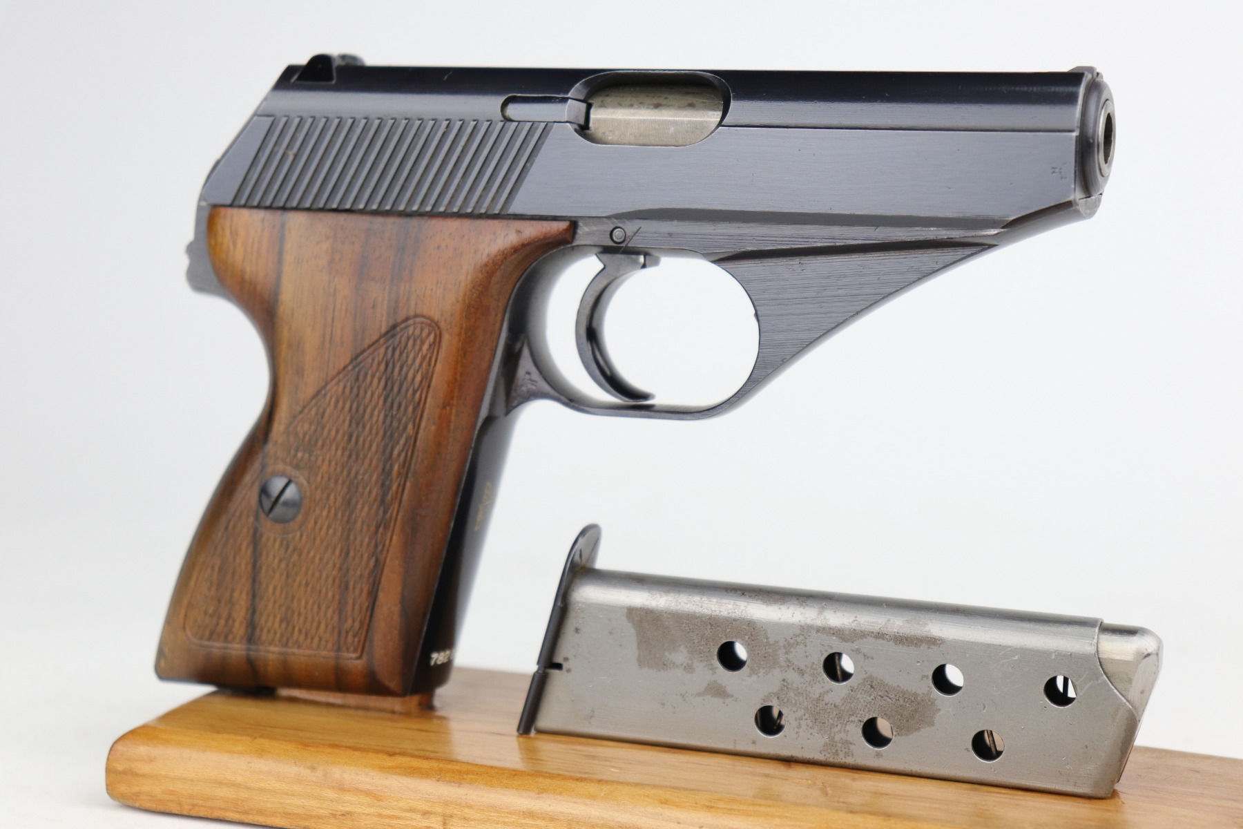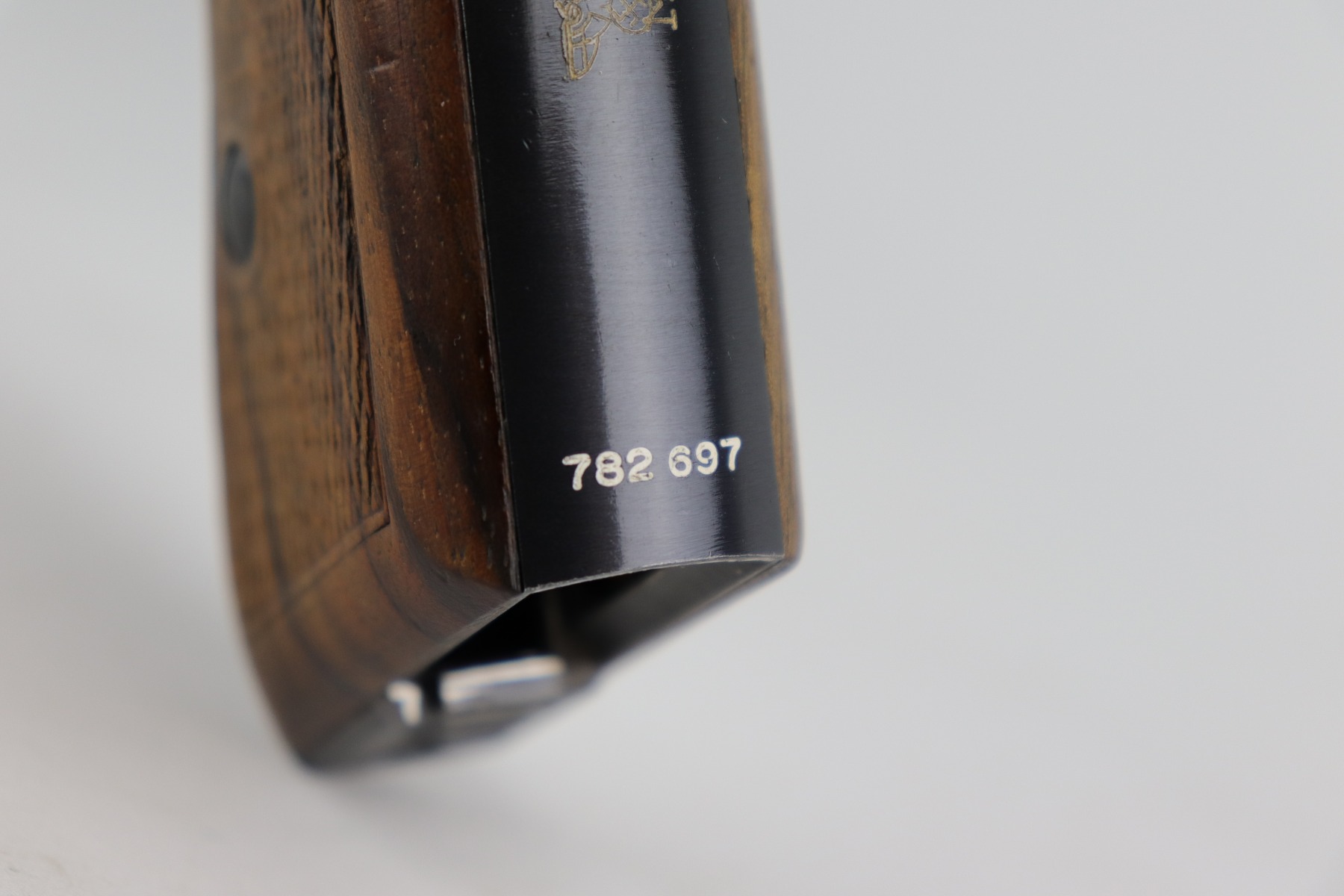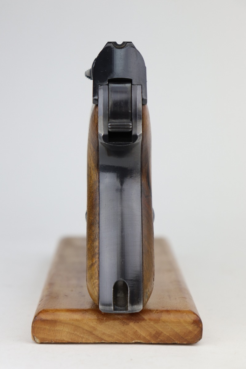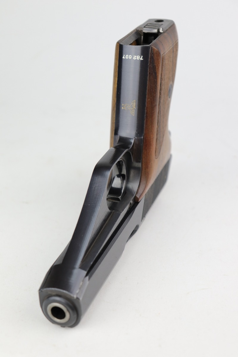 1/5/21 – This is a mint example of a Mauser HSC issued to the Nazi Kriegsmarine in 1942. It is all matching and has the proper “Eagle M” marking on the front strap. This is a 2nd variation – only about 7,000 made. Please note: this marking is slightly thinner than others we have seen. Therefore, we cannot definitely speak to its authenticity. It has retained about 99% of its bluing with just a hint of wear around the muzzle. It comes with excellent grips and a proper magazine. The bore is mint.
