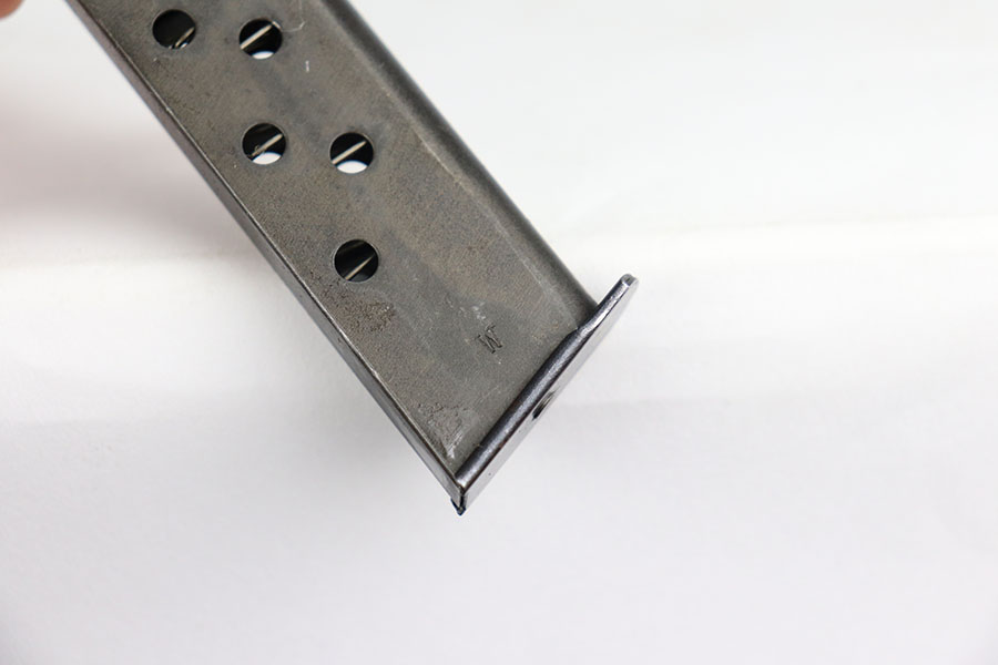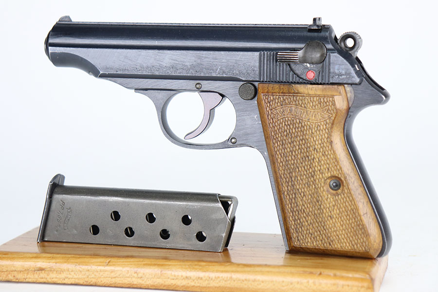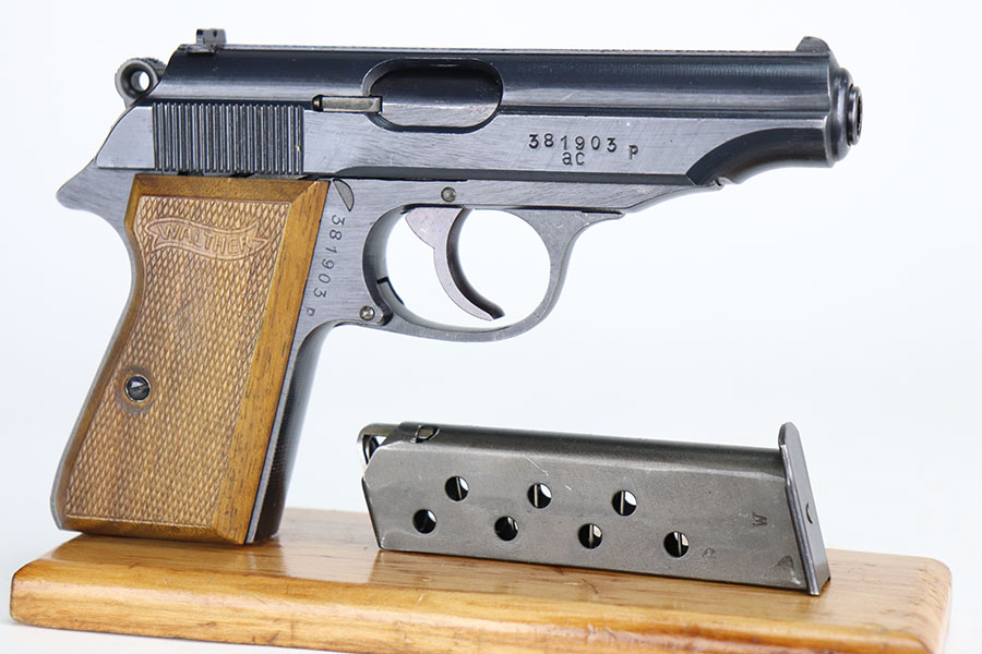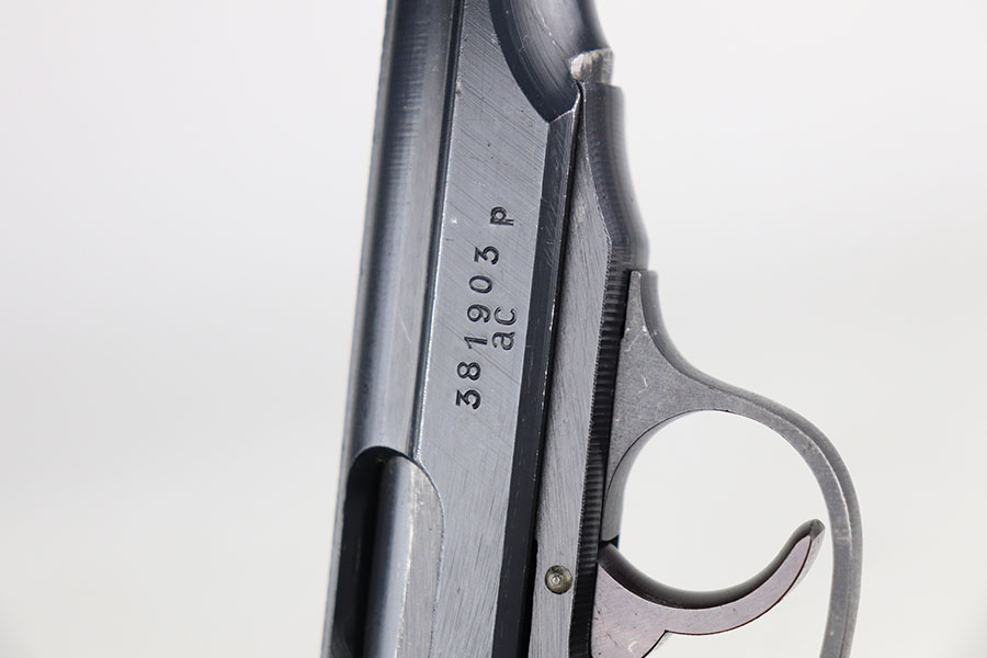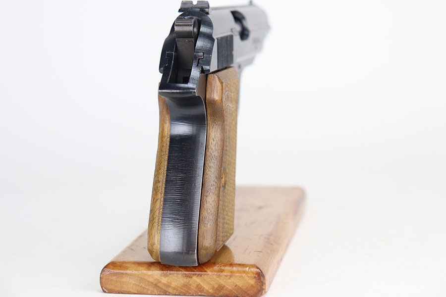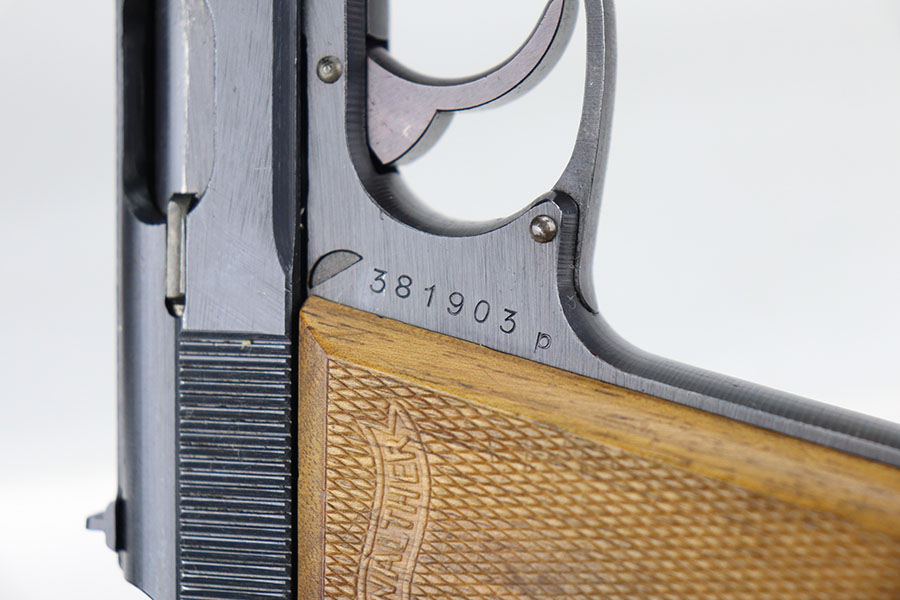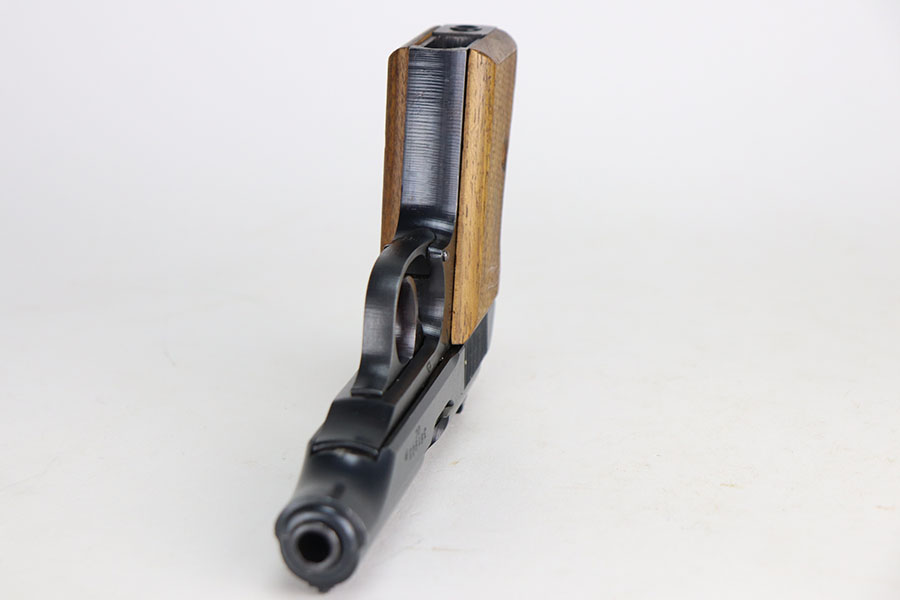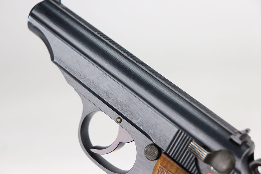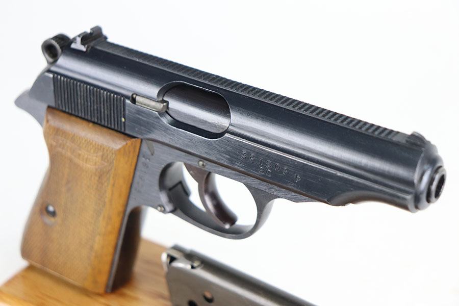 4/22/21 – This is a mint and original Walther PP from 1945. It is so late, in fact, that it has no firing proofs, as well as the blank slide legend. The bluing is original with no wear, but the left side of the slide is freckled throughout. This is more likely a result of casting flaws or end of war parts. The bore is mint and the gun appears unused. Proper late war magazine with ‘W’ on body. Matching serial numbers and late-war wood grips. Hischier collection.