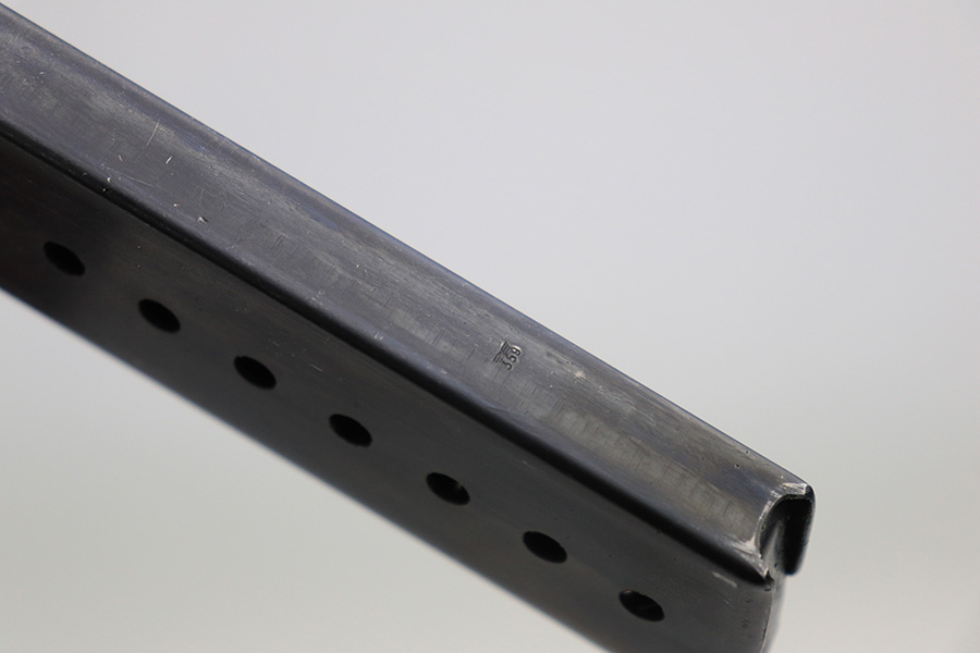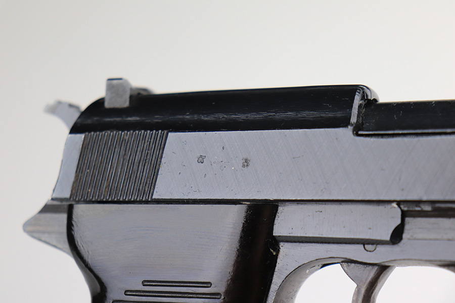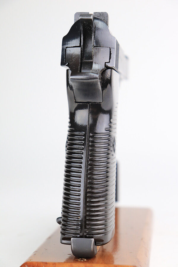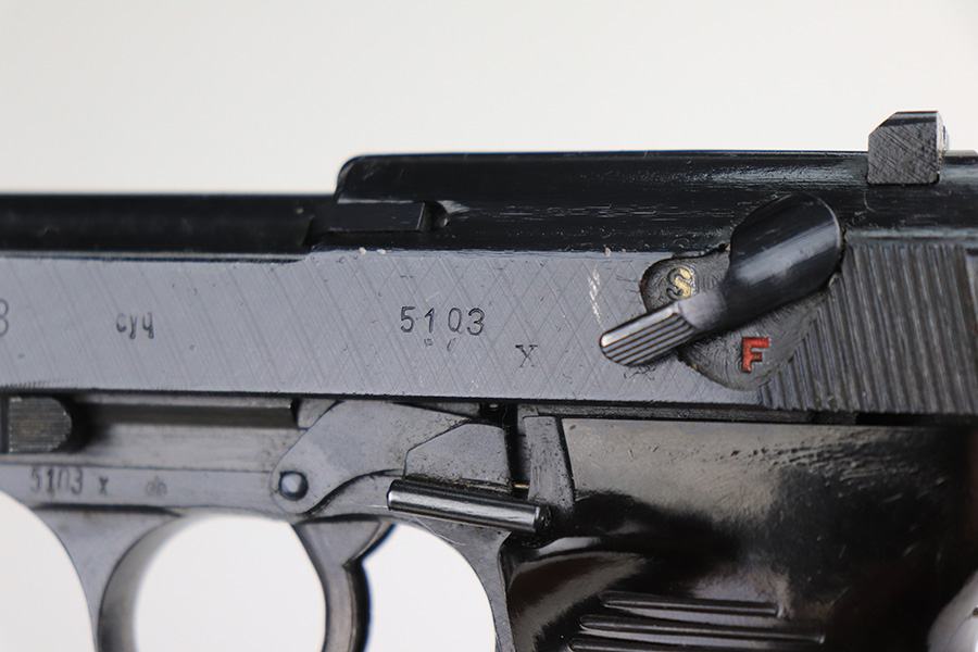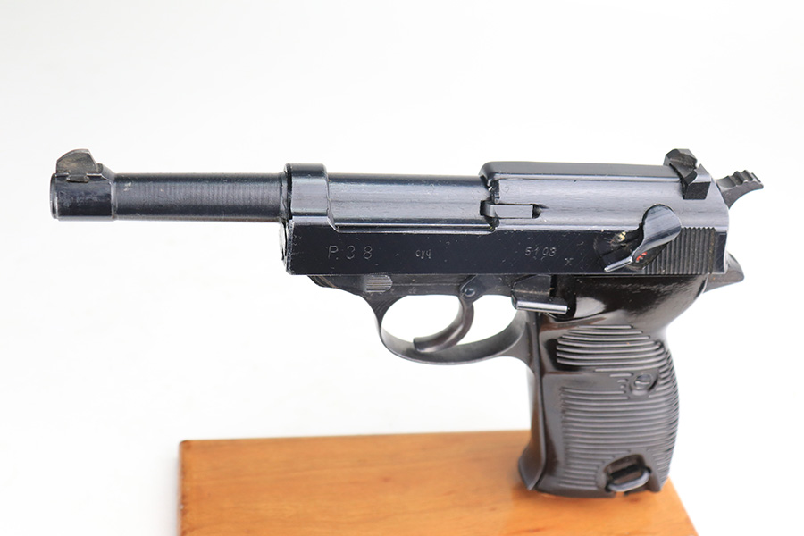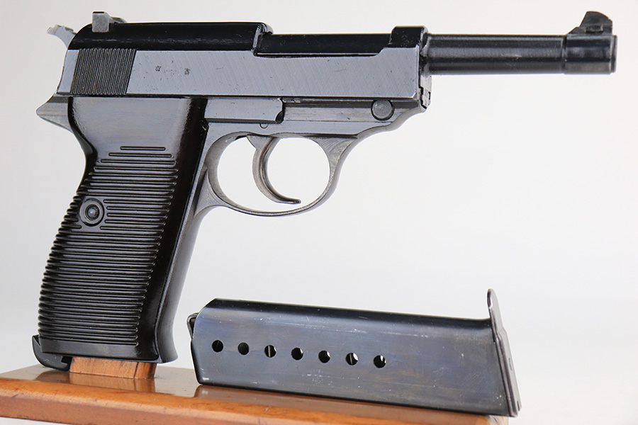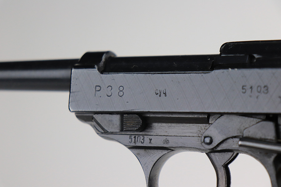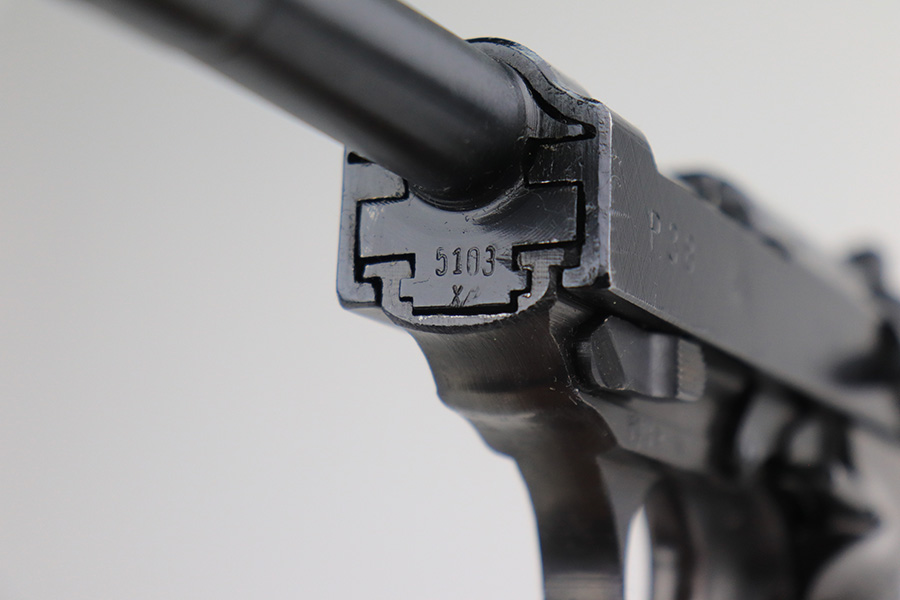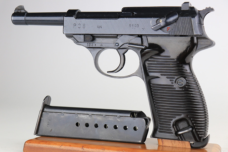 11/8/21 – This is a mint example of a late-war Spreewerk P.38 issued to the Nazi military in December of 1944. The gun is all matching and has the proper “Eagle 88” Nazi military acceptance proofs throughout. The serial number suffix is “X”, this is not a “Russian X”. The gun has retained virtually all of its finish – there are just a few very tiny handling marks here and there and some visible machining marks, typical of these late-war guns. It comes with excellent bakelite grips and a period-correct Walther magazine. Mint bore. De-cocker is functional.