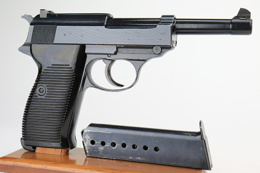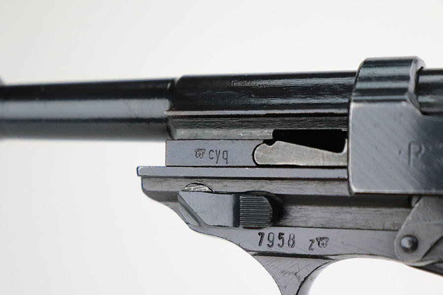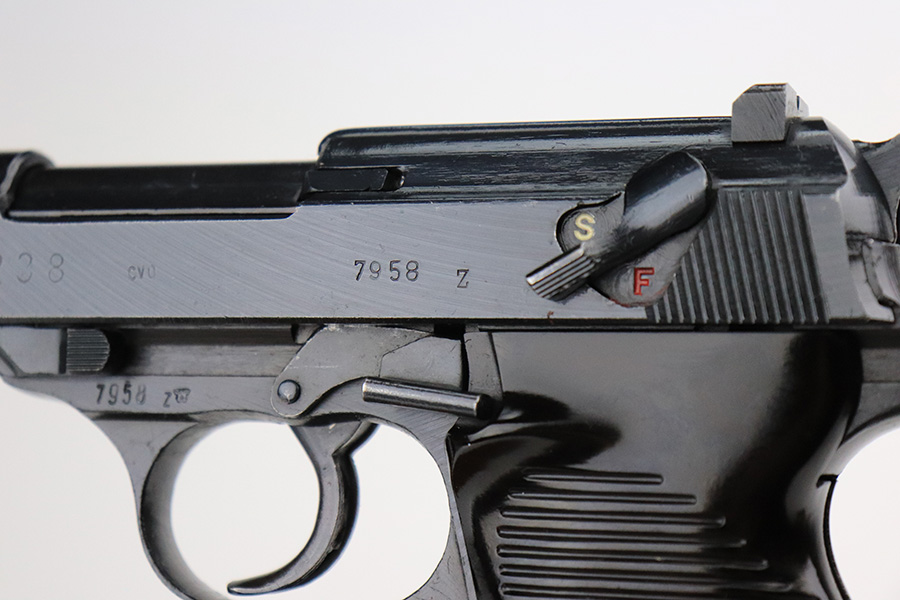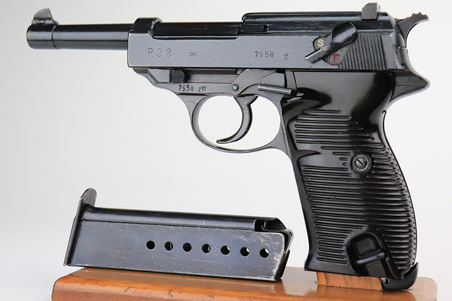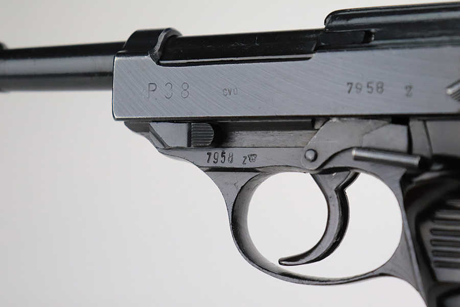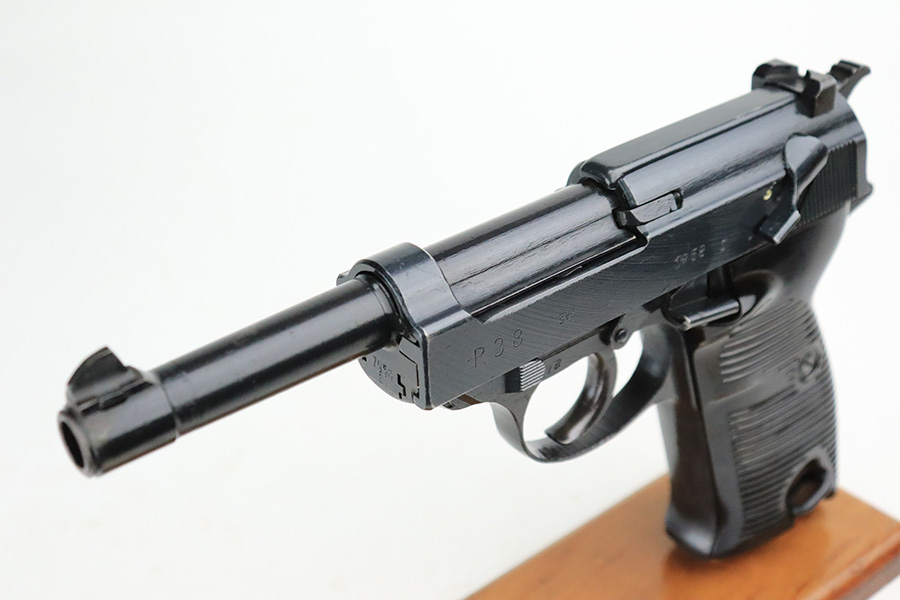 7/20/22 – This is a mint example of a late-war Spreewerk P.38 issued to the Nazi military in January of 1945. It is all matching and has the proper “Eagle 88” military acceptance proofs throughout. It also has the proper late-war cog-style hammer. It has retained virtually all of its bluing with just hints of wear on some of the high edges and a few very light handling marks on the right side of the slide. Comes with excellent bakelite grips and a period-correct jvd magazine. Mint bore. De-cocker is functional.
