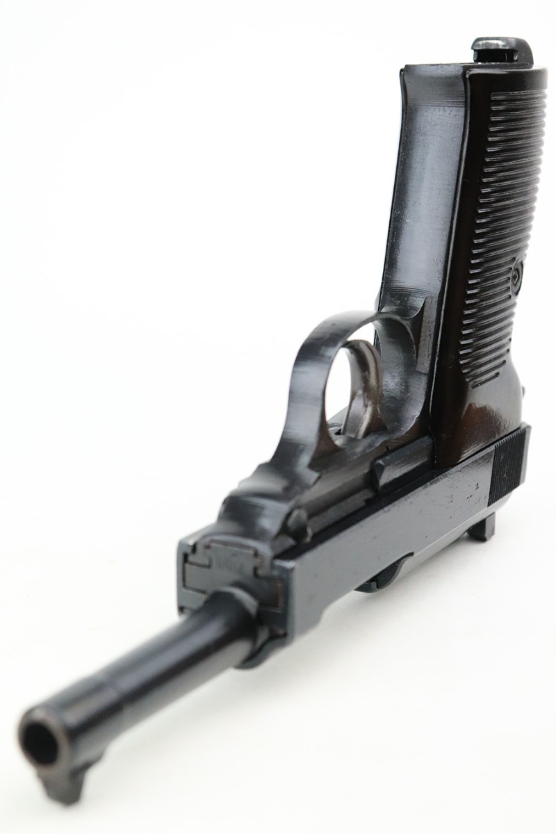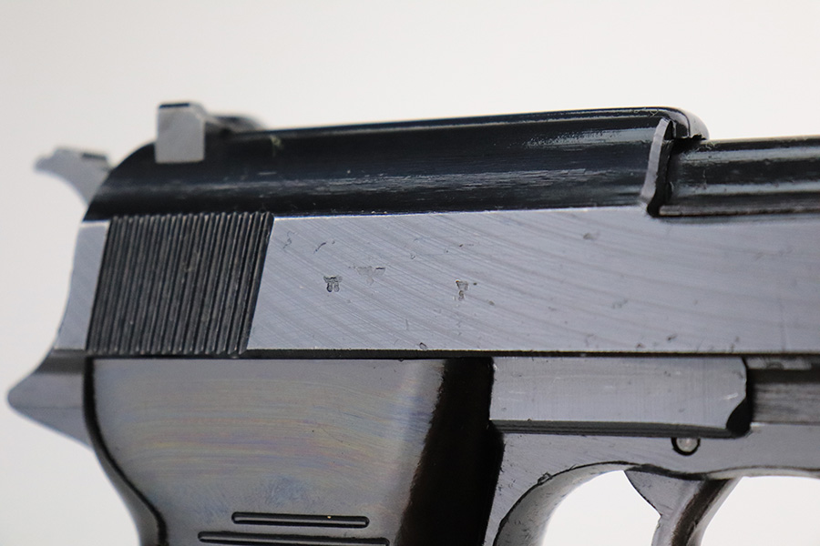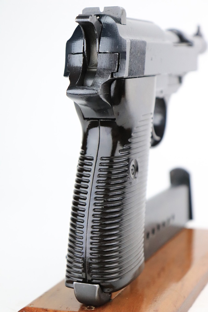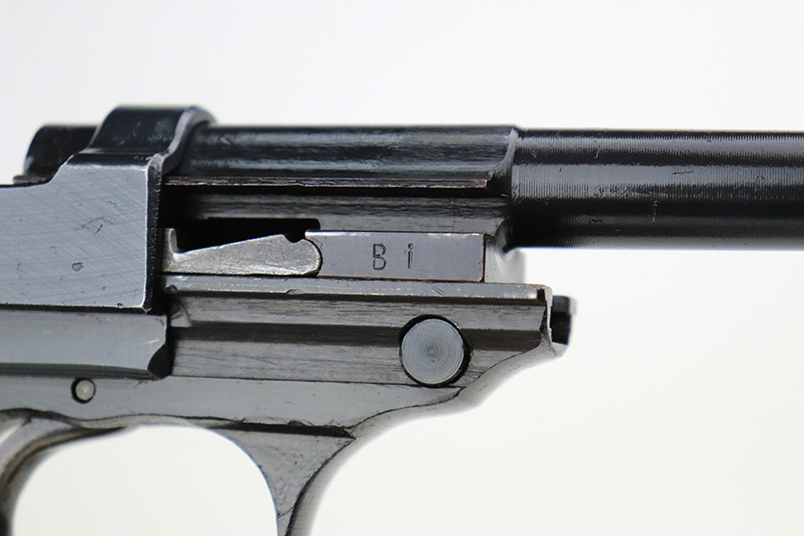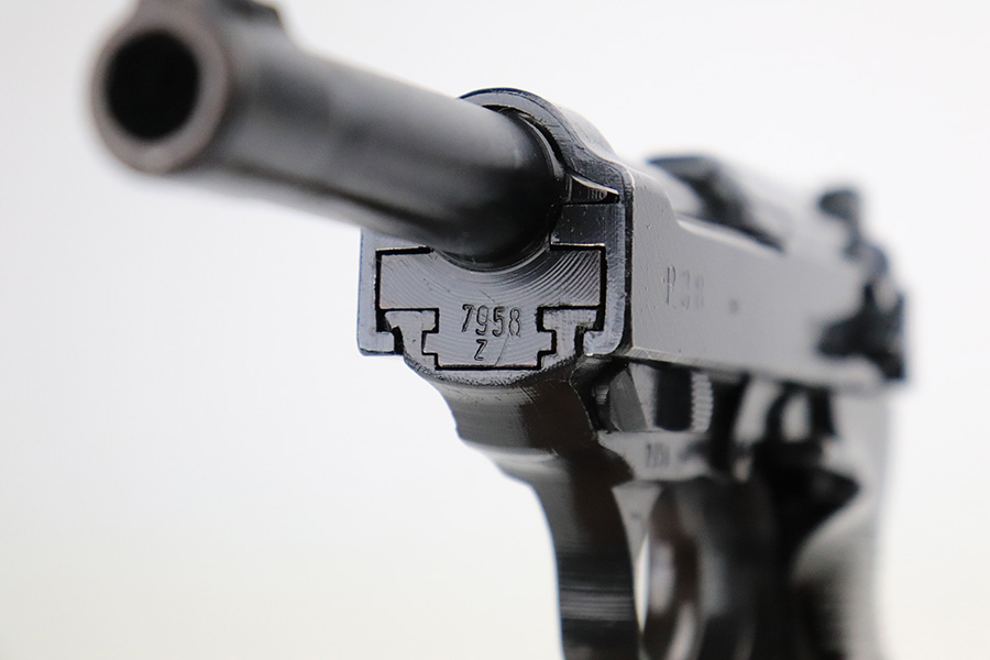 7/20/22 – This is a mint example of a late-war Spreewerk P.38 issued to the Nazi military in January of 1945. It is all matching and has the proper “Eagle 88” military acceptance proofs throughout. It also has the proper late-war cog-style hammer. It has retained virtually all of its bluing with just hints of wear on some of the high edges and a few very light handling marks on the right side of the slide. Comes with excellent bakelite grips and a period-correct jvd magazine. Mint bore. De-cocker is functional.
