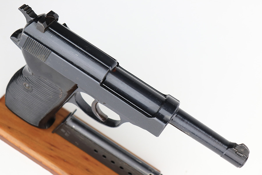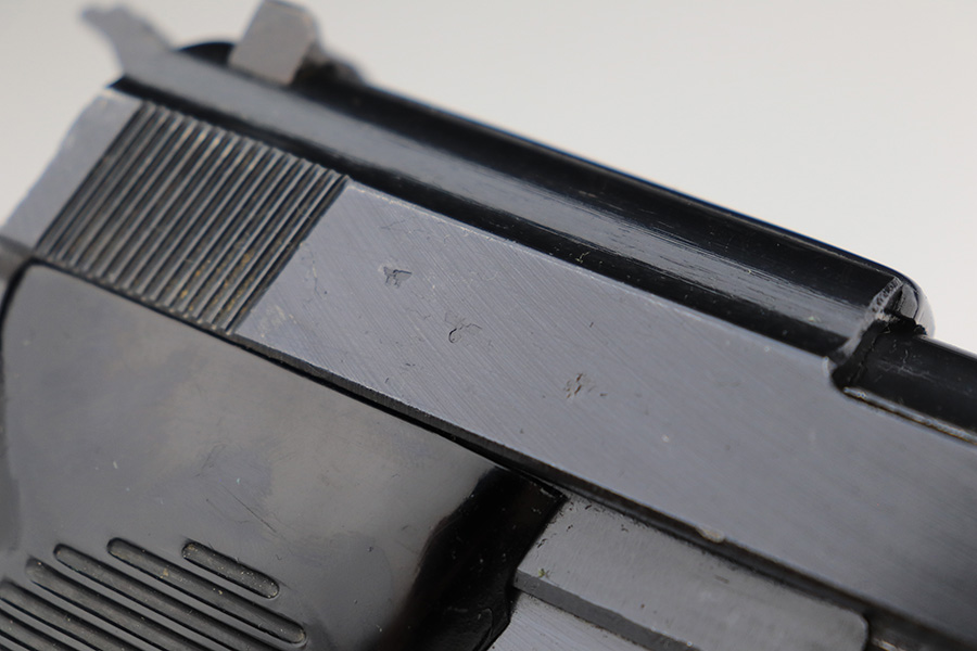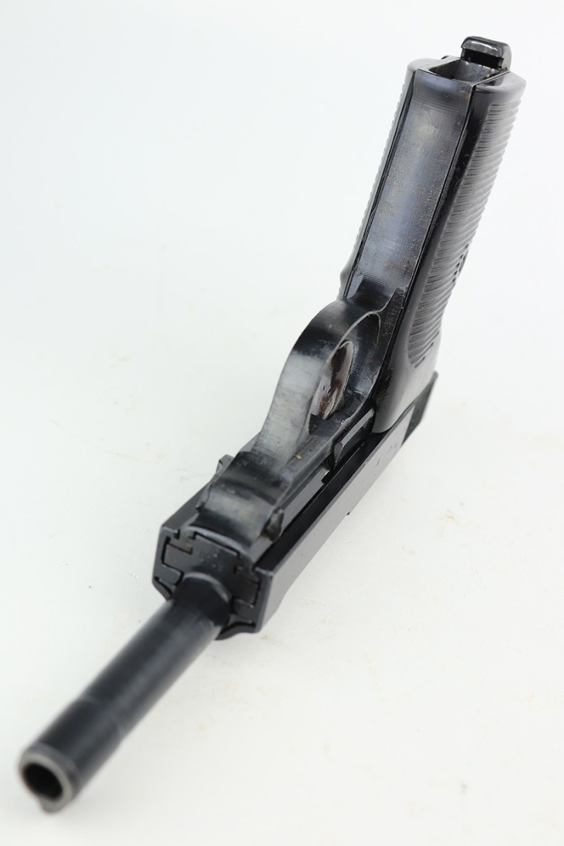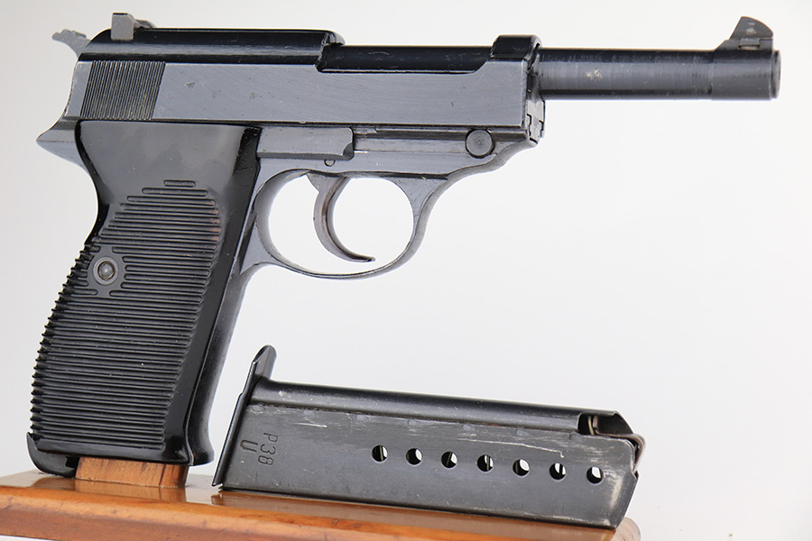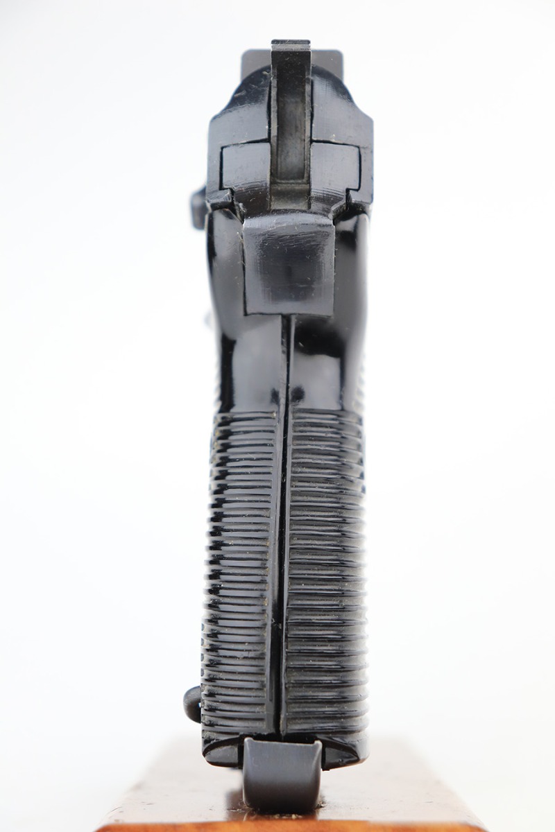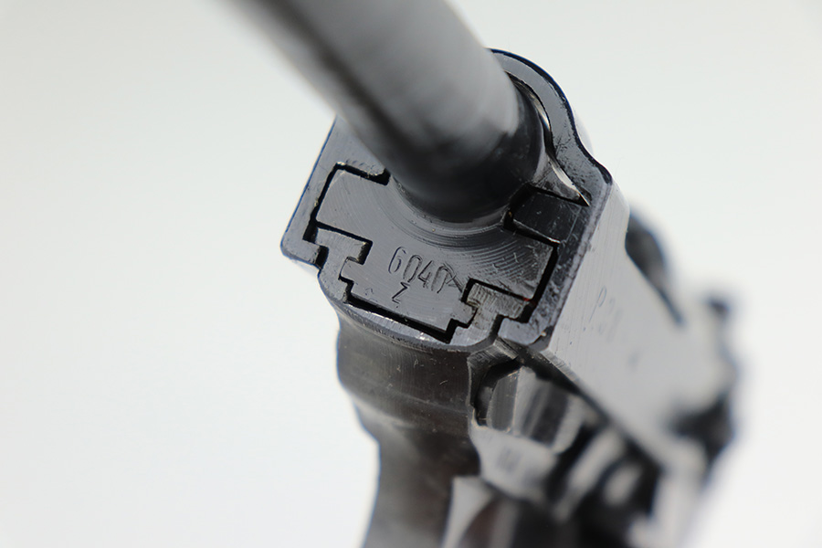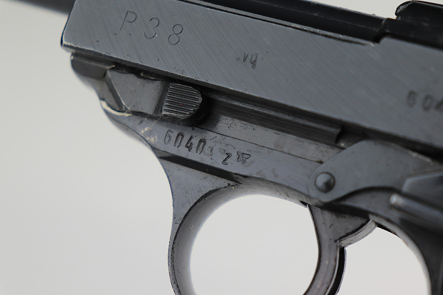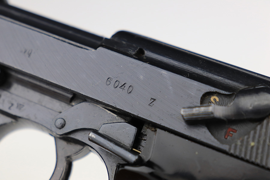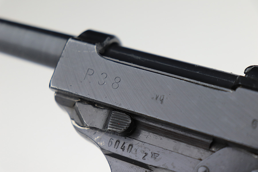 3/23/23 – This is a mint example of a late-war Spreewerk P.38 issued to the Nazi military in February of 1945. All matching with the proper “Eagle 88” Nazi military acceptance proofs. It has retained essentially all of its finish with no signs of wear. There are casting flaws here and there, but this is typical of these late-war Spreewerk pistols. Fitted with excellent black plastic grips. Comes with a rare, late-war “U” marked magazine. Bore is like-new. De-cocker is functional.