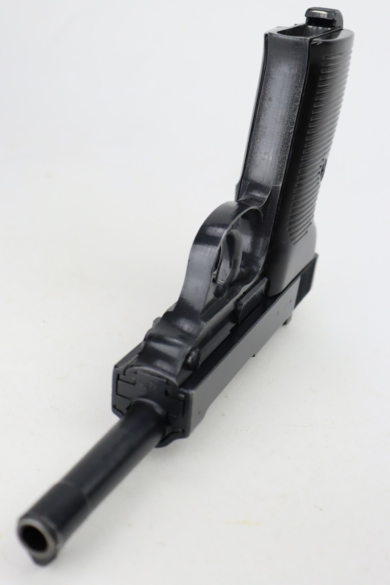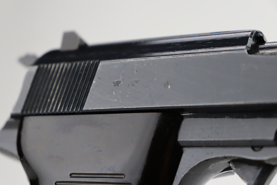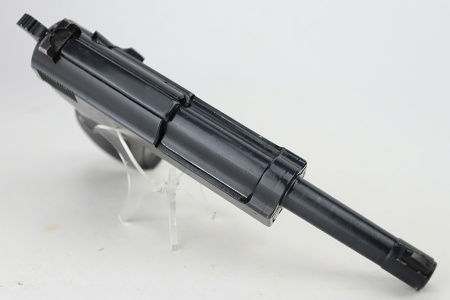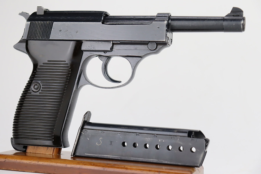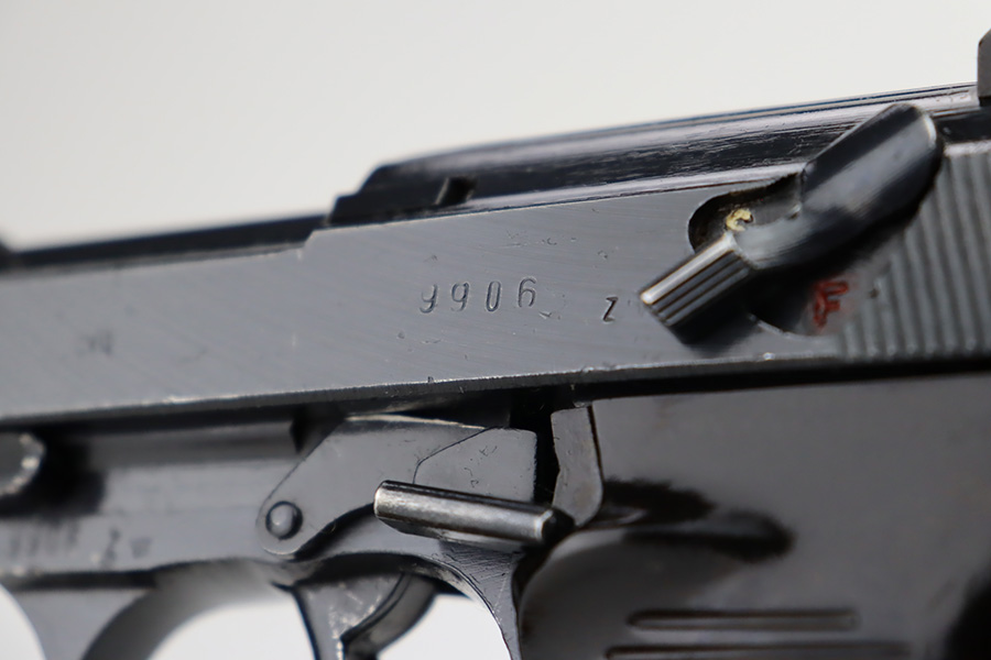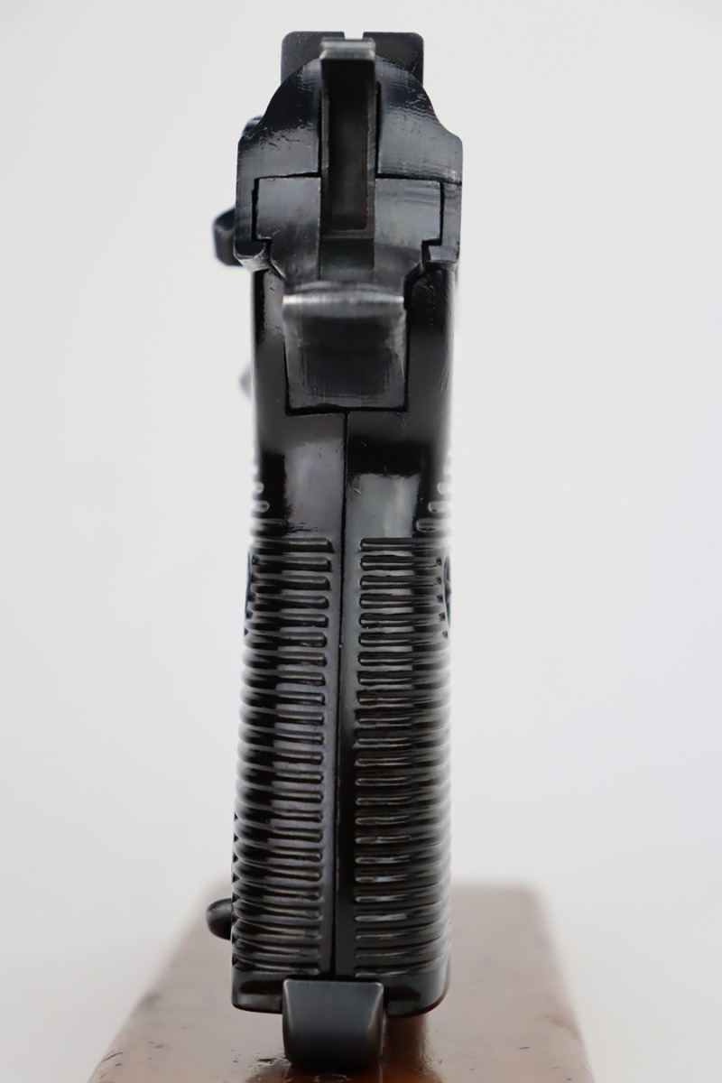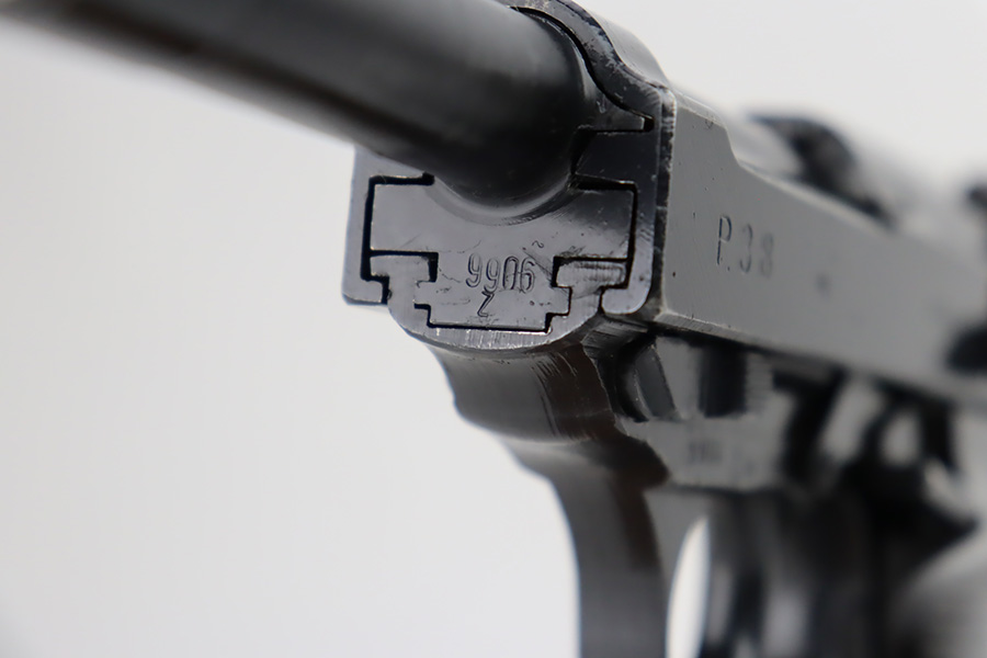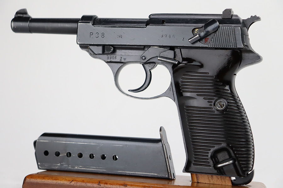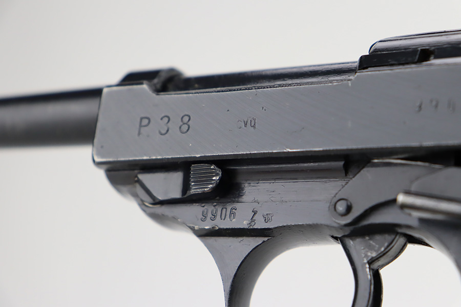 10/12/23 – This is a mint Spreewerk P.38 issued to the Nazi military in February of 1945. All matching with the proper “Eagle 88” military proofs. The gun has retained nearly all of its late-war finish with just hints of wear around the muzzle and on the front edges of the slide. Fitted with period-correct blackish-brown bakelite grips and comes with a jvd magazine. Mint bore. De-cocker is functional. The hold-open does not work properly with this magazine.