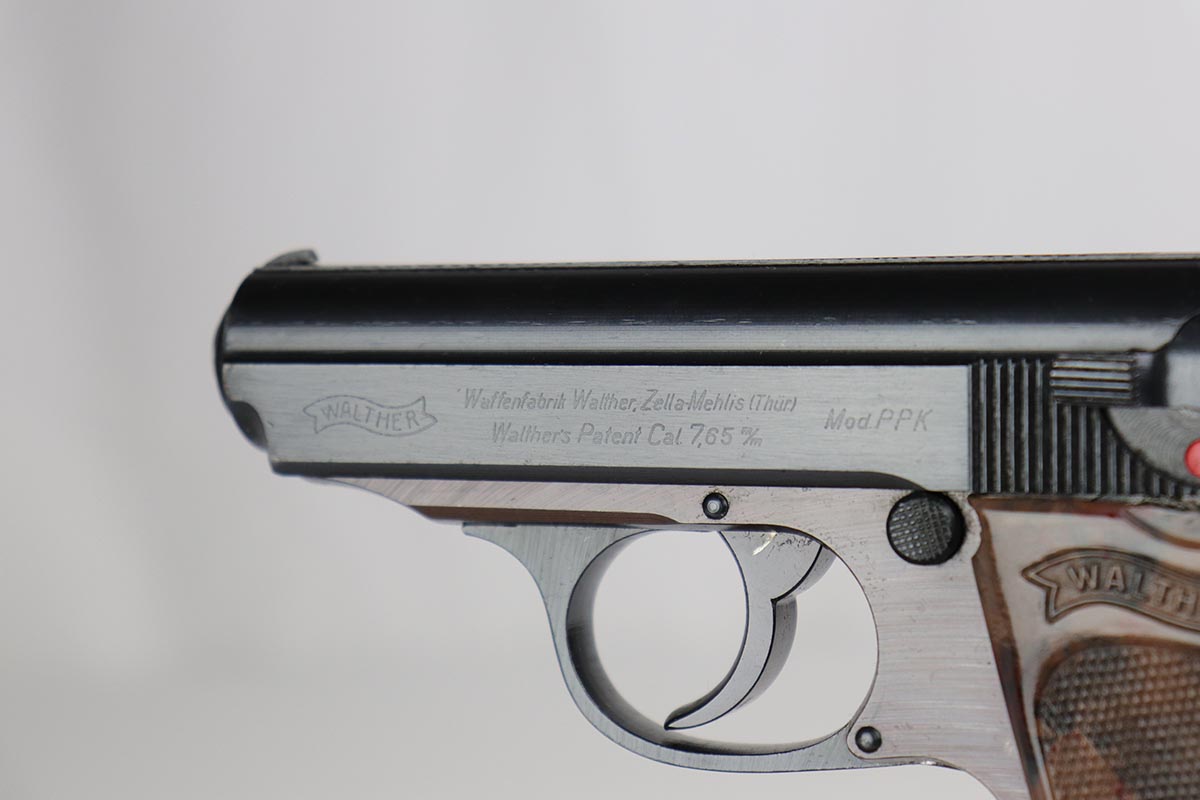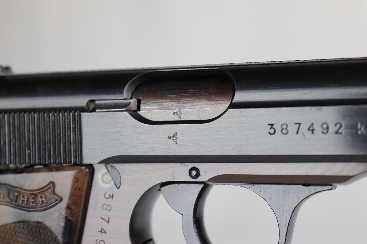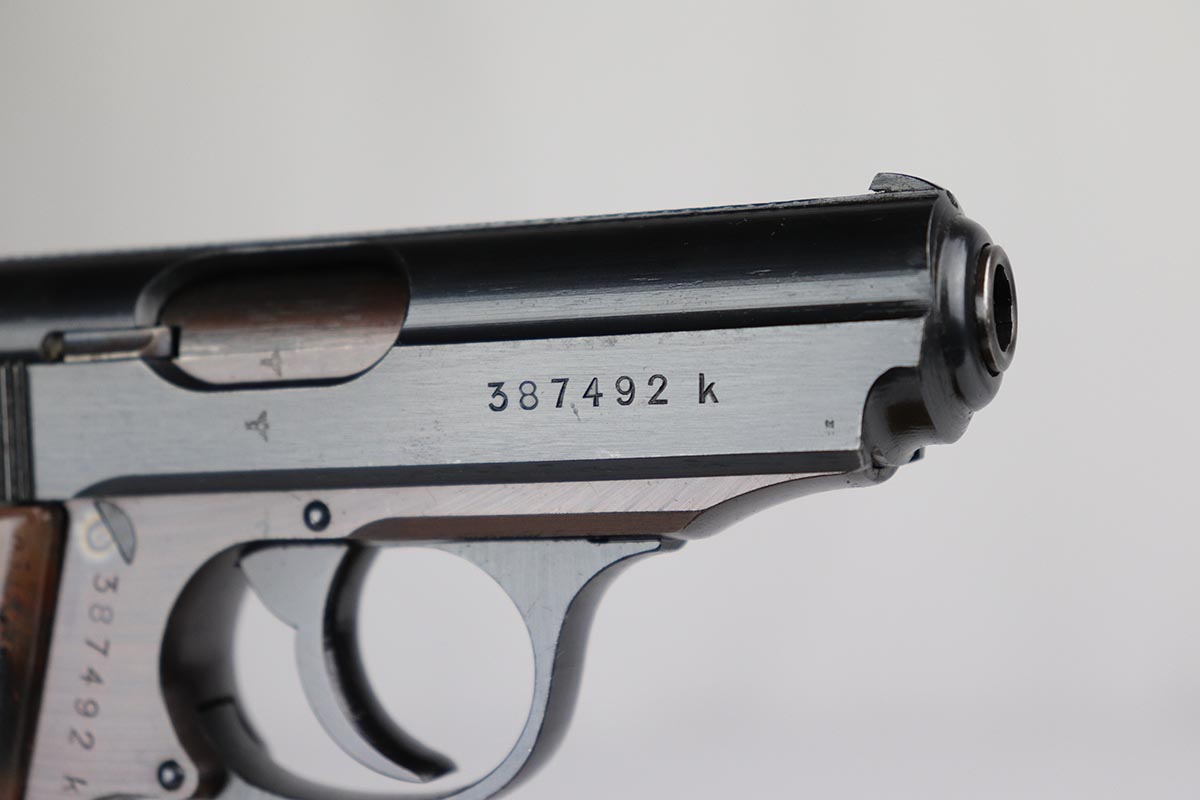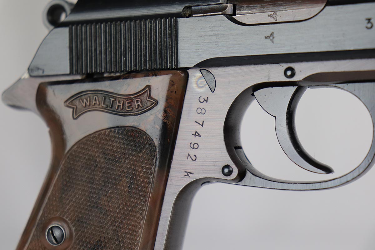 3/5/18 – This is a stone mint, late-war Walther PPK with uncommon gray grips and plum frame. The gun is pretty much unfired and appears unissued. Crisp markings. Gray late-war grips with no defects. Beautiful bore. All matching. Impossible to upgrade.