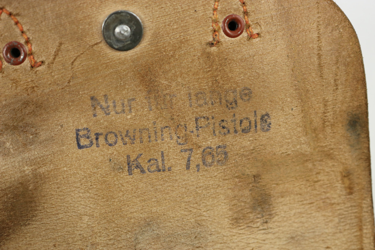 9/27/18 – This is an original late WW2 production FN model 1922 holster in near mint condition. The interior of the holster is ink stamped indicating that this is for Browning 7.65mm pistols. The holster is late WW2 production, indicated by the ersatz & leather construction, which makes this a very unique and interesting piece on top of being excellent. The lid is leather as are the dropping straps, and the lid is luftwaffe stamped on the front. The body of the holster and belt loop are ersatz – with a HK maker stamp on the belt loop. All original stitching is excellent and in tact.