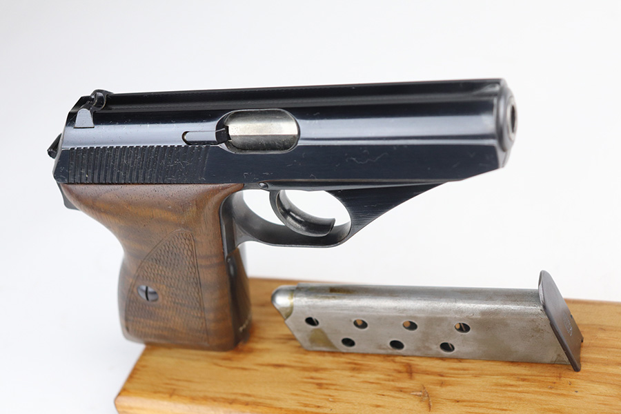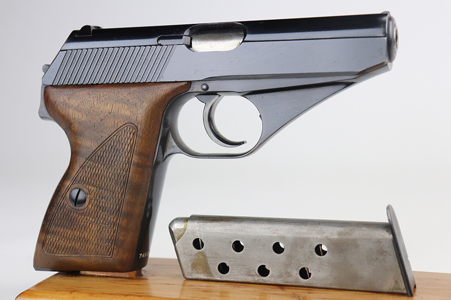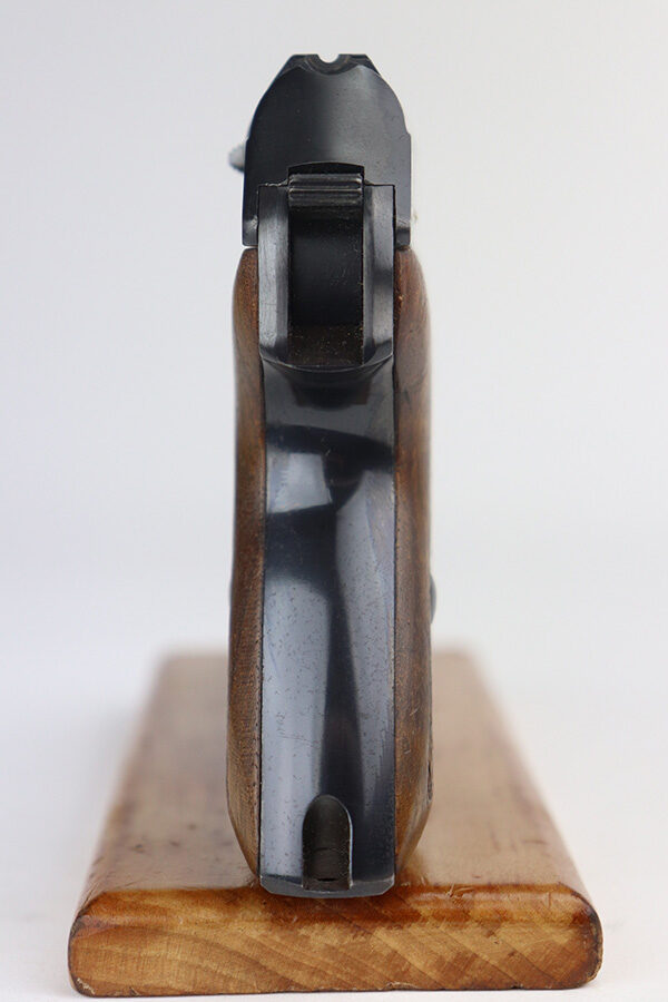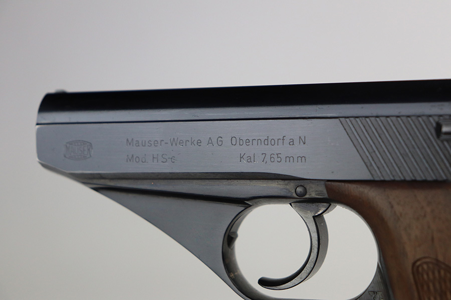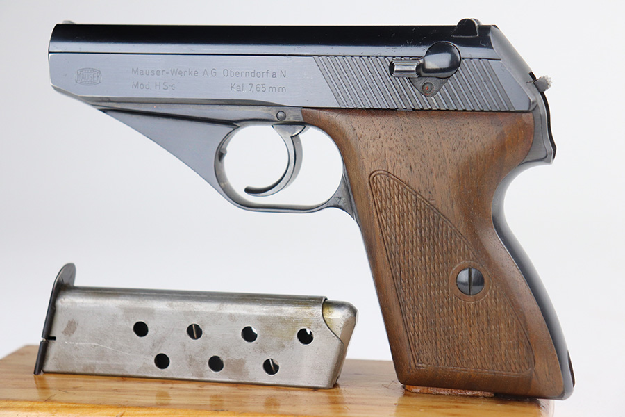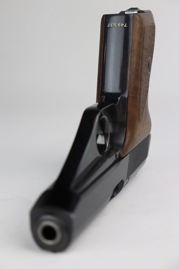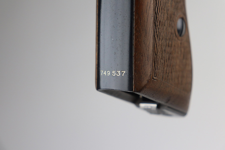 6/23/21 – This is a mint example of a Mauser HSC issued to the Nazi police force in early 1942. The gun is all matching and has the proper police “Eagle L” proof on the trigger guard. It is in mint condition, retaining about 99% of its bluing. There is just a hint of wear around the muzzle and tiny freckling on the straps. Comes with excellent wood grips and a period-correct magazine. Stone-mint bore.