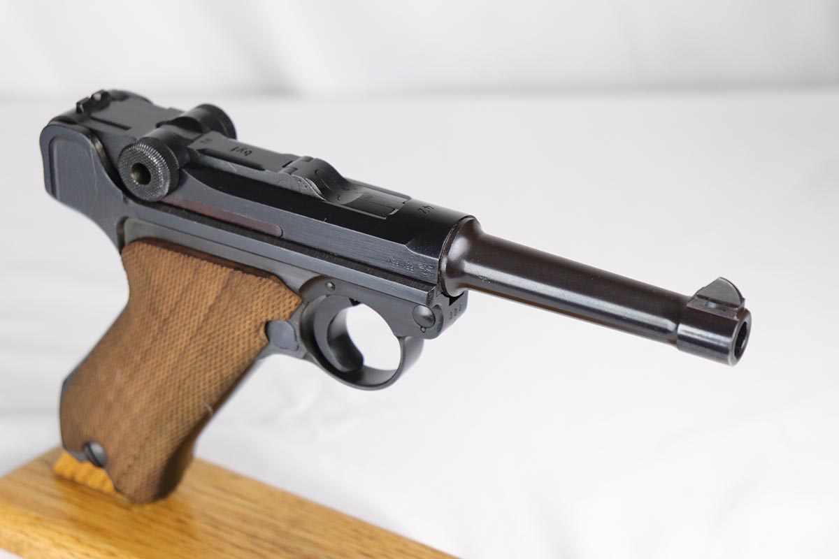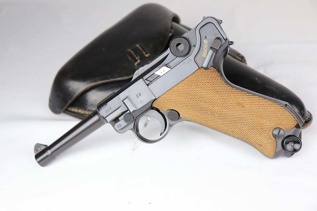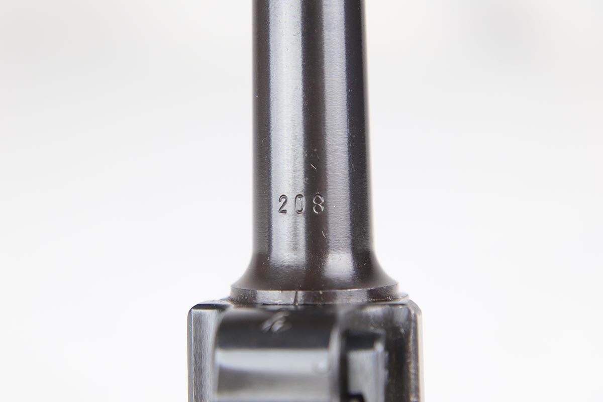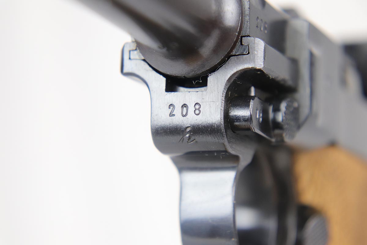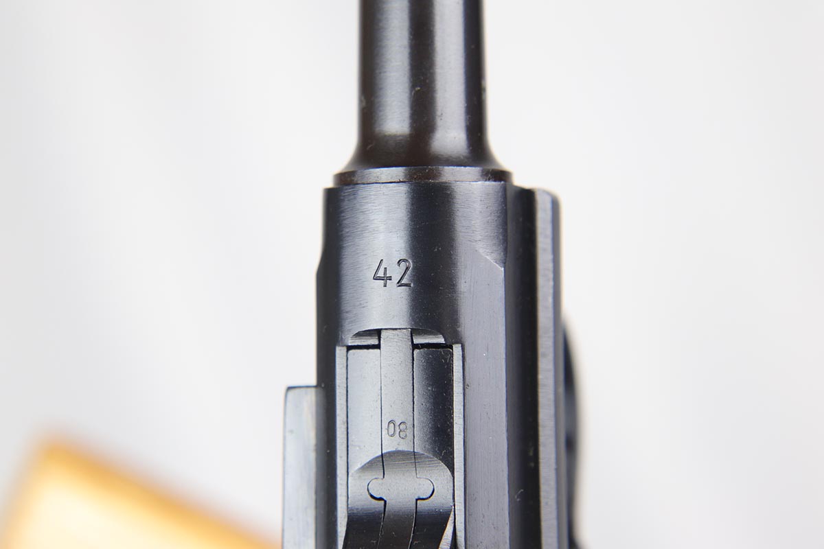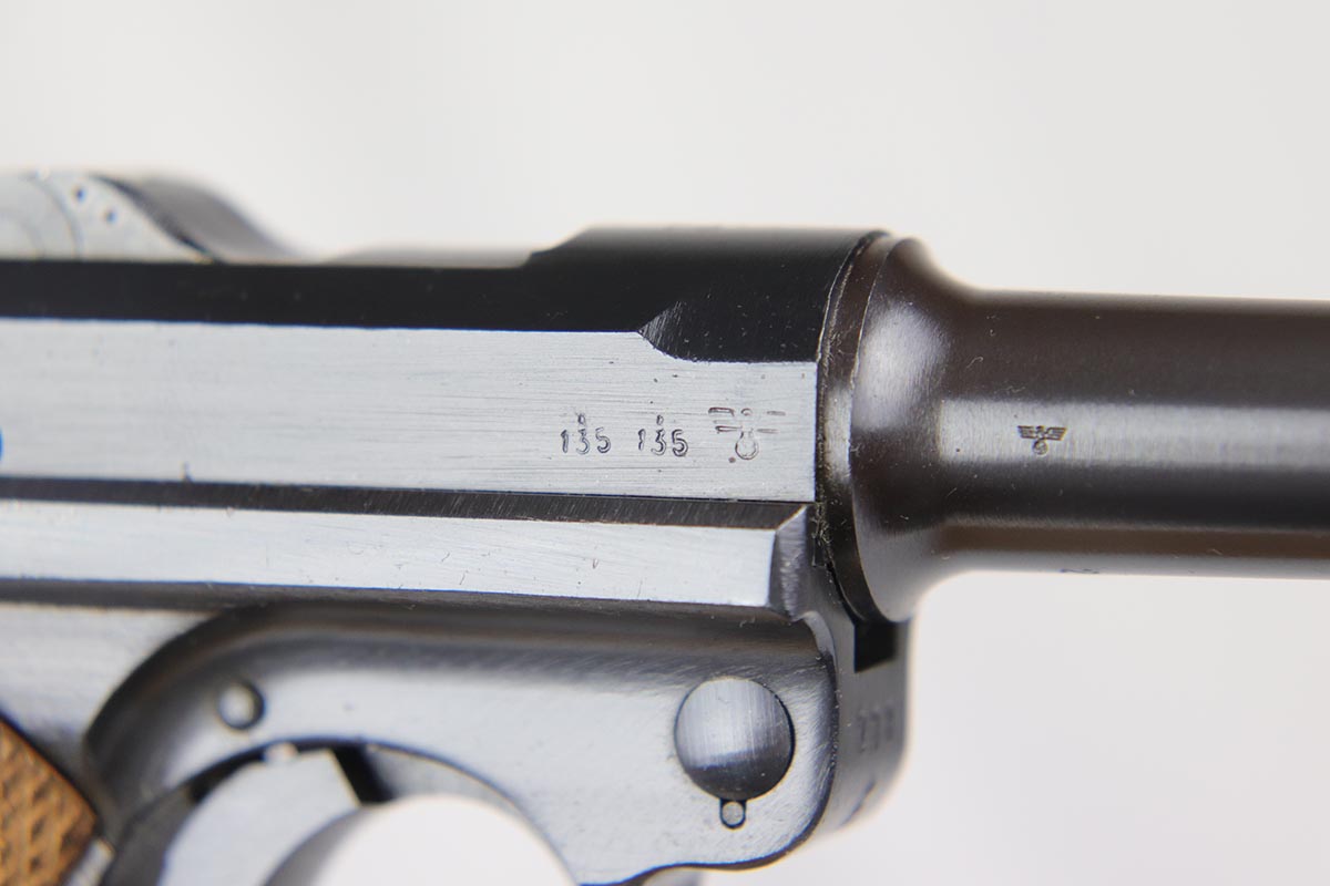 3/19/18 – This is one of the best conditioned byf 42 coded Mauser lugers that we have come across in years. An absolutely beautiful Nazi mid-war gun, that retains over 99% of its original finish with just a couple of miniscule discoloration spots on the left side of the side plate and otherwise appears unfired with no holster wear evident anywhere else. It is a low serial number, all matching, including mint grips and has a mint bore as well. It comes with an original bakelite bottom Eagle/37 coded magazine, original loading tool and a superb 1942 coded and waffenamted black holster.