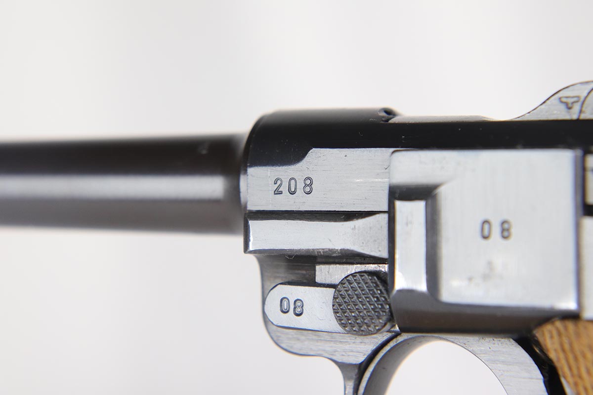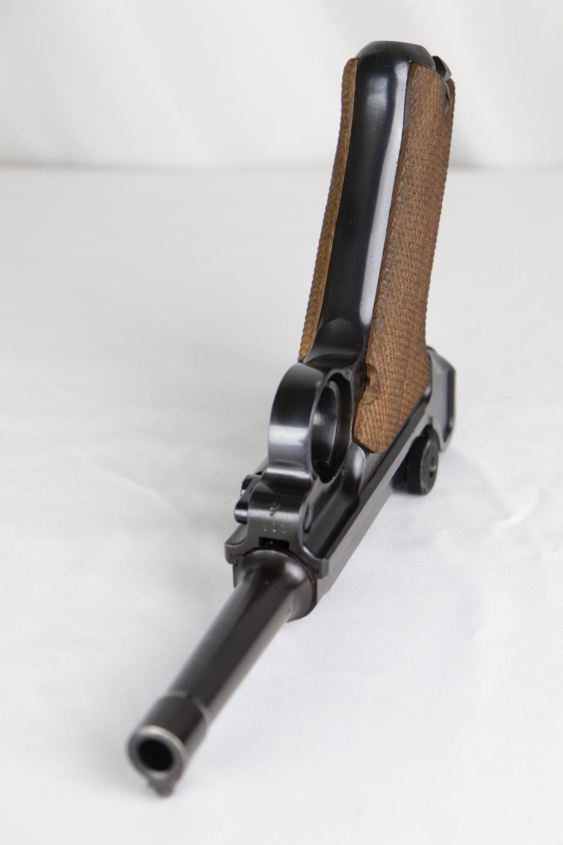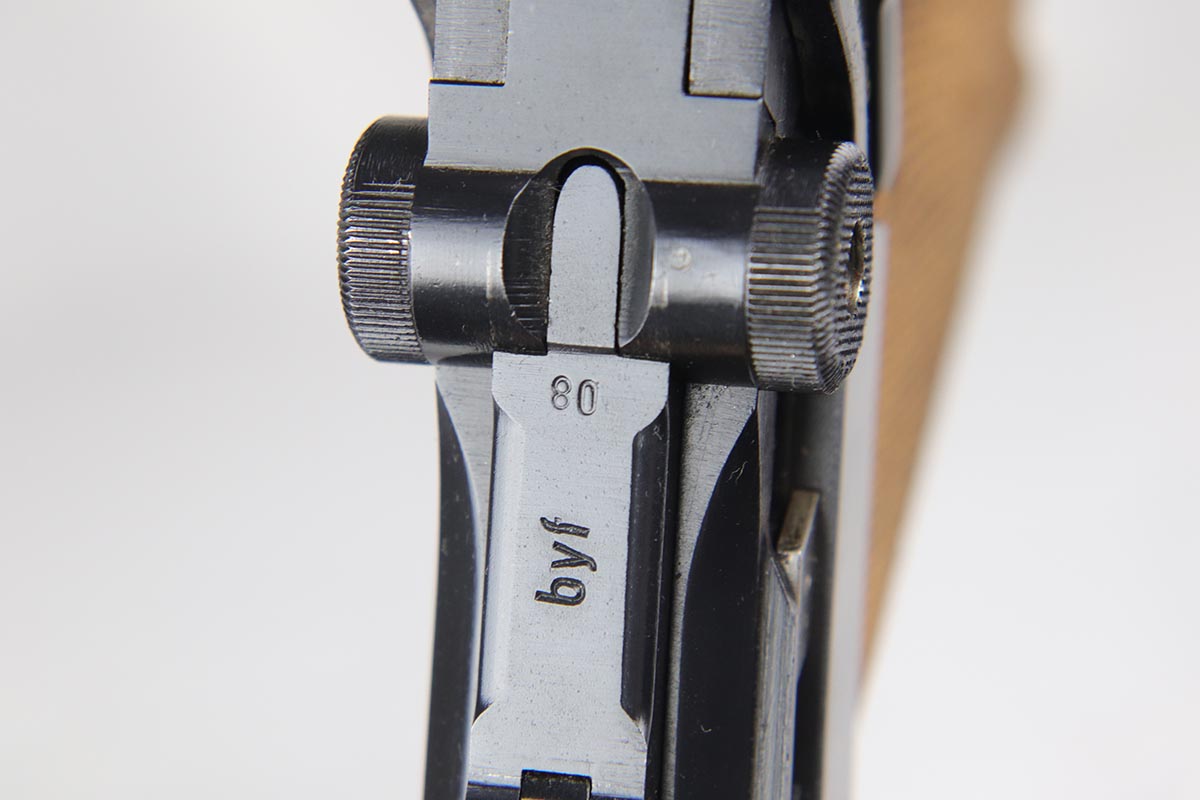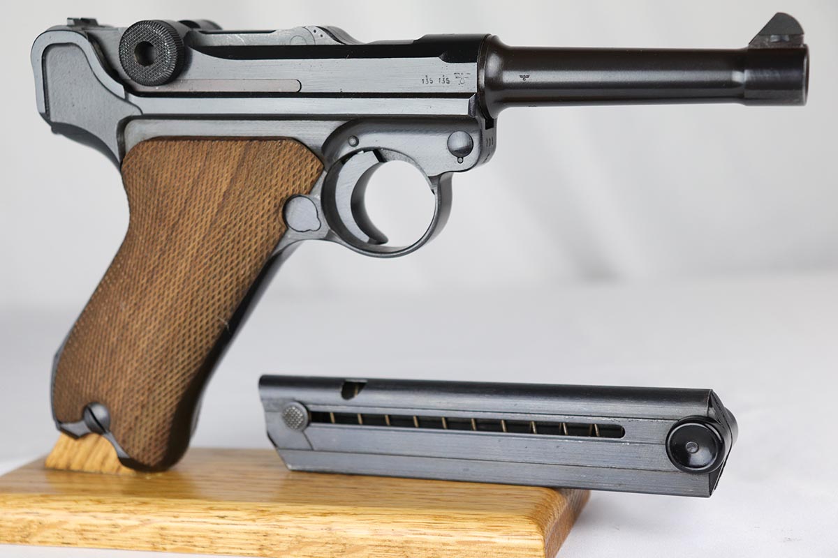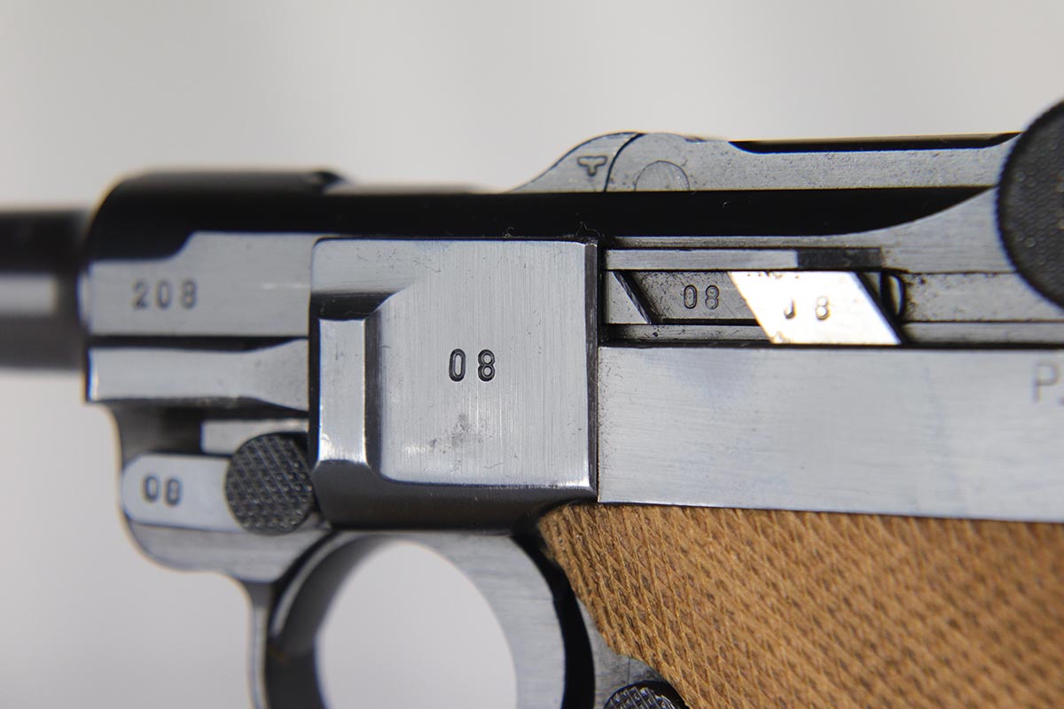 3/19/18 – This is one of the best conditioned byf 42 coded Mauser lugers that we have come across in years. An absolutely beautiful Nazi mid-war gun, that retains over 99% of its original finish with just a couple of miniscule discoloration spots on the left side of the side plate and otherwise appears unfired with no holster wear evident anywhere else. It is a low serial number, all matching, including mint grips and has a mint bore as well. It comes with an original bakelite bottom Eagle/37 coded magazine, original loading tool and a superb 1942 coded and waffenamted black holster.