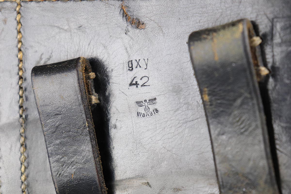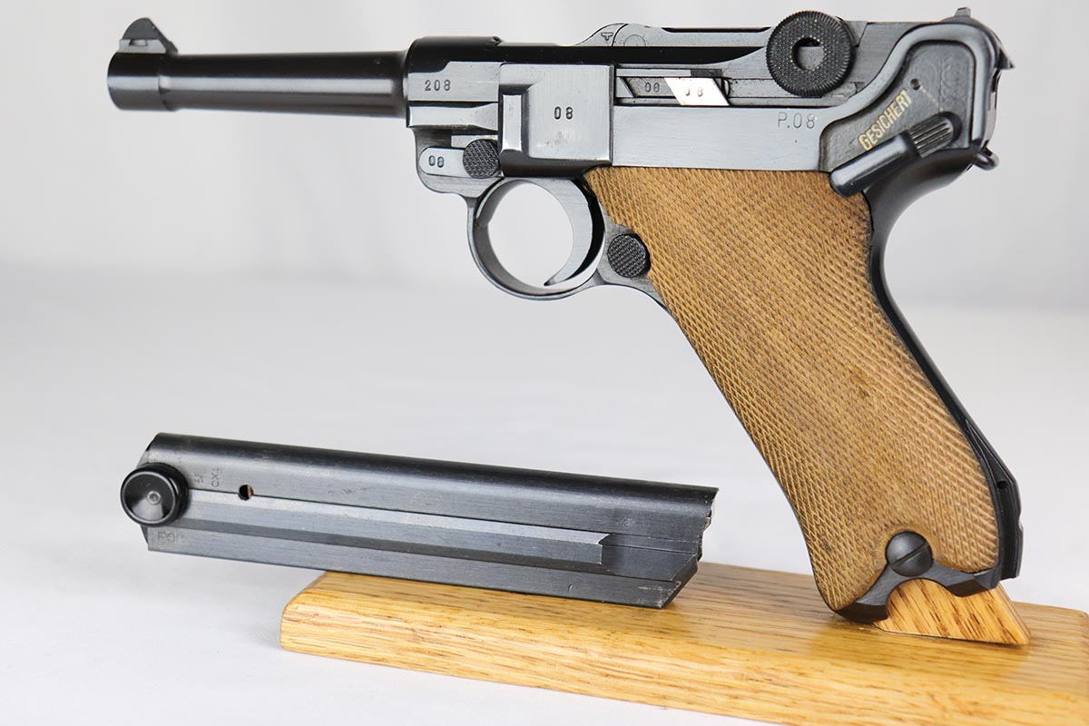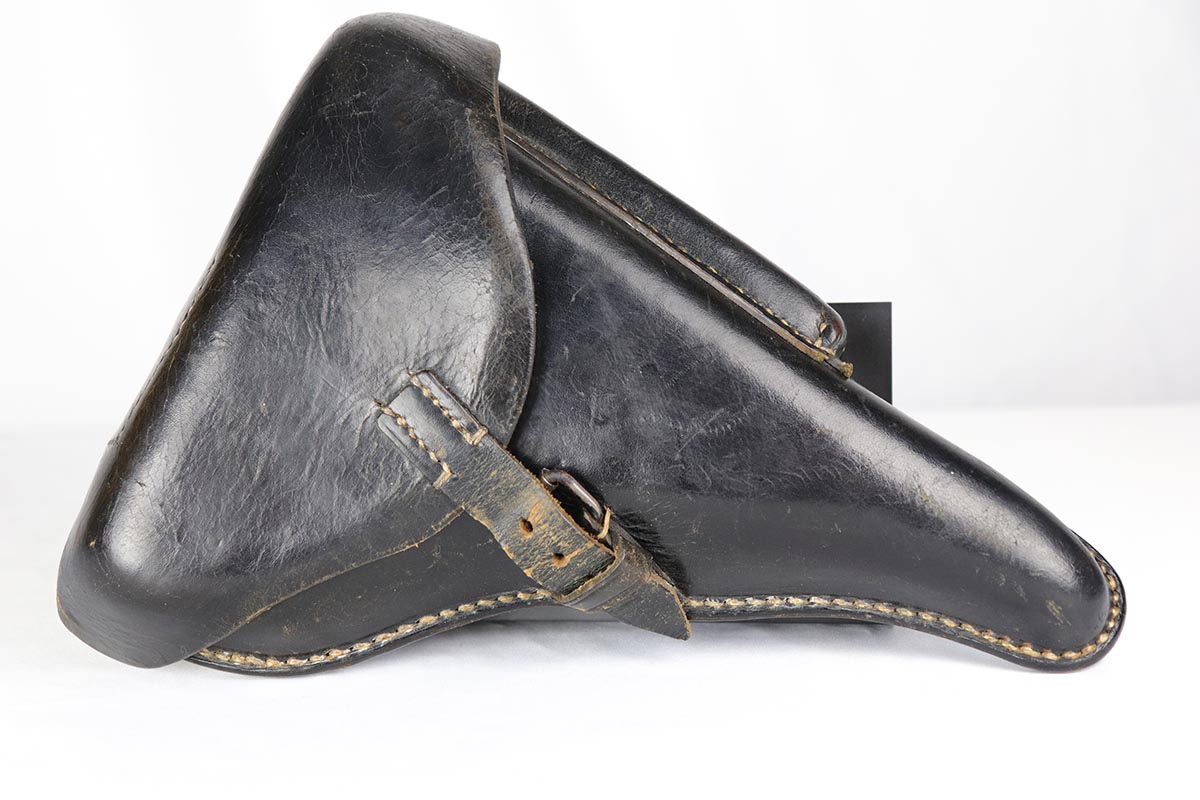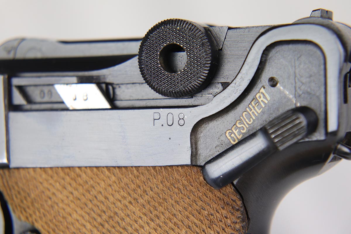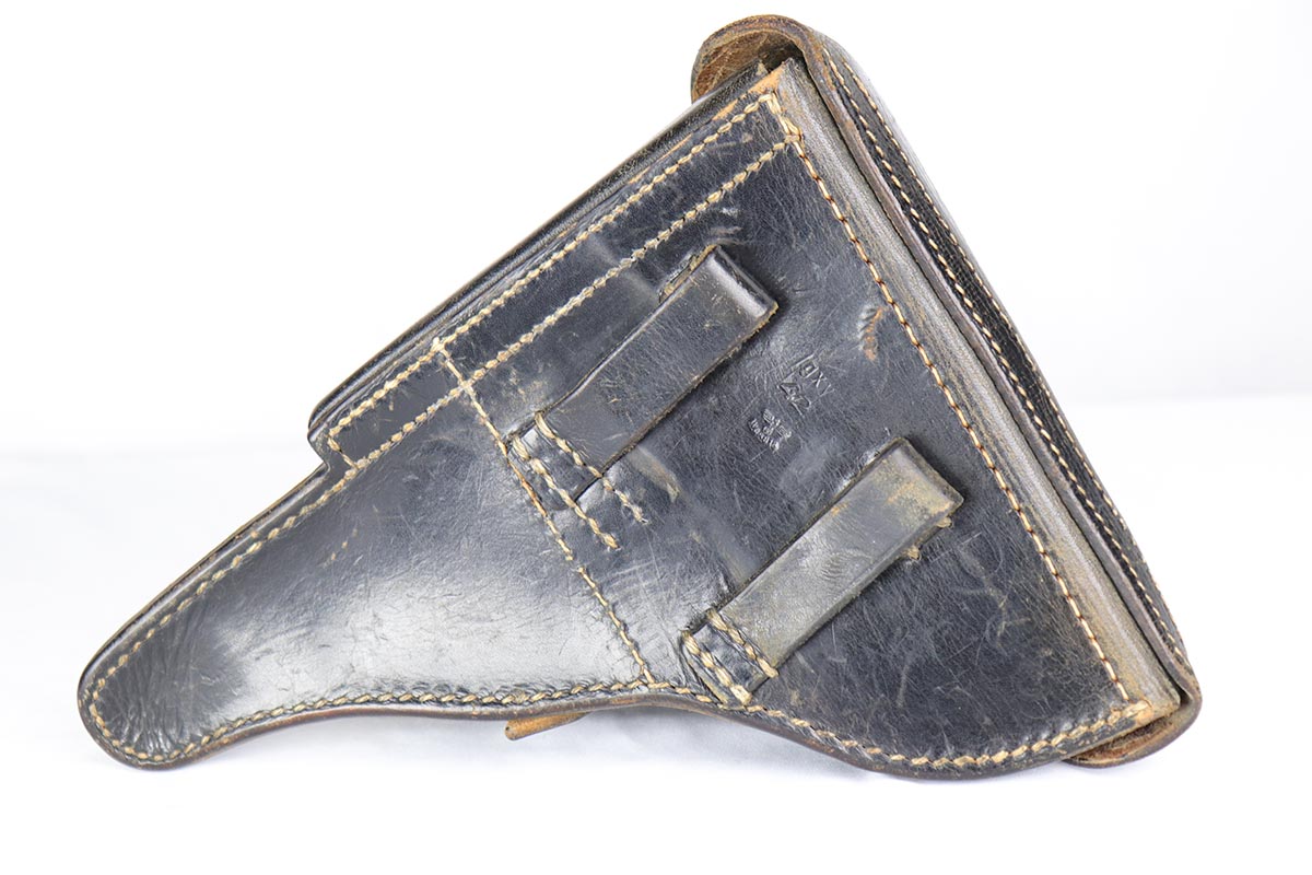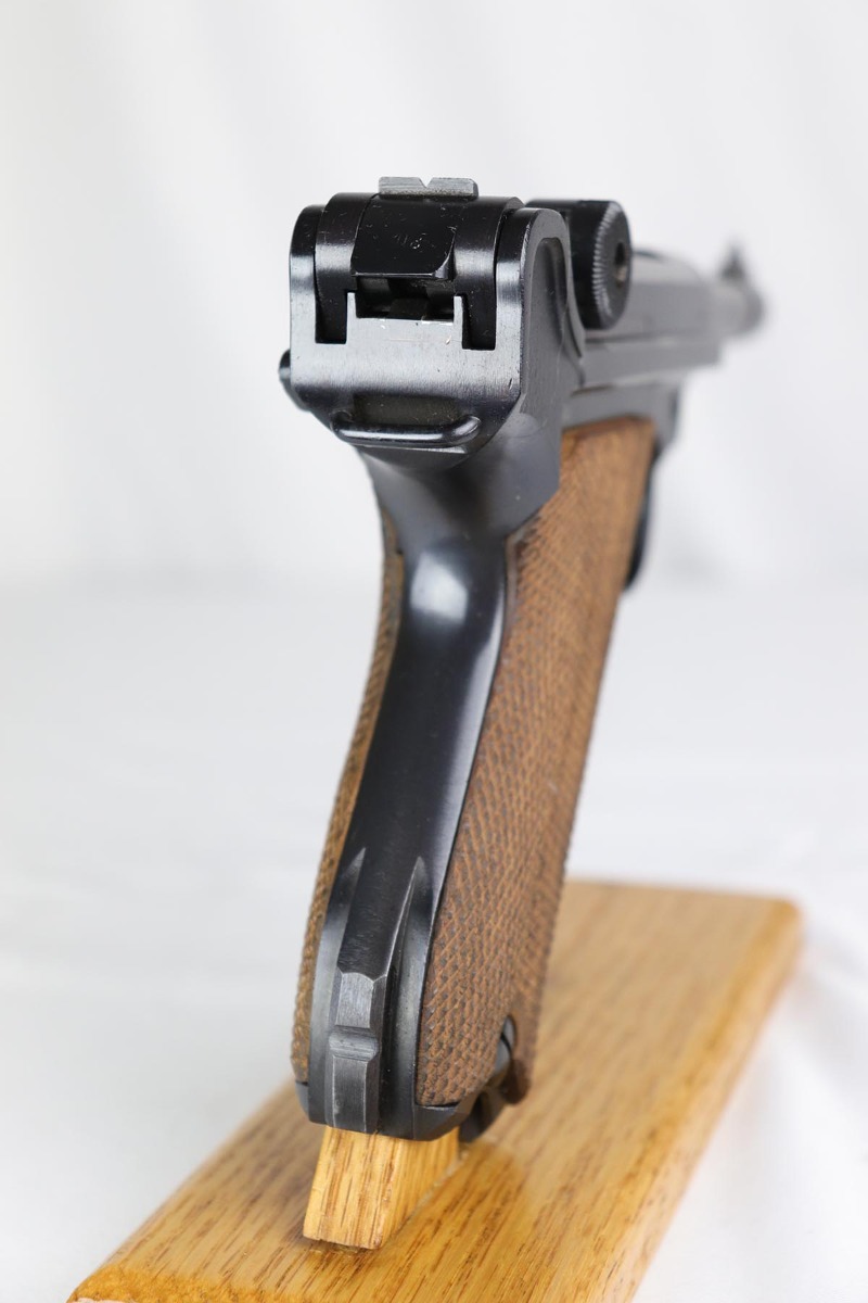 3/19/18 – This is one of the best conditioned byf 42 coded Mauser lugers that we have come across in years. An absolutely beautiful Nazi mid-war gun, that retains over 99% of its original finish with just a couple of miniscule discoloration spots on the left side of the side plate and otherwise appears unfired with no holster wear evident anywhere else. It is a low serial number, all matching, including mint grips and has a mint bore as well. It comes with an original bakelite bottom Eagle/37 coded magazine, original loading tool and a superb 1942 coded and waffenamted black holster.