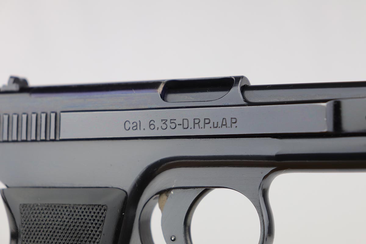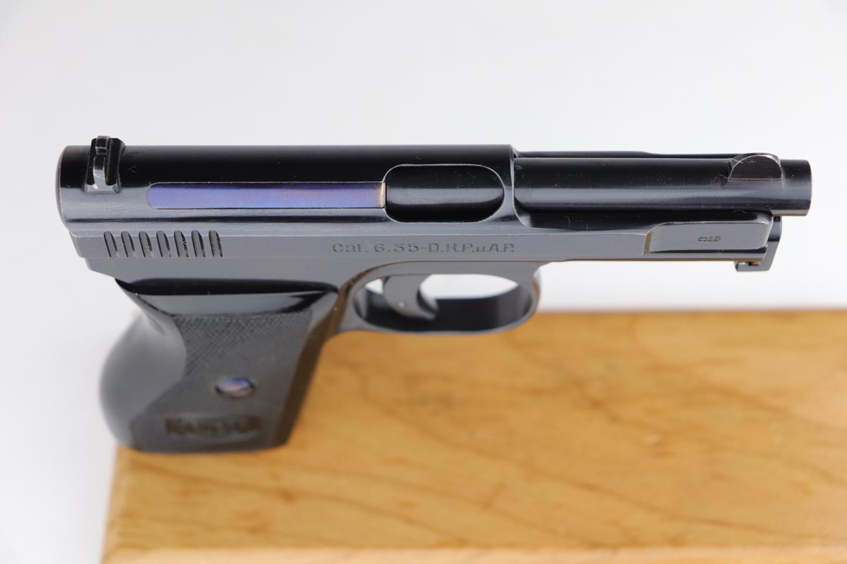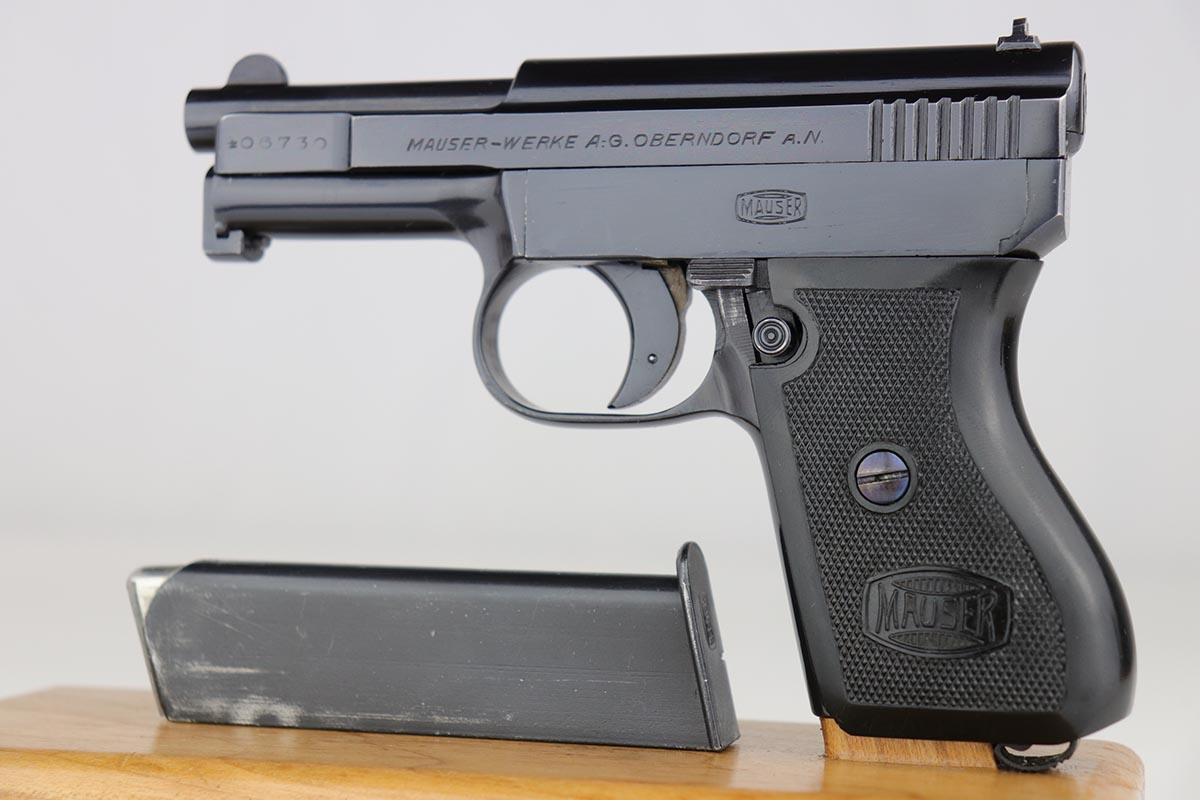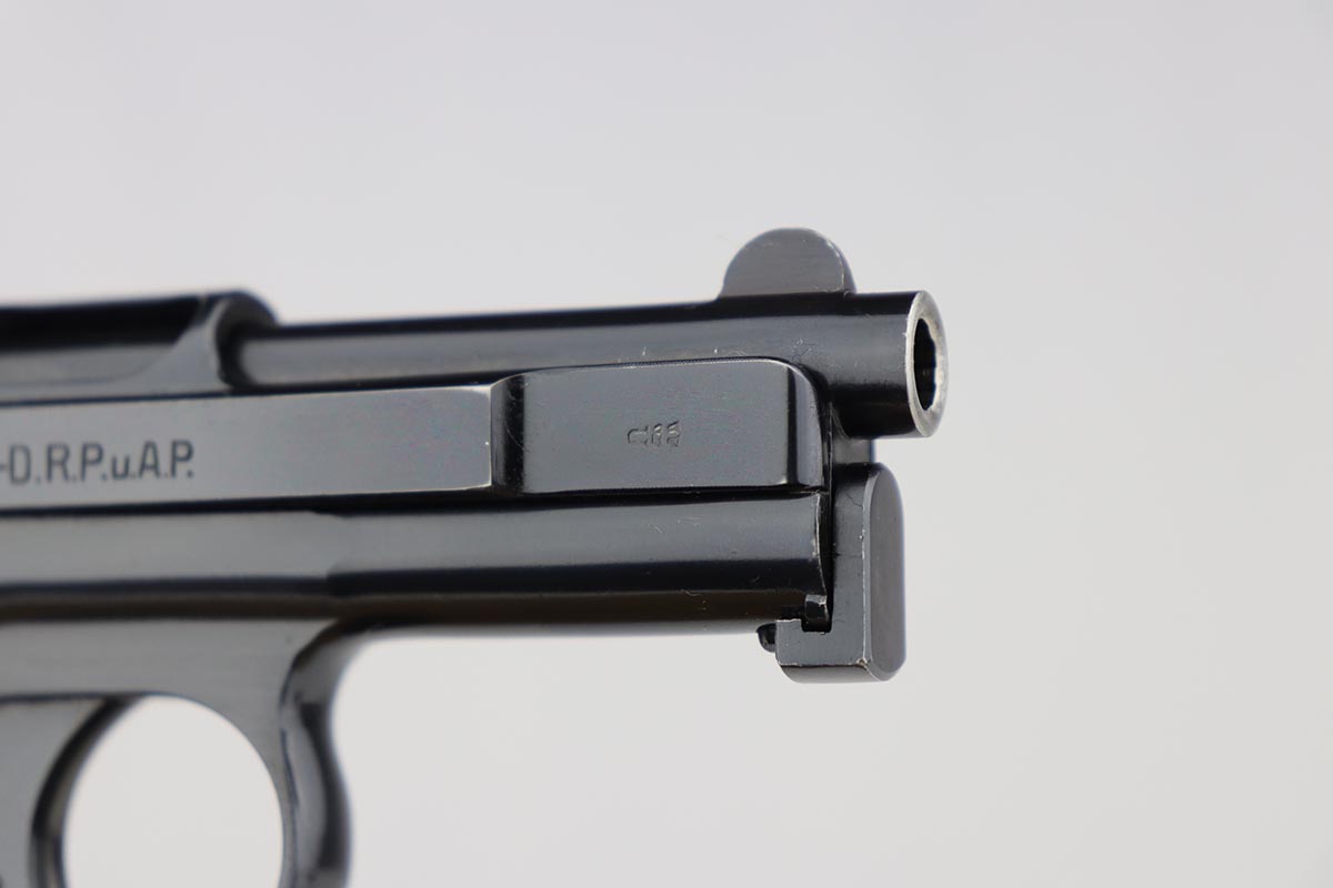 6/25/19 – This is a mint Mauser model 1910/14 with virtually zero finish loss. All matching and original. Bore is shiny with strong rifling. The grip is in very good condition, but does have a minor chip in the bottom corner on the left side, and a word lightly scratched into the plastic near the chip. I can’t quite make it out, may be in German.