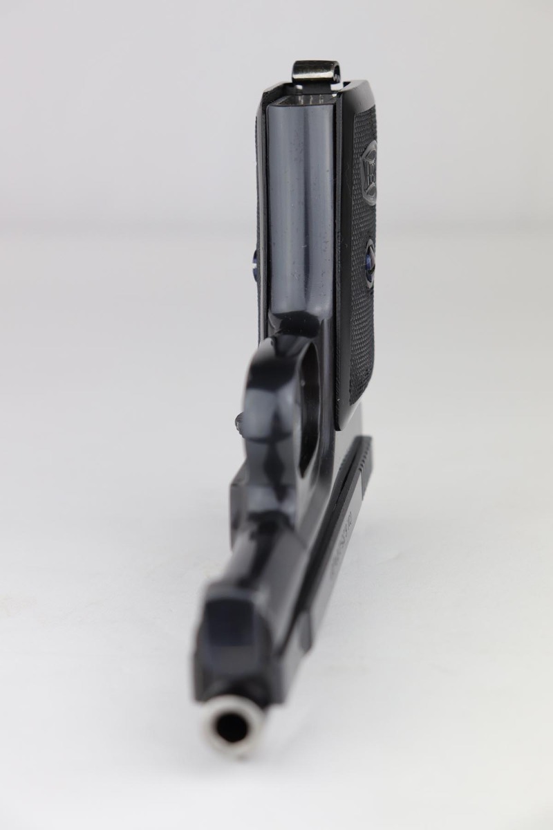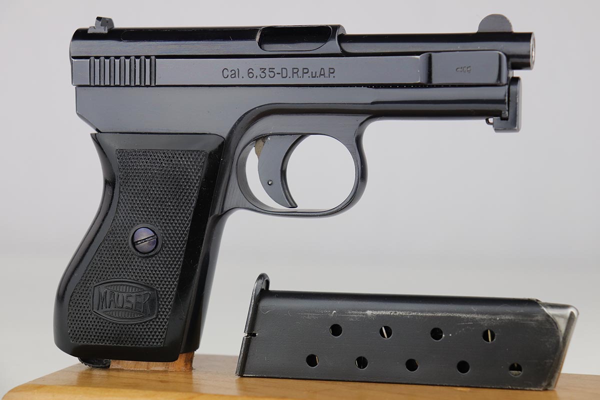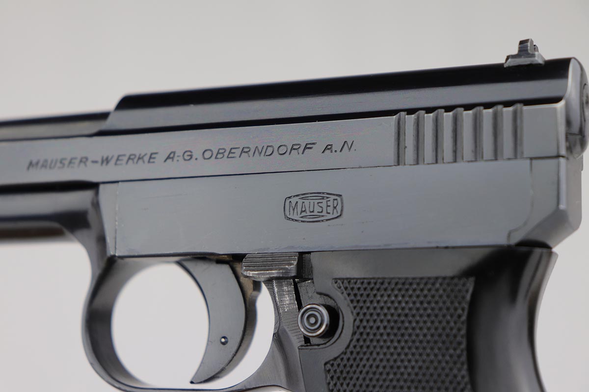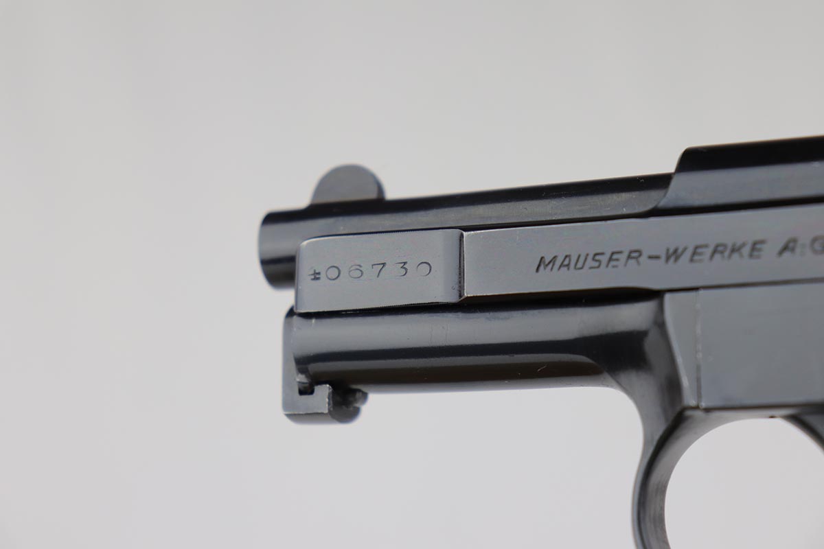 6/25/19 – This is a mint Mauser model 1910/14 with virtually zero finish loss. All matching and original. Bore is shiny with strong rifling. The grip is in very good condition, but does have a minor chip in the bottom corner on the left side, and a word lightly scratched into the plastic near the chip. I can’t quite make it out, may be in German.