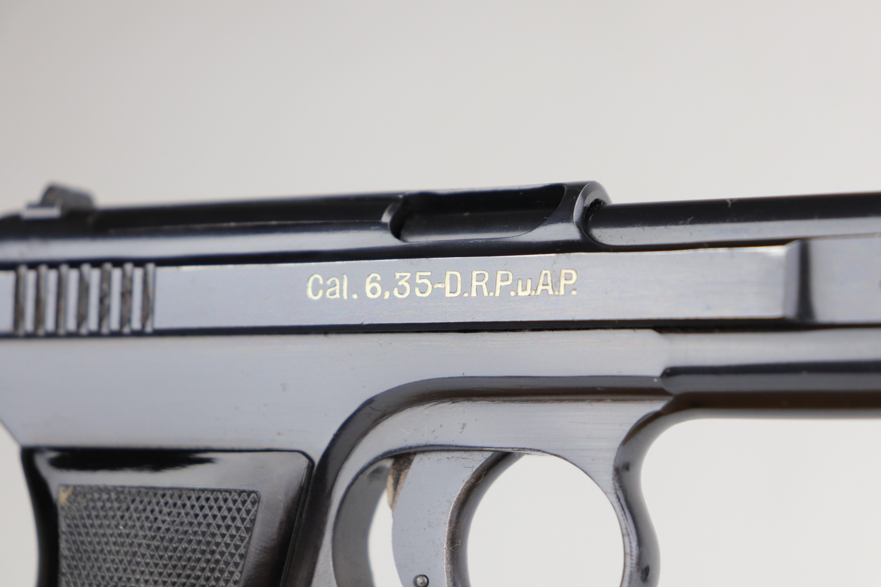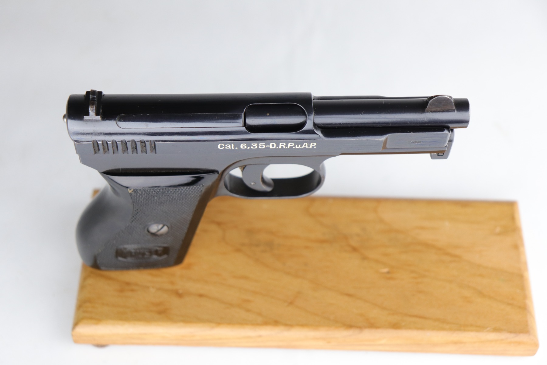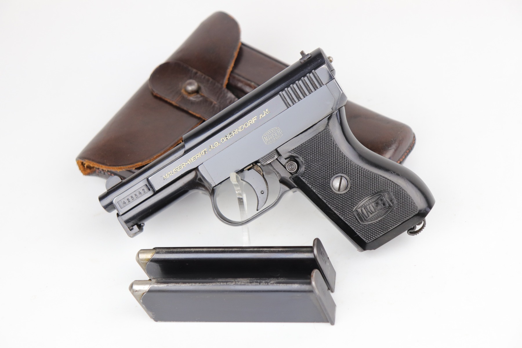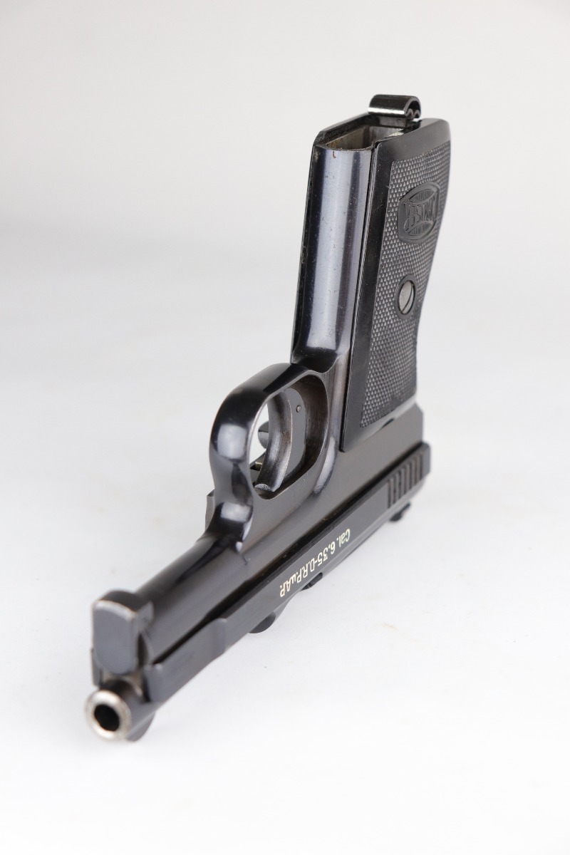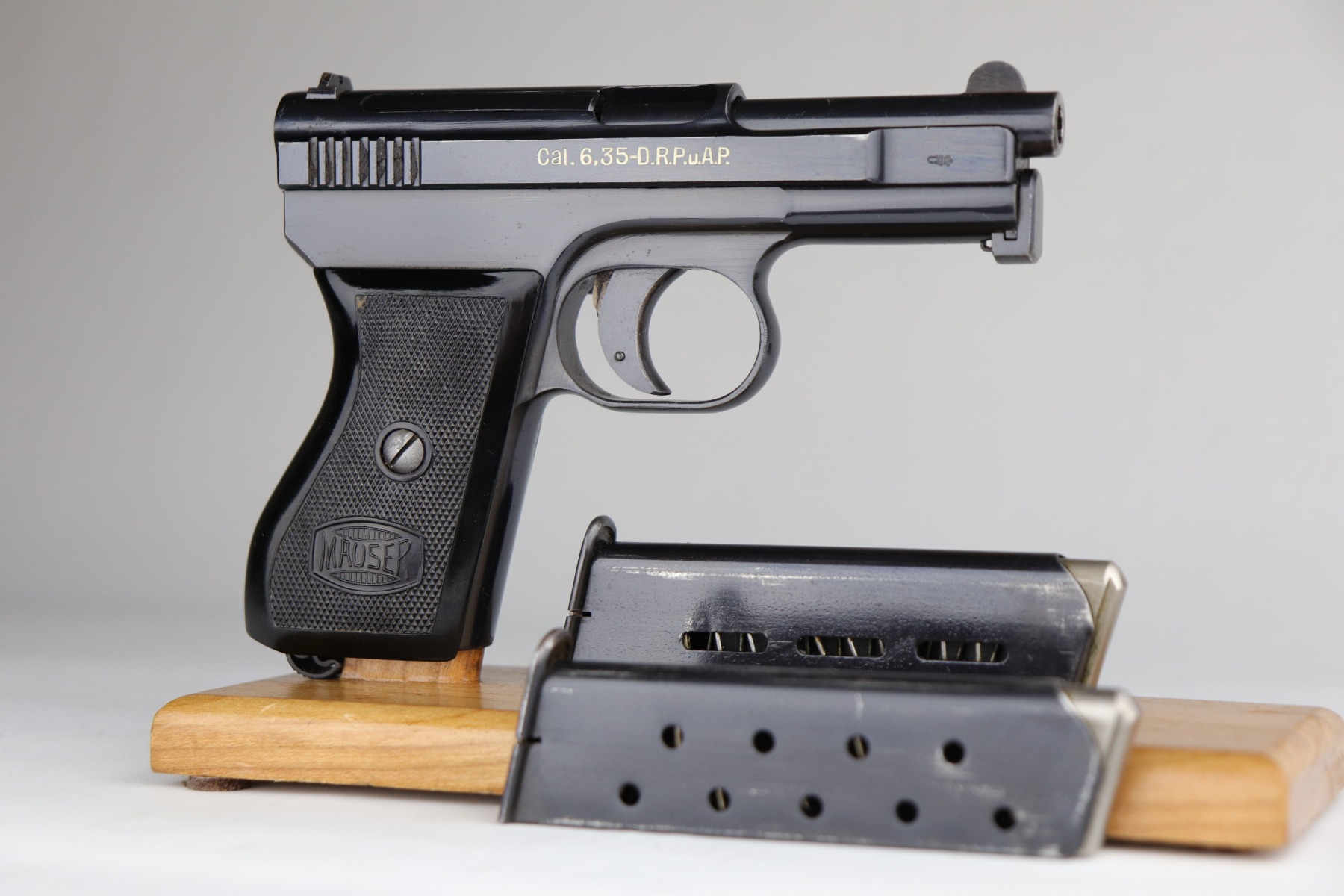 5/15/20 – This is a mint Mauser model 1910/14 with virtually zero finish loss. All matching and original. From the serial, this is most likely a fourth variation 1910/14 made in the mid 1930’s. Bore is shiny with strong rifling. The grip is in excellent condition, but has a very small chip in the bottom left-hand corner on the left side (typical). The gun is fully functional, but the slide sticks a little bit when sliding. It comes with an original holster in excellent condition and two proper magazines.