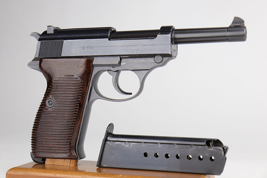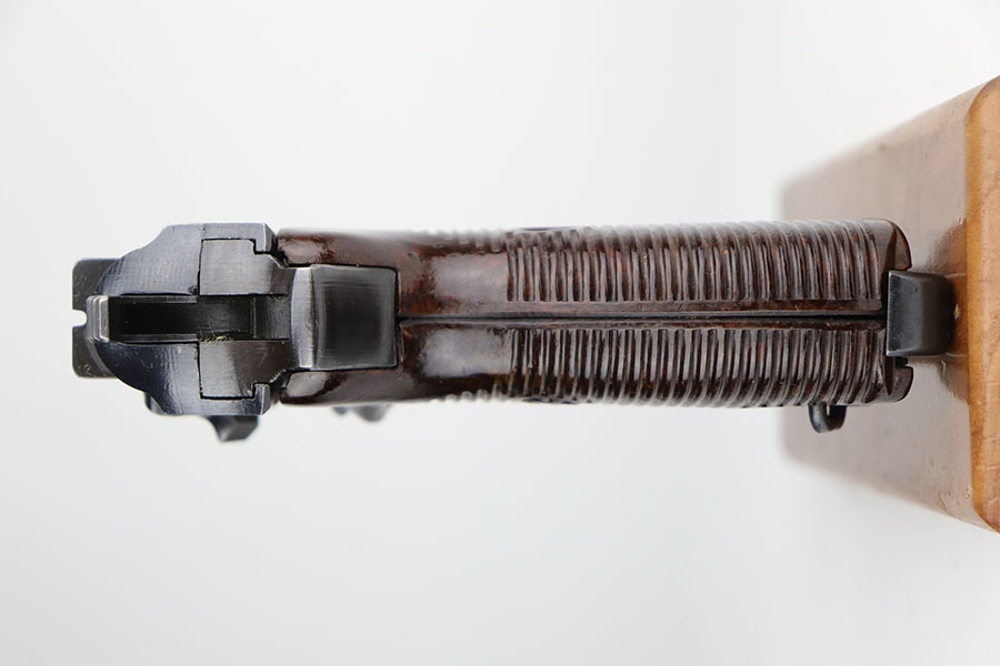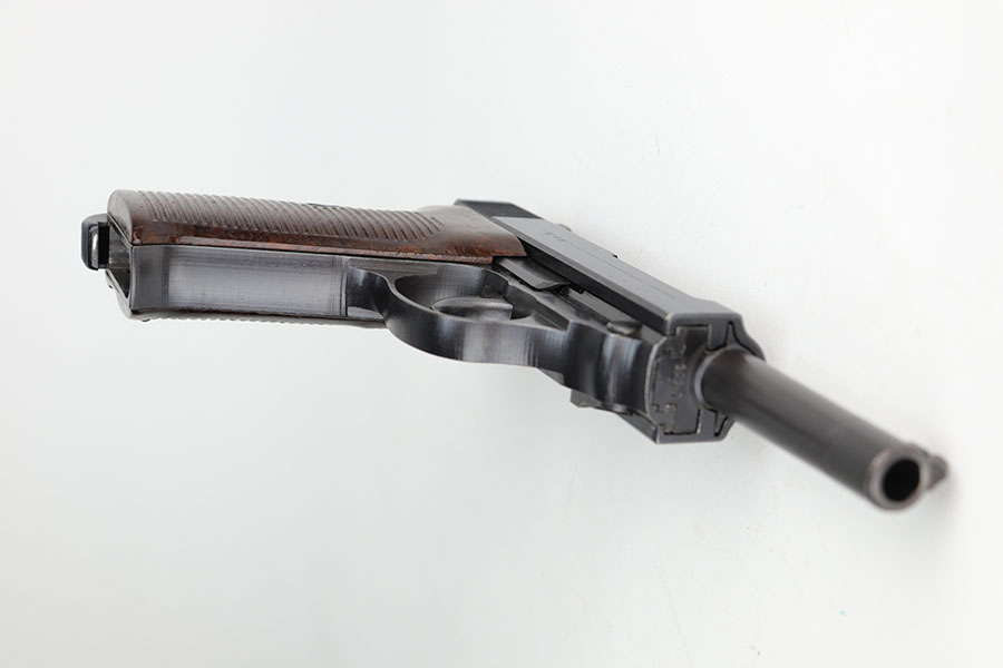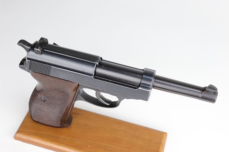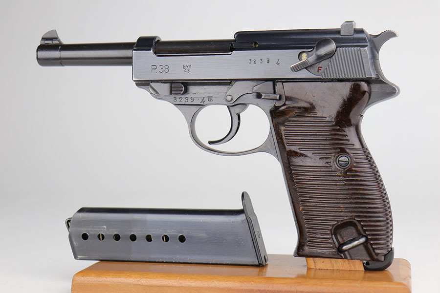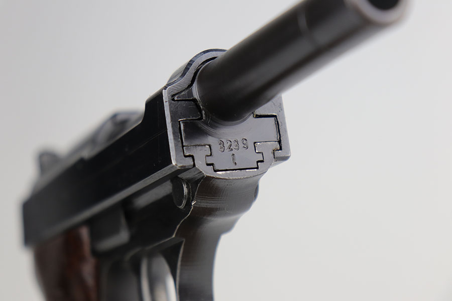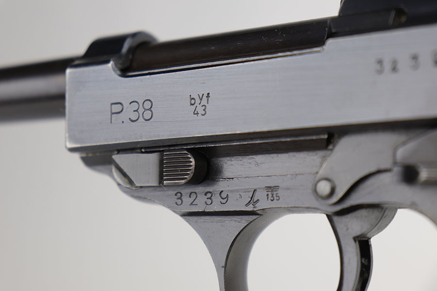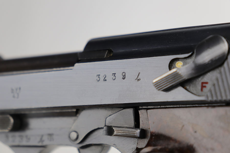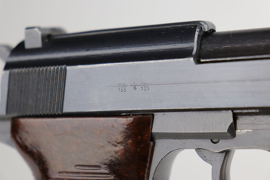 9/22/20 – This is a mint Mauser P.38 from October of 1943. All matching and original with virtually no bluing loss. Minty bore with hardly any signs of use. Mint brown grips. Frame, slide and magazine are all E/135 marked. There’s a casting flaw along the right side of the slide but it’s not a crack.