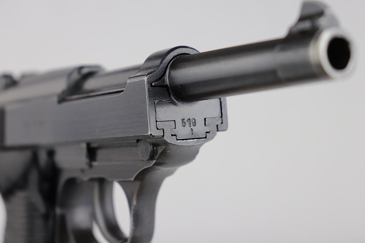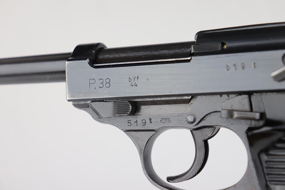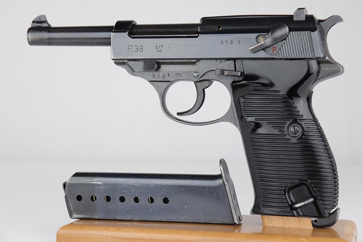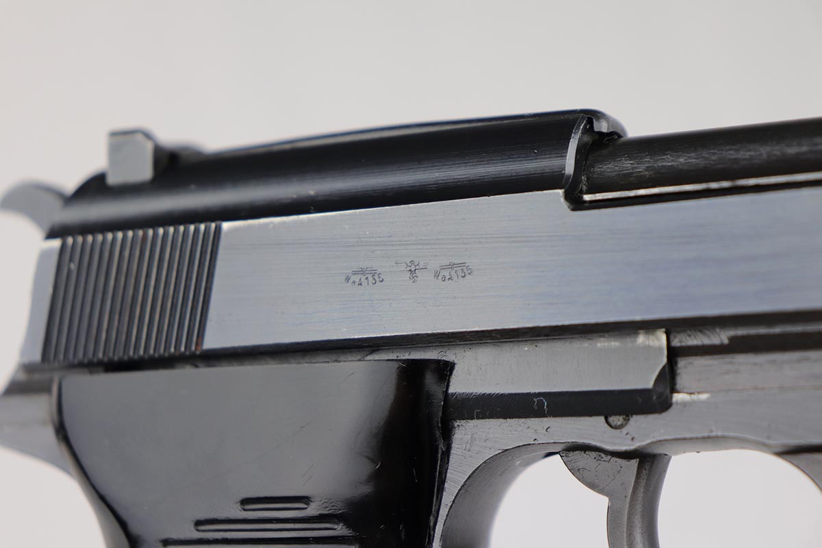 6/3/19 – This is a nearly mint Mauser P.38 in all matching and original configuration. Made in April of 1944, the pistol retains 99% original blue with just a hint of edge wear on the trigger guard and left side of the slide. Mint bore and excellent grips. Proper mechanics. Mauser magazine.