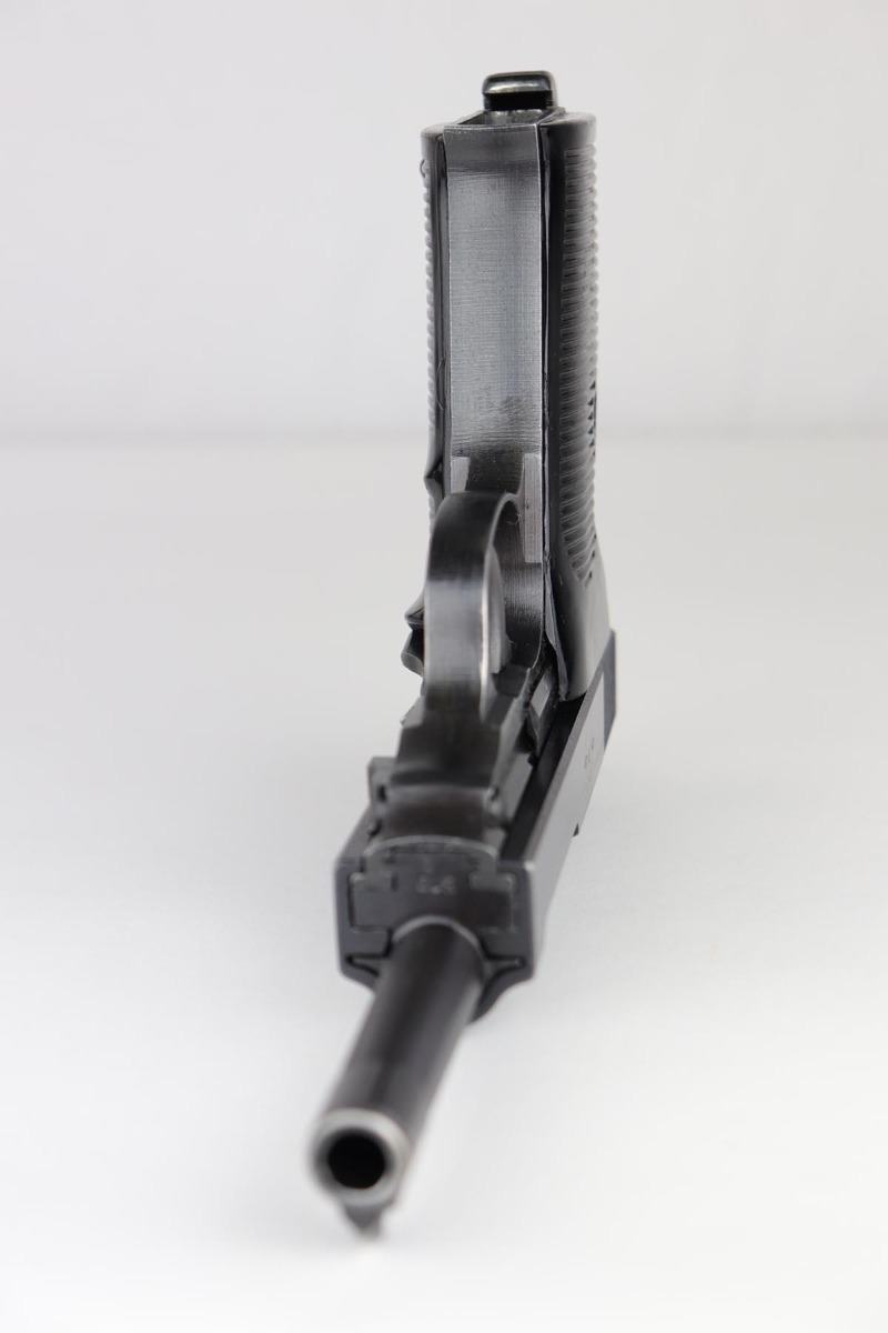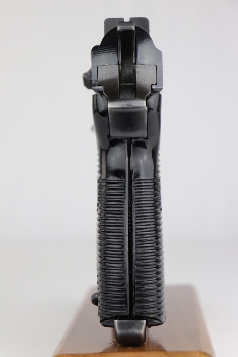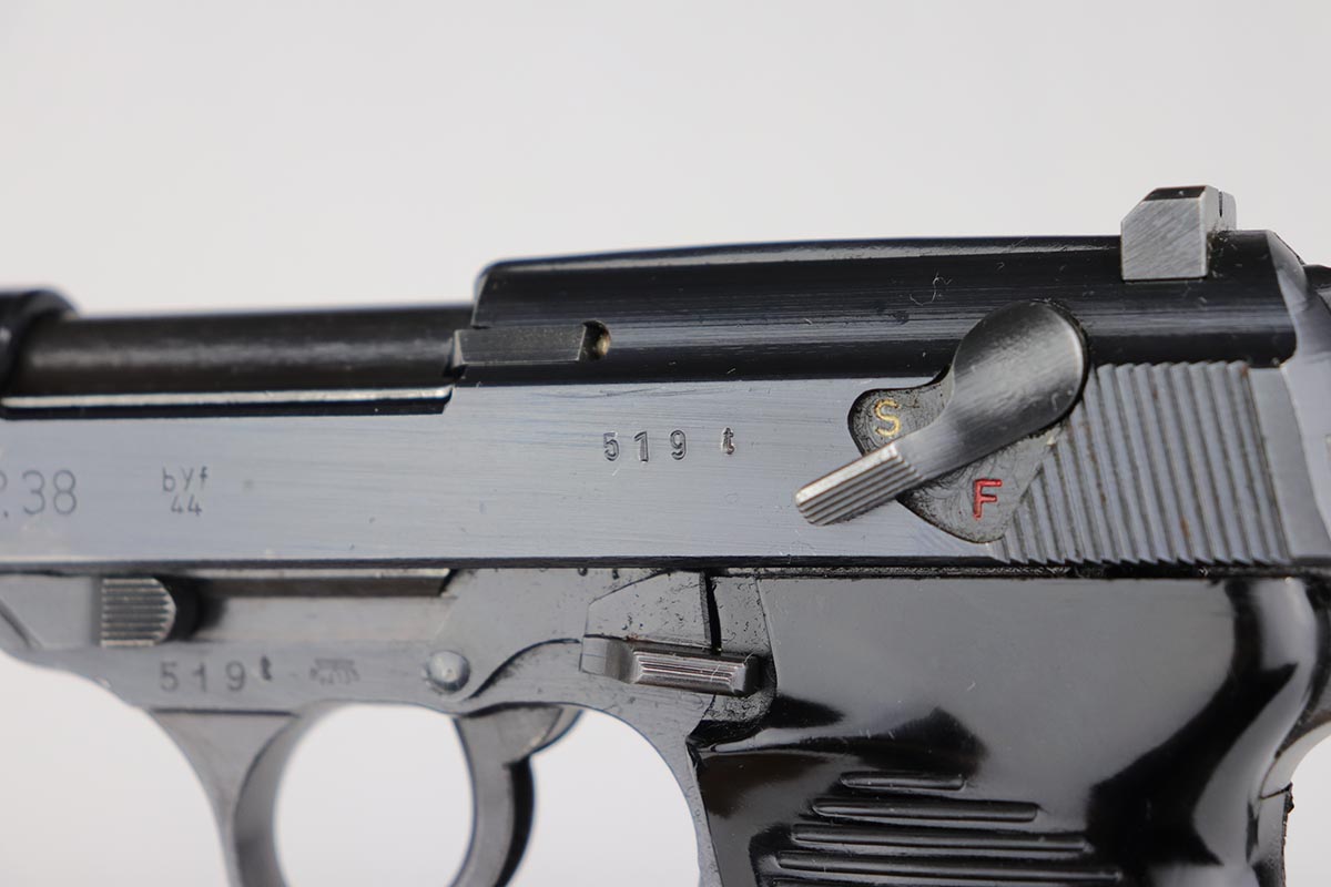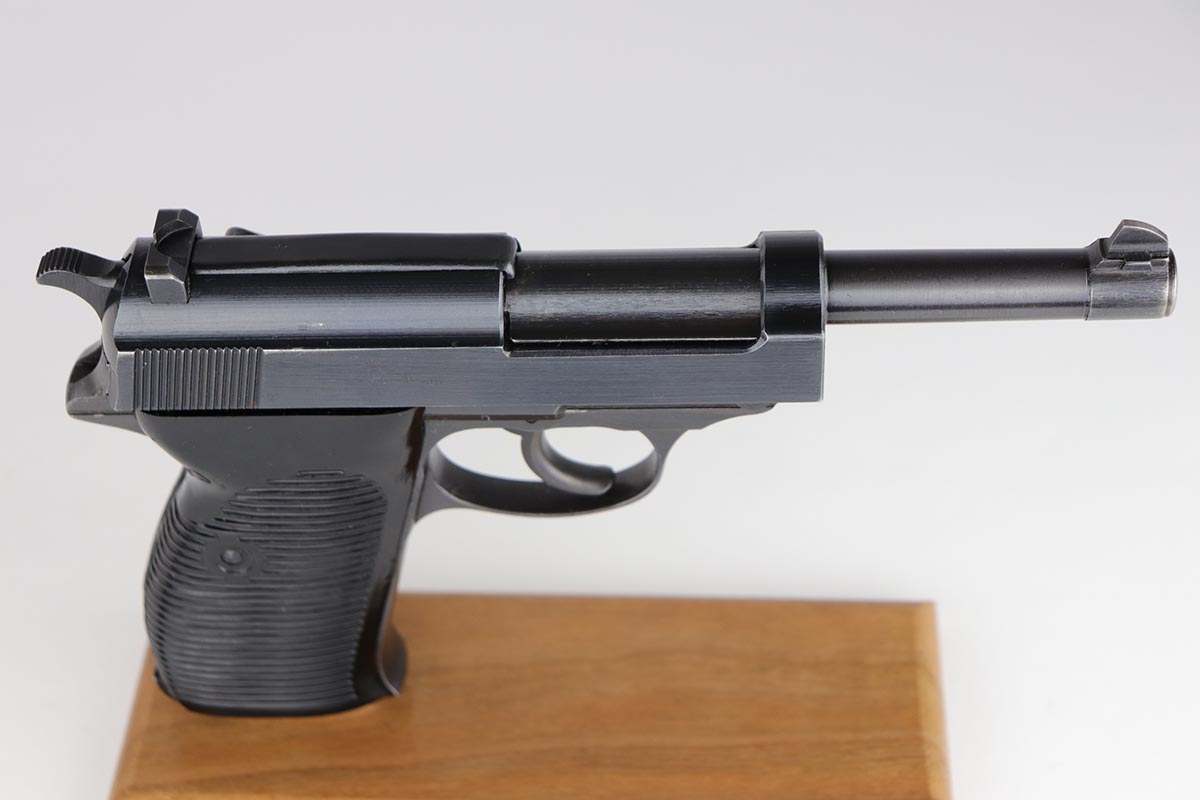 6/3/19 – This is a nearly mint Mauser P.38 in all matching and original configuration. Made in April of 1944, the pistol retains 99% original blue with just a hint of edge wear on the trigger guard and left side of the slide. Mint bore and excellent grips. Proper mechanics. Mauser magazine.