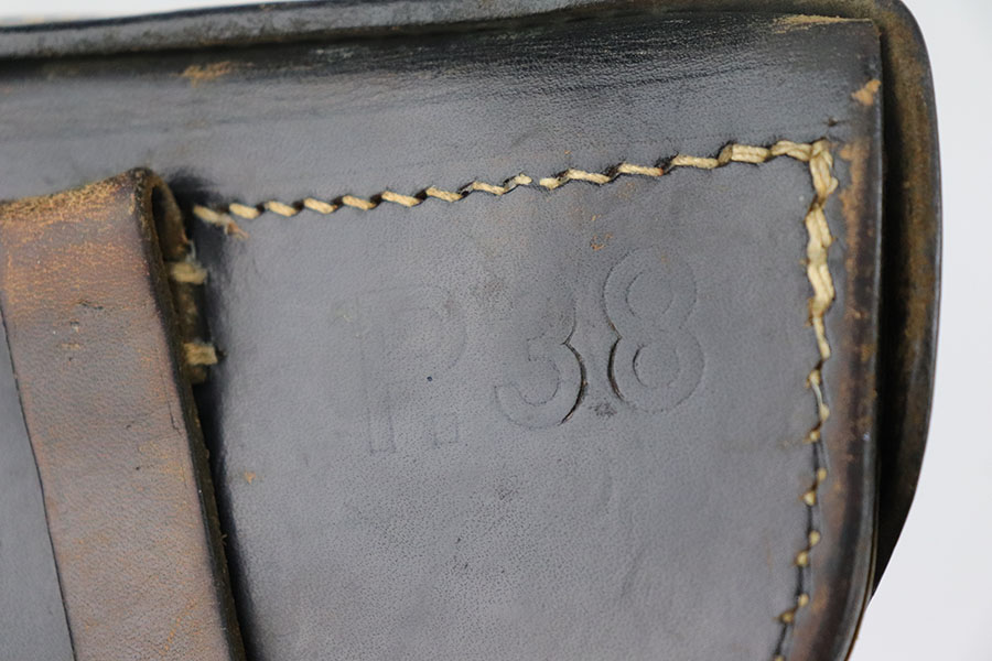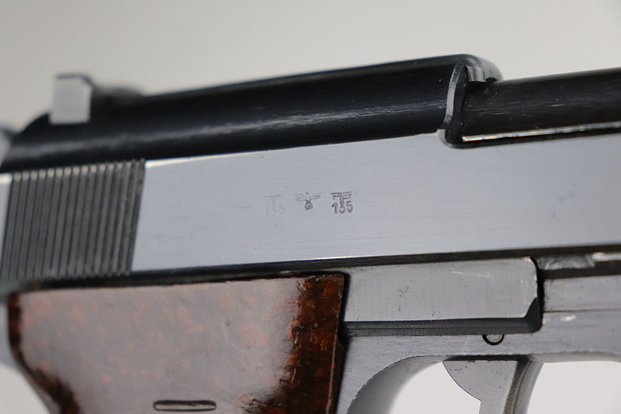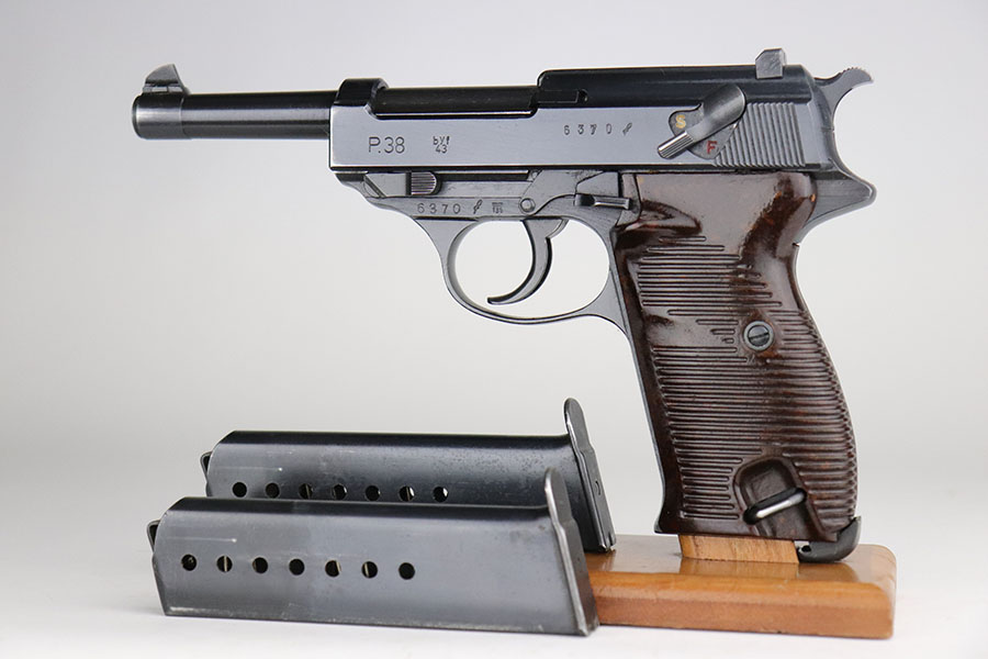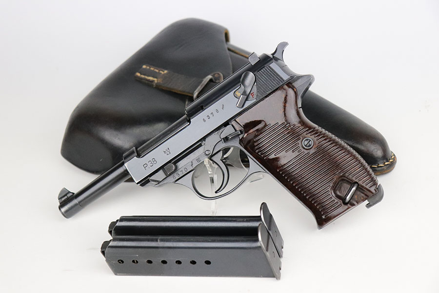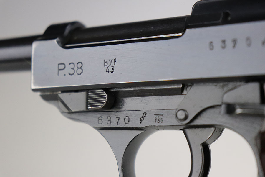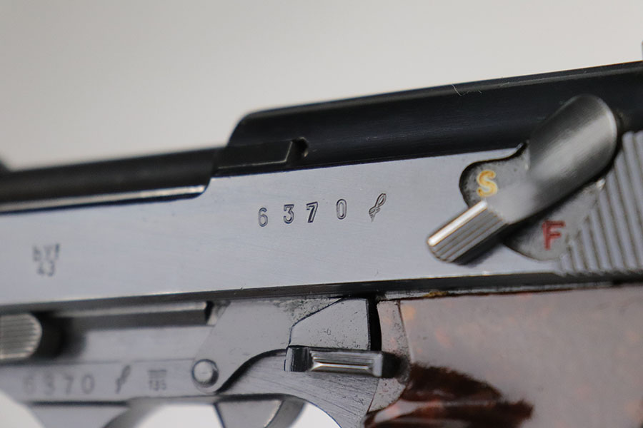 8/13/20 – This is an all matching and original Mauser P.38 rig from June of 1943. The pistol has 98-99% of the original blue with just a bit of high edge wear from the holster on the firing pin cover, muzzle and front edge of slide. Excellent bore and good mechanics. Minty reddish grips. Both magazines are E/135 proofed, same as the pistol. The rig is completed by an excellent hardshell holster that is also ’43 dated and ‘hft’ maker mark.