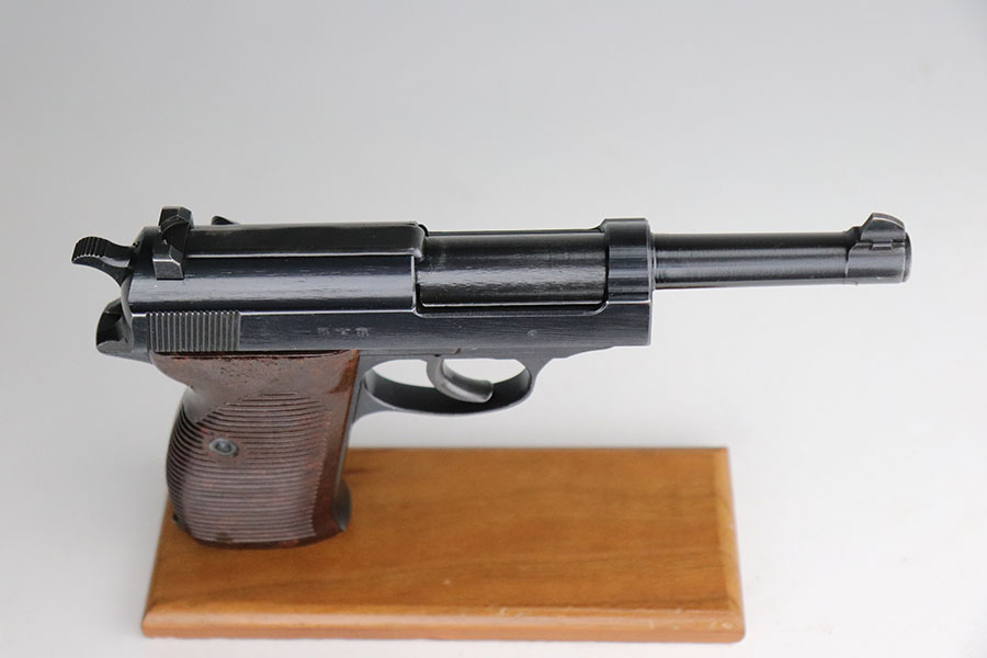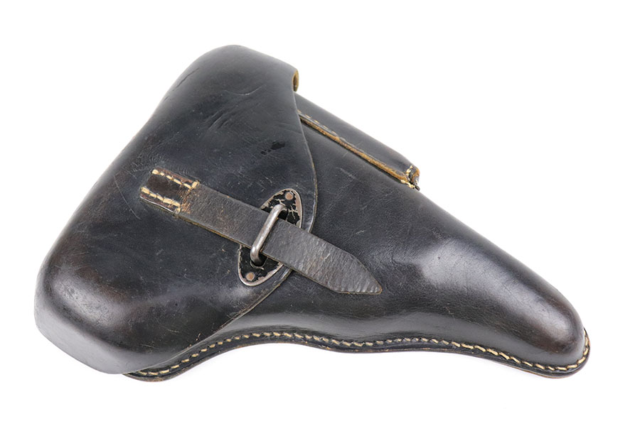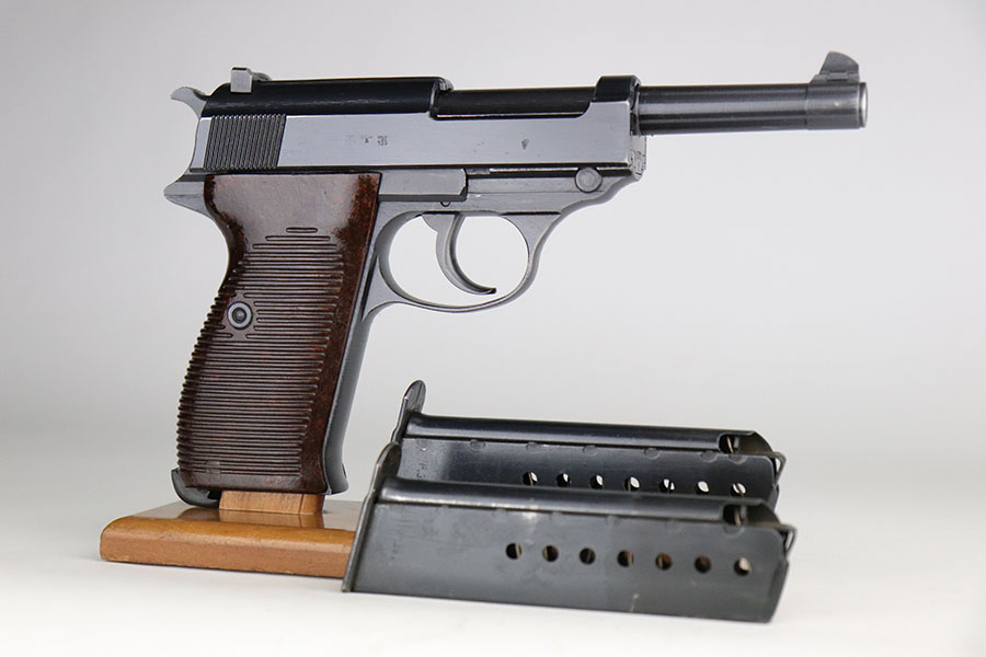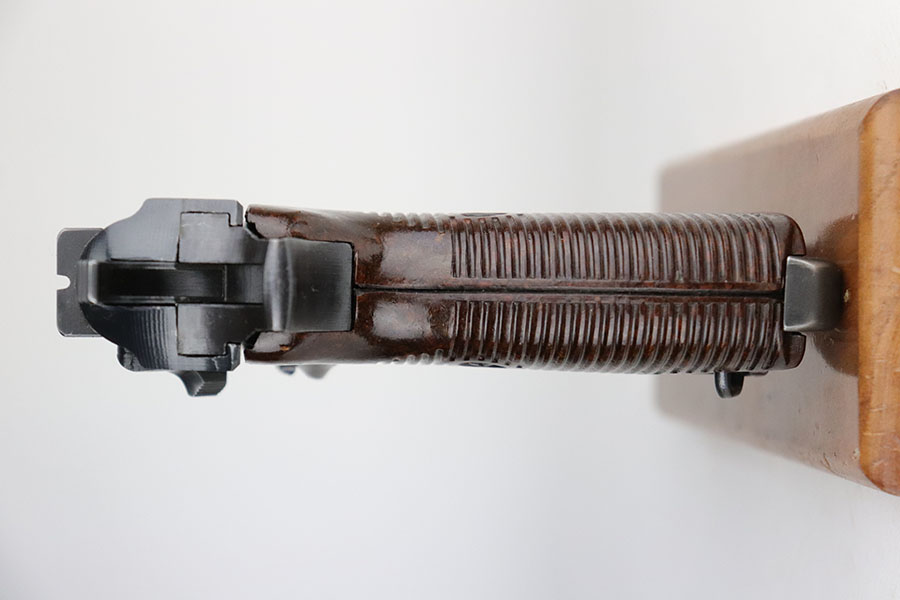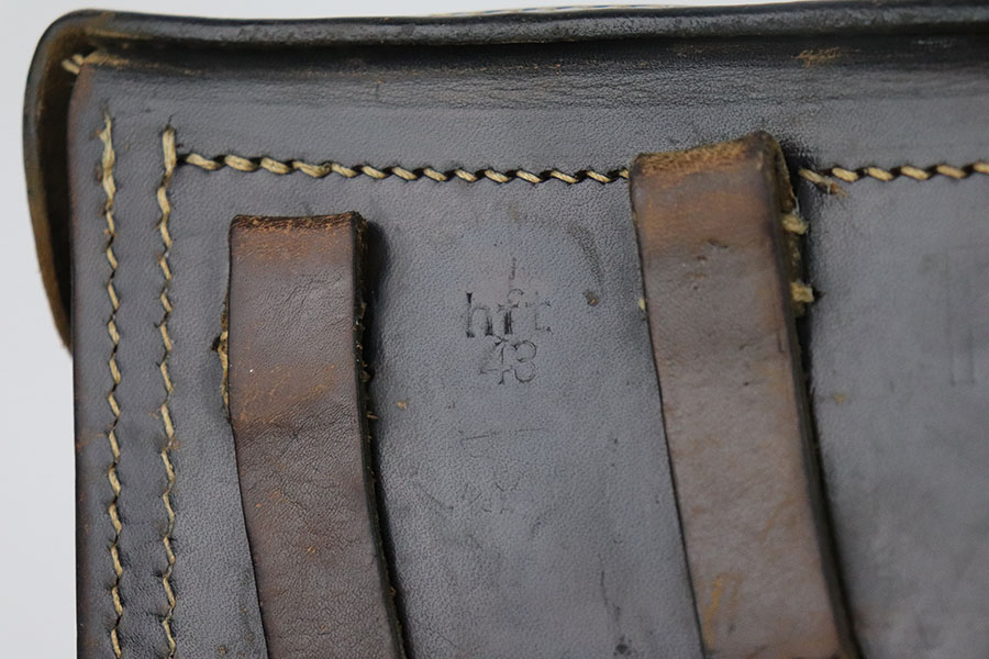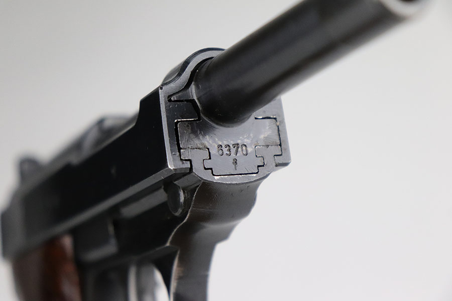 8/13/20 – This is an all matching and original Mauser P.38 rig from June of 1943. The pistol has 98-99% of the original blue with just a bit of high edge wear from the holster on the firing pin cover, muzzle and front edge of slide. Excellent bore and good mechanics. Minty reddish grips. Both magazines are E/135 proofed, same as the pistol. The rig is completed by an excellent hardshell holster that is also ’43 dated and ‘hft’ maker mark.