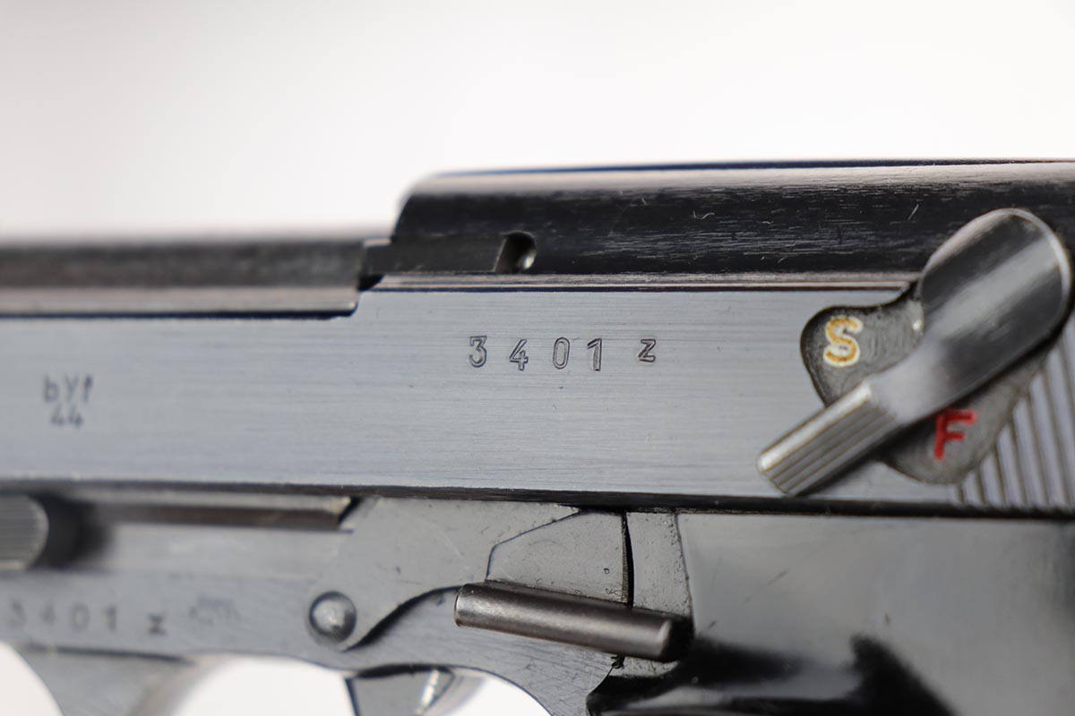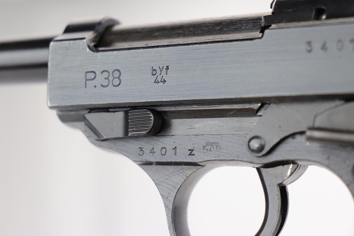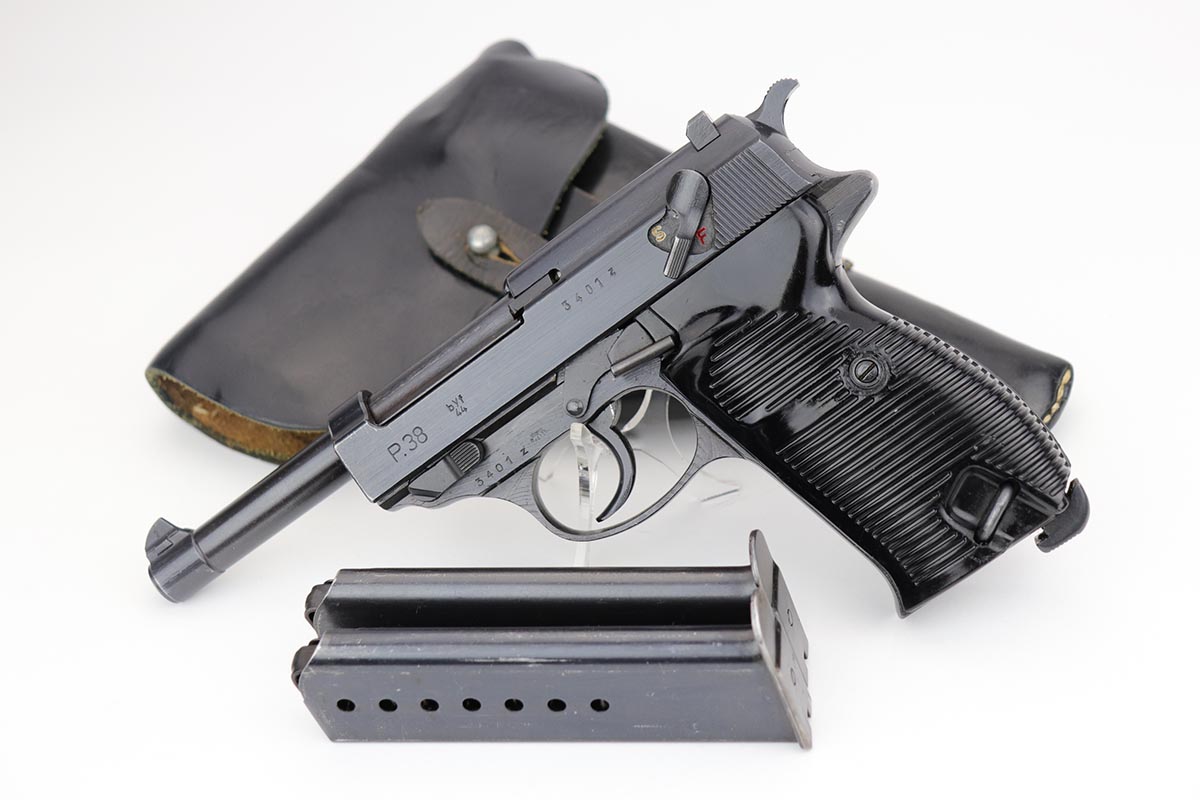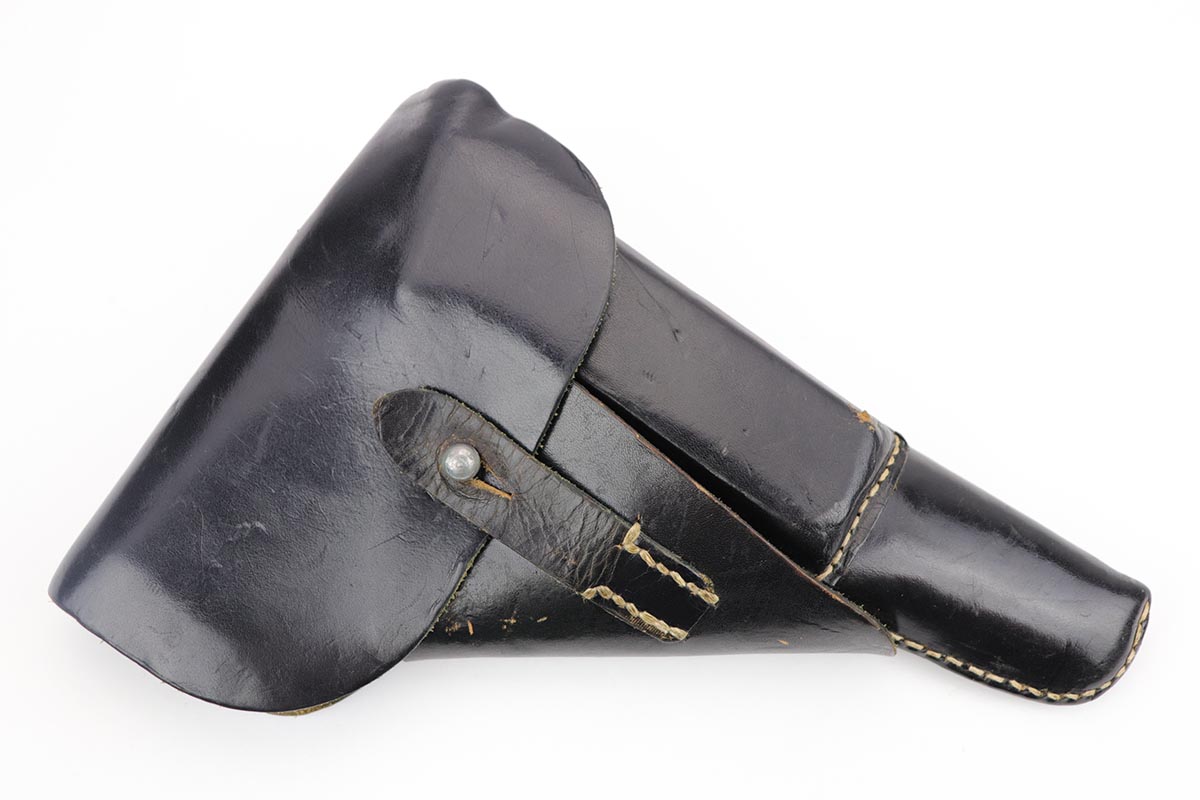 12/4/19 – This is a mint Mauser P.38 rig from October of 1944. The gun has 99% of the original blue, with just minor hints of edge wear from the holster. All matching numbers. Minty bore and excellent grips. The rig includes a total of two magazines, both of which are scarce and desirable ‘U’ marked examples. Rig is complete with a 1944 dated holster, with ‘bla’ maker mark and sharp WaA159 proof.