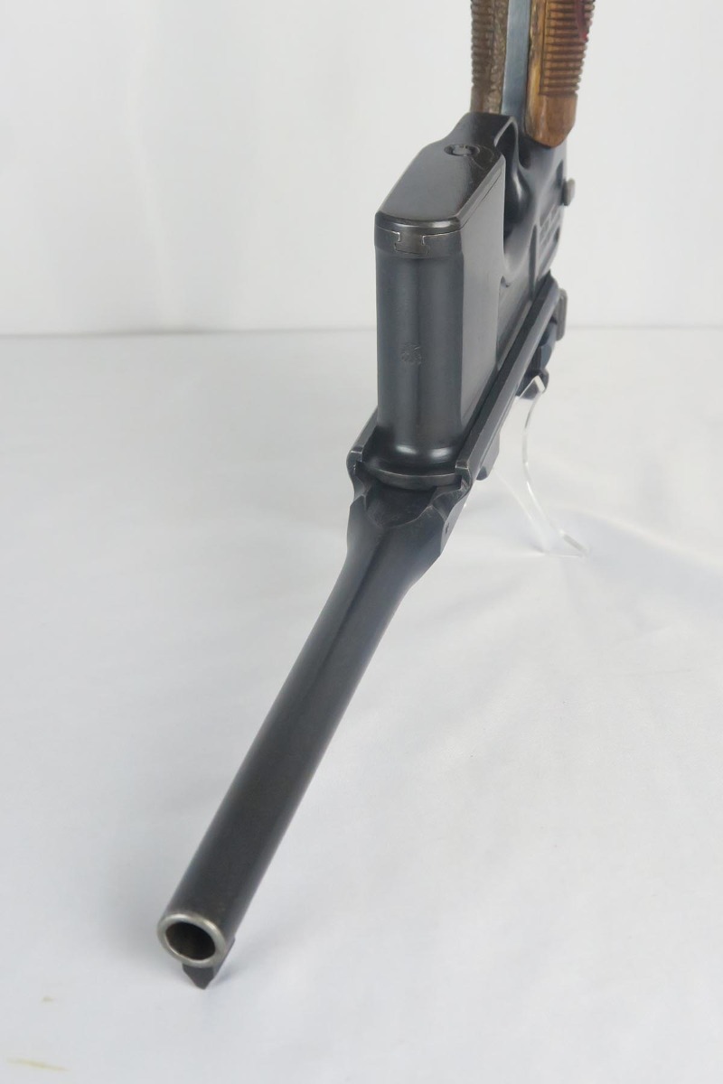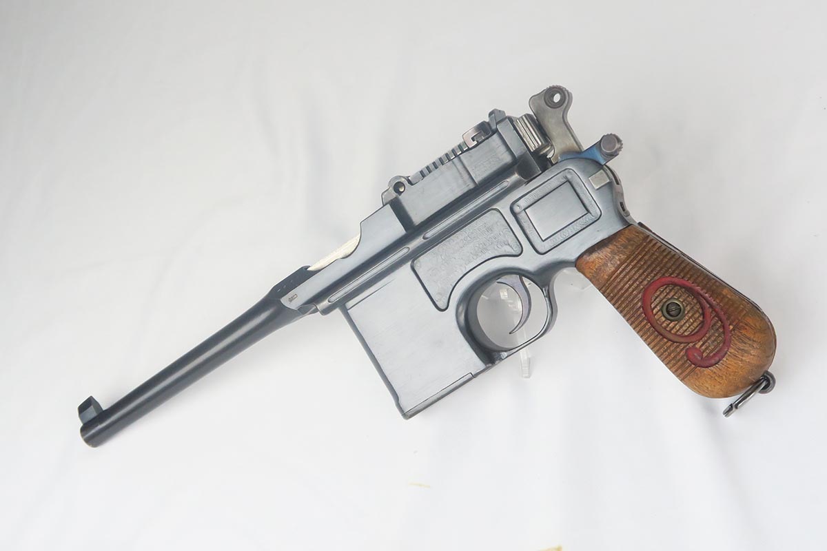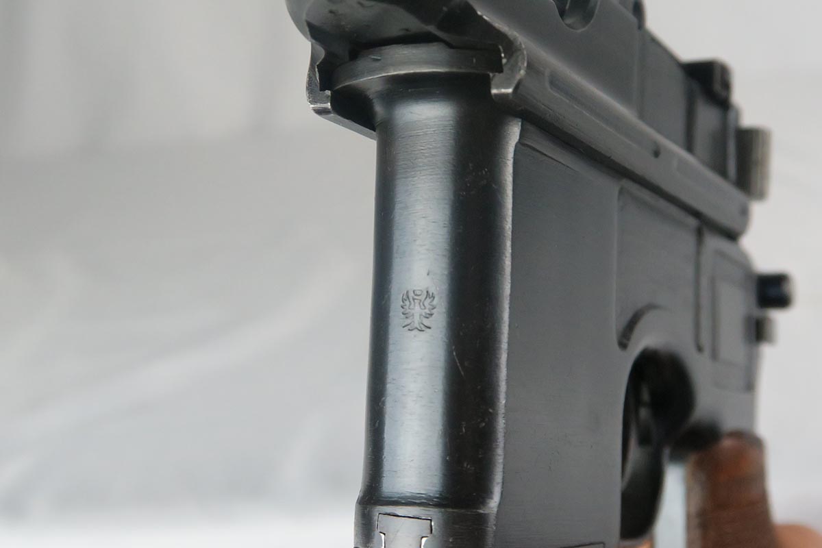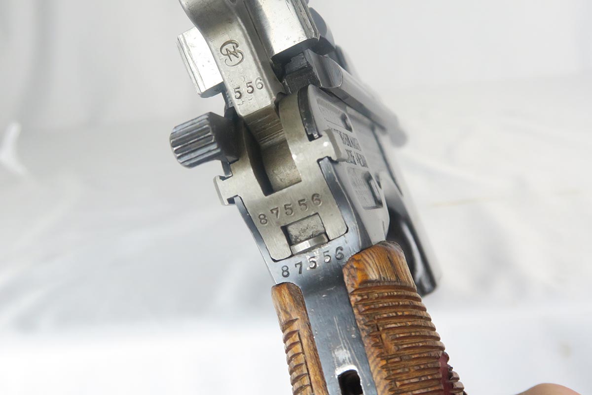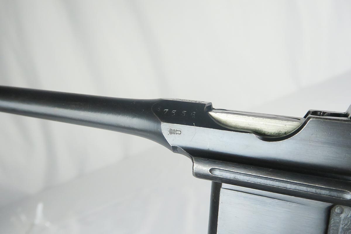 1/9/18 – This is an absolutely magnificent example of a WWI Mauser C96 “Red 9” pistol in 98-99% original condition with matching shoulder stock and leather harness. This gun is a scarce Prussian contract variation and has a large Prussian eagle stamped on the front of the magazine well. The gun is all matching and has only a hint of wear from being in a shoulder stock and a tiny nick/scratch on the left side of the frame that is not through the blue. It comes with the original matching grips in excellent condition. The fireblue is vivid on the small parts. The shoulder stock is in superb shape as well with a sharp Imperial proof mark in the wood and a matching serial number on the iron. It has no cracks or other noticeable defects aside from light field wear. The excellent leather harness is original and is maker marked and dated. It is without defects and comes with an original cleaning rod. The bore has strong rifling but shows some frosting and freckling in the grooves.