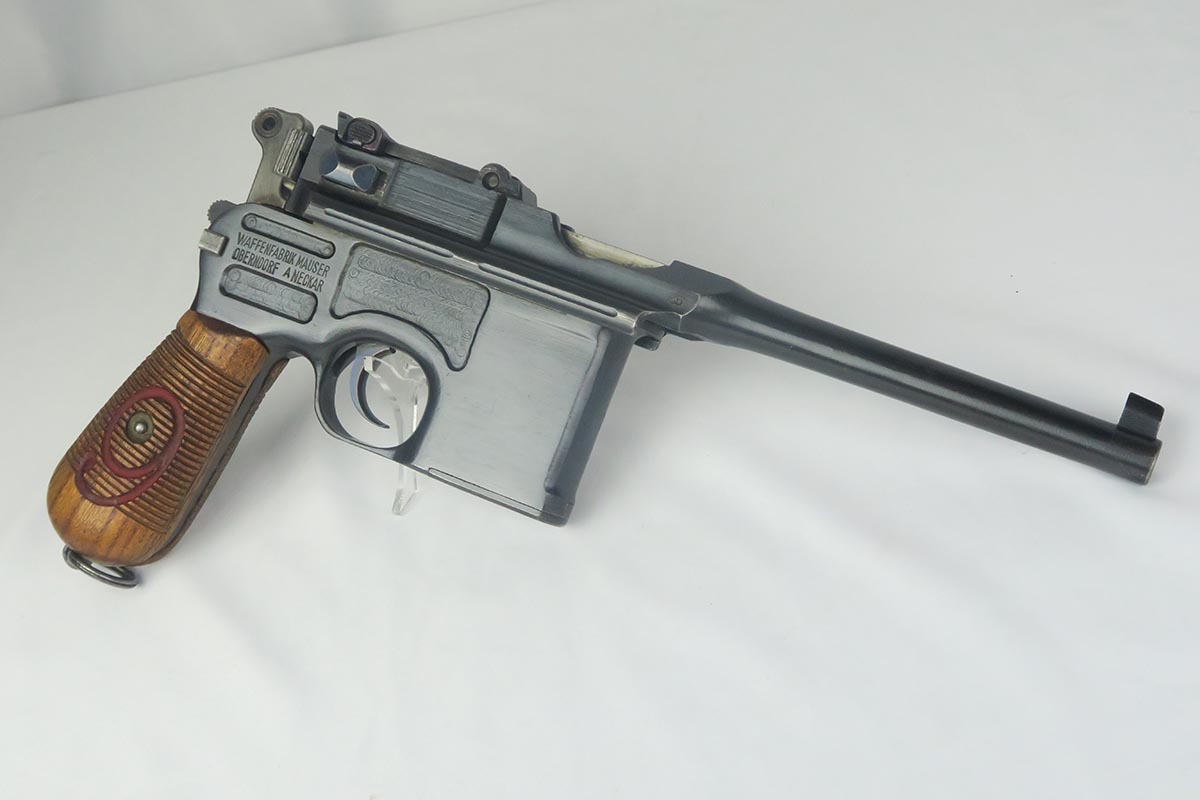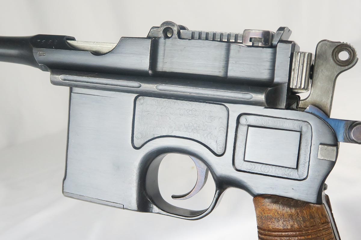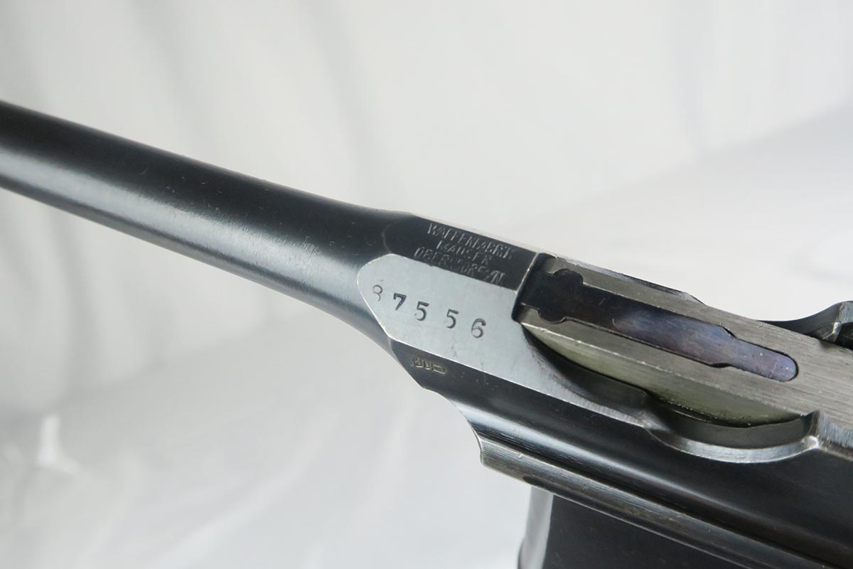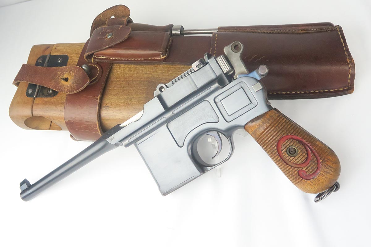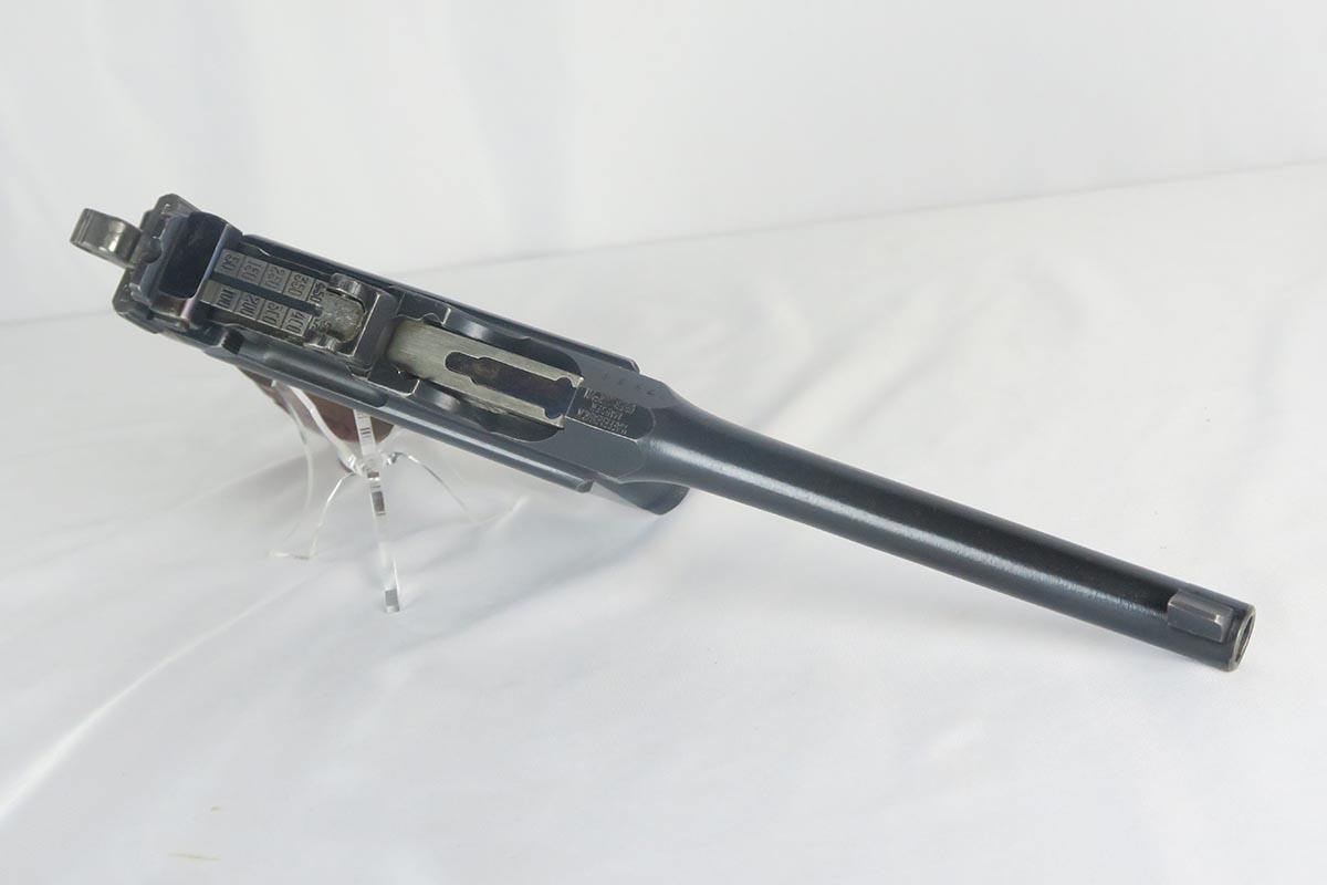 1/9/18 – This is an absolutely magnificent example of a WWI Mauser C96 “Red 9” pistol in 98-99% original condition with matching shoulder stock and leather harness. This gun is a scarce Prussian contract variation and has a large Prussian eagle stamped on the front of the magazine well. The gun is all matching and has only a hint of wear from being in a shoulder stock and a tiny nick/scratch on the left side of the frame that is not through the blue. It comes with the original matching grips in excellent condition. The fireblue is vivid on the small parts. The shoulder stock is in superb shape as well with a sharp Imperial proof mark in the wood and a matching serial number on the iron. It has no cracks or other noticeable defects aside from light field wear. The excellent leather harness is original and is maker marked and dated. It is without defects and comes with an original cleaning rod. The bore has strong rifling but shows some frosting and freckling in the grooves.