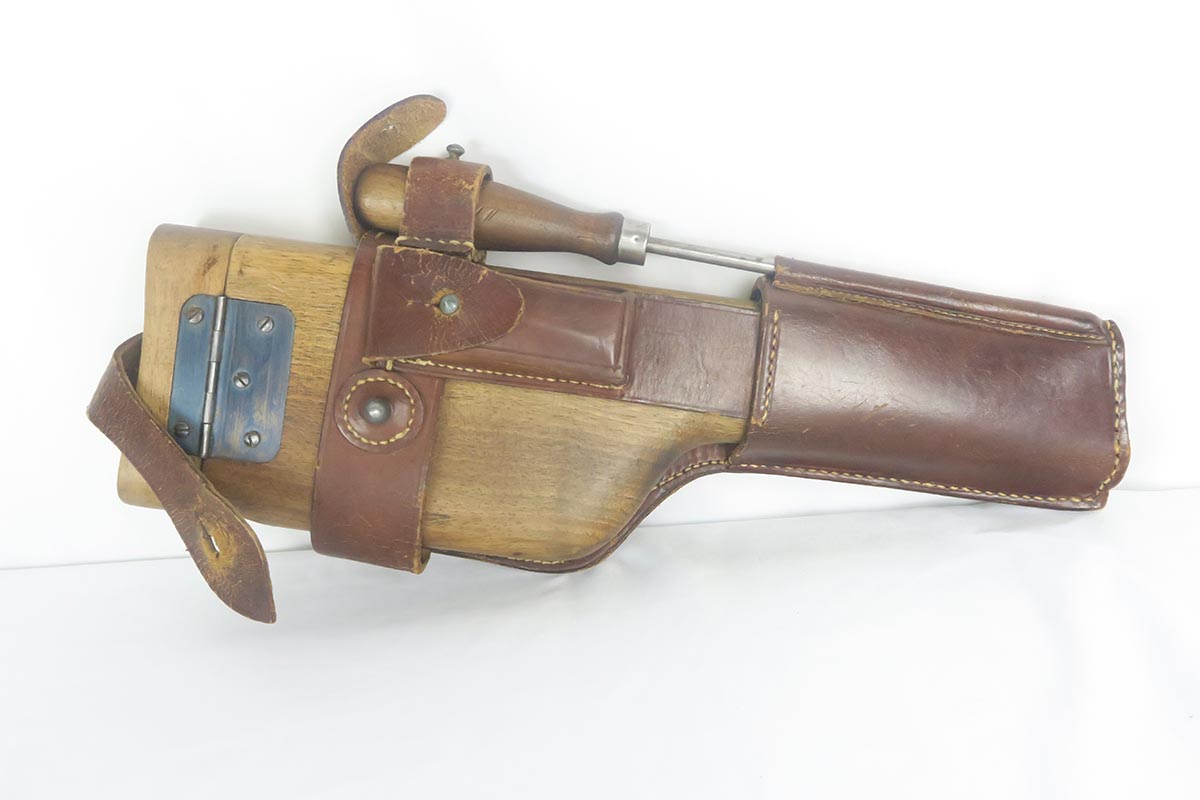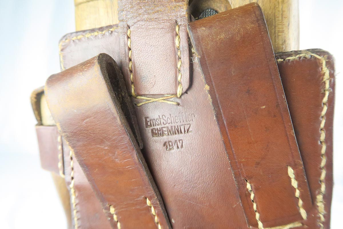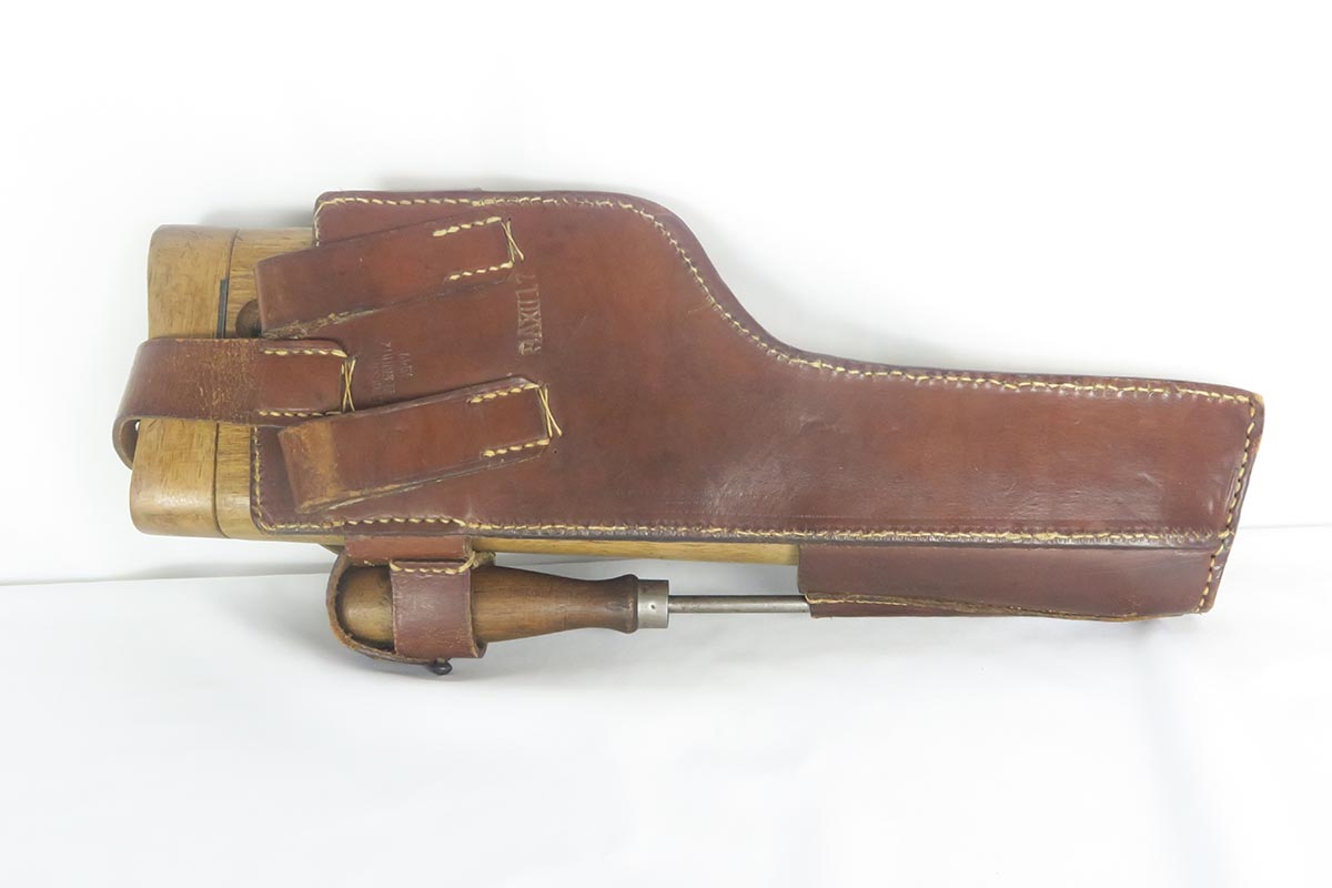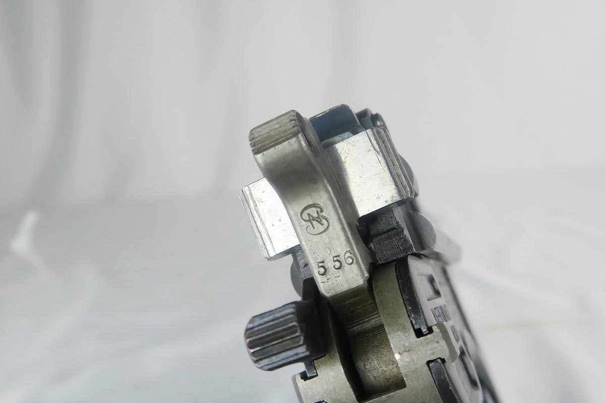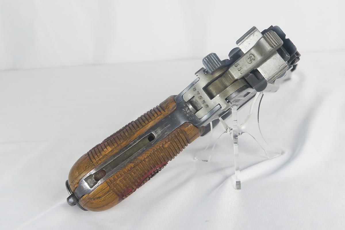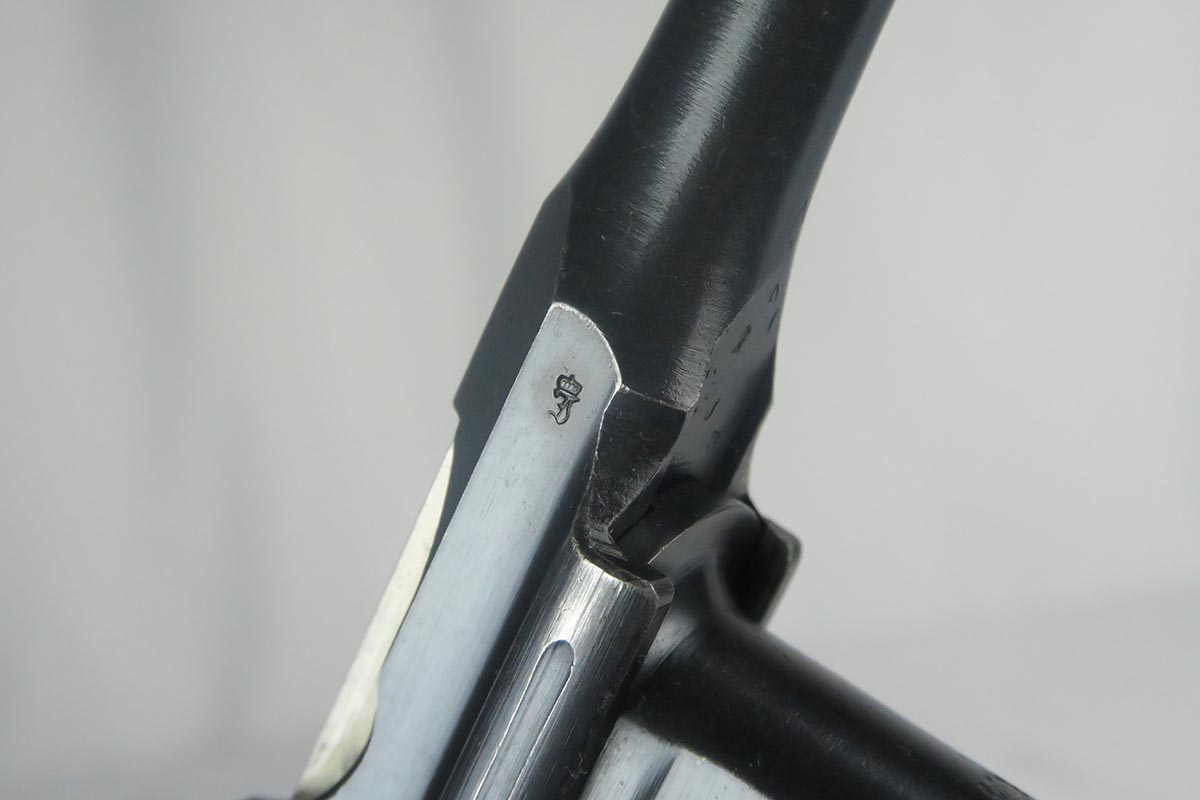 1/9/18 – This is an absolutely magnificent example of a WWI Mauser C96 “Red 9” pistol in 98-99% original condition with matching shoulder stock and leather harness. This gun is a scarce Prussian contract variation and has a large Prussian eagle stamped on the front of the magazine well. The gun is all matching and has only a hint of wear from being in a shoulder stock and a tiny nick/scratch on the left side of the frame that is not through the blue. It comes with the original matching grips in excellent condition. The fireblue is vivid on the small parts. The shoulder stock is in superb shape as well with a sharp Imperial proof mark in the wood and a matching serial number on the iron. It has no cracks or other noticeable defects aside from light field wear. The excellent leather harness is original and is maker marked and dated. It is without defects and comes with an original cleaning rod. The bore has strong rifling but shows some frosting and freckling in the grooves.