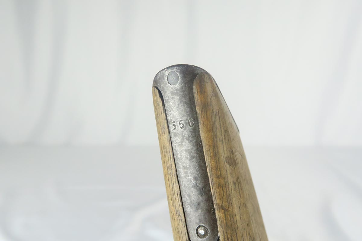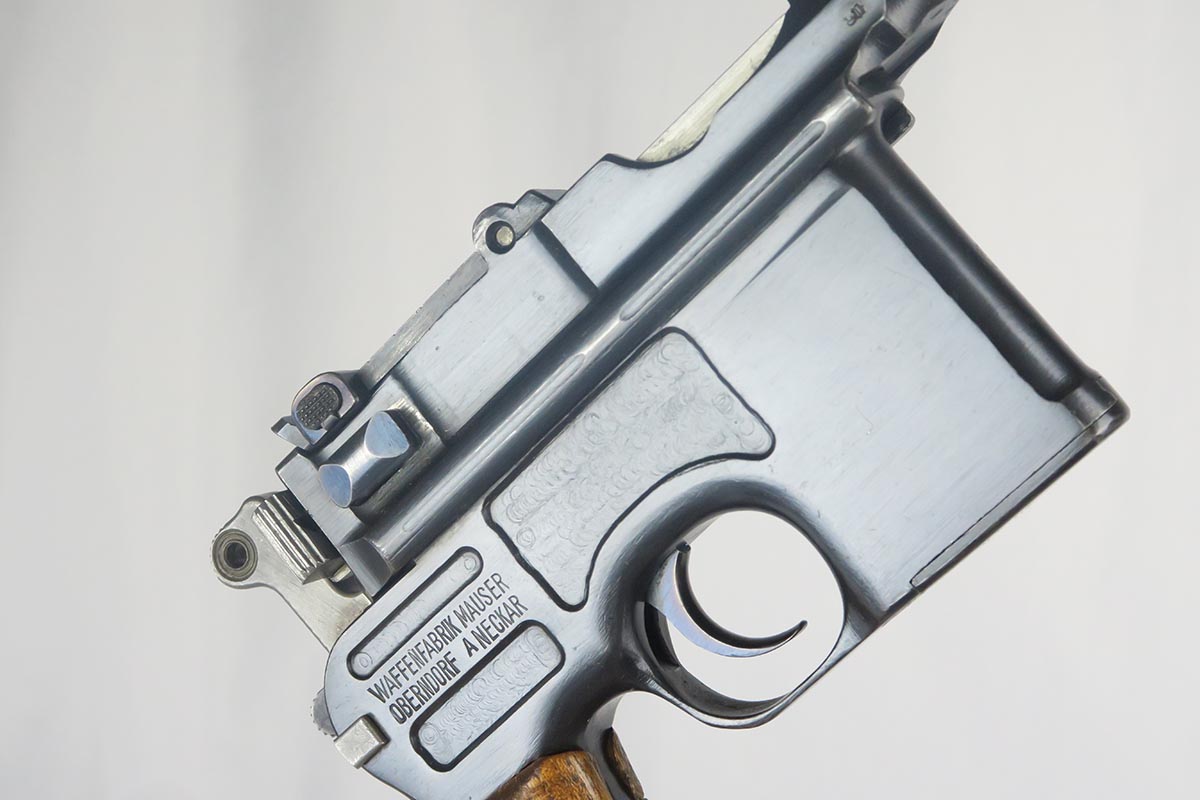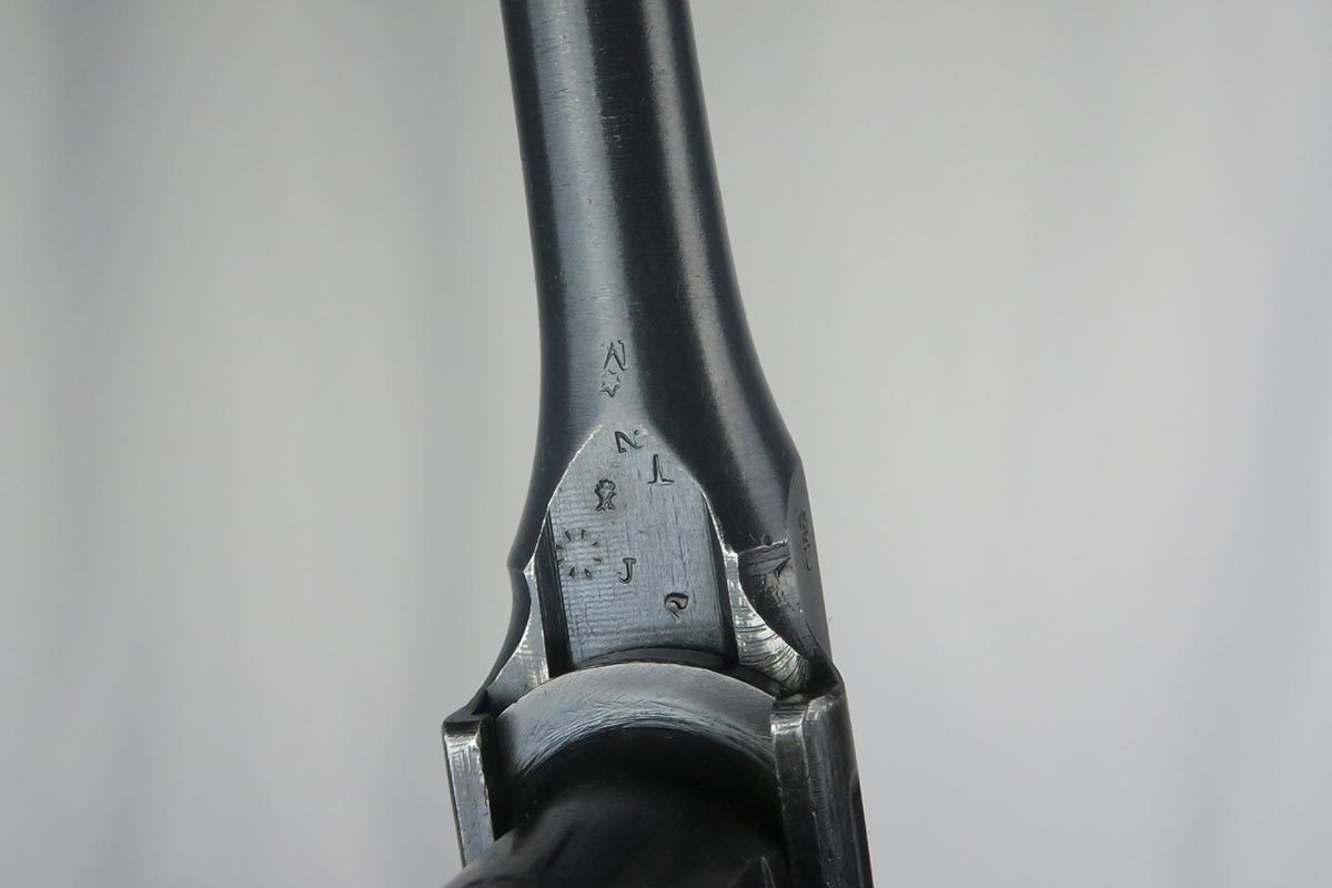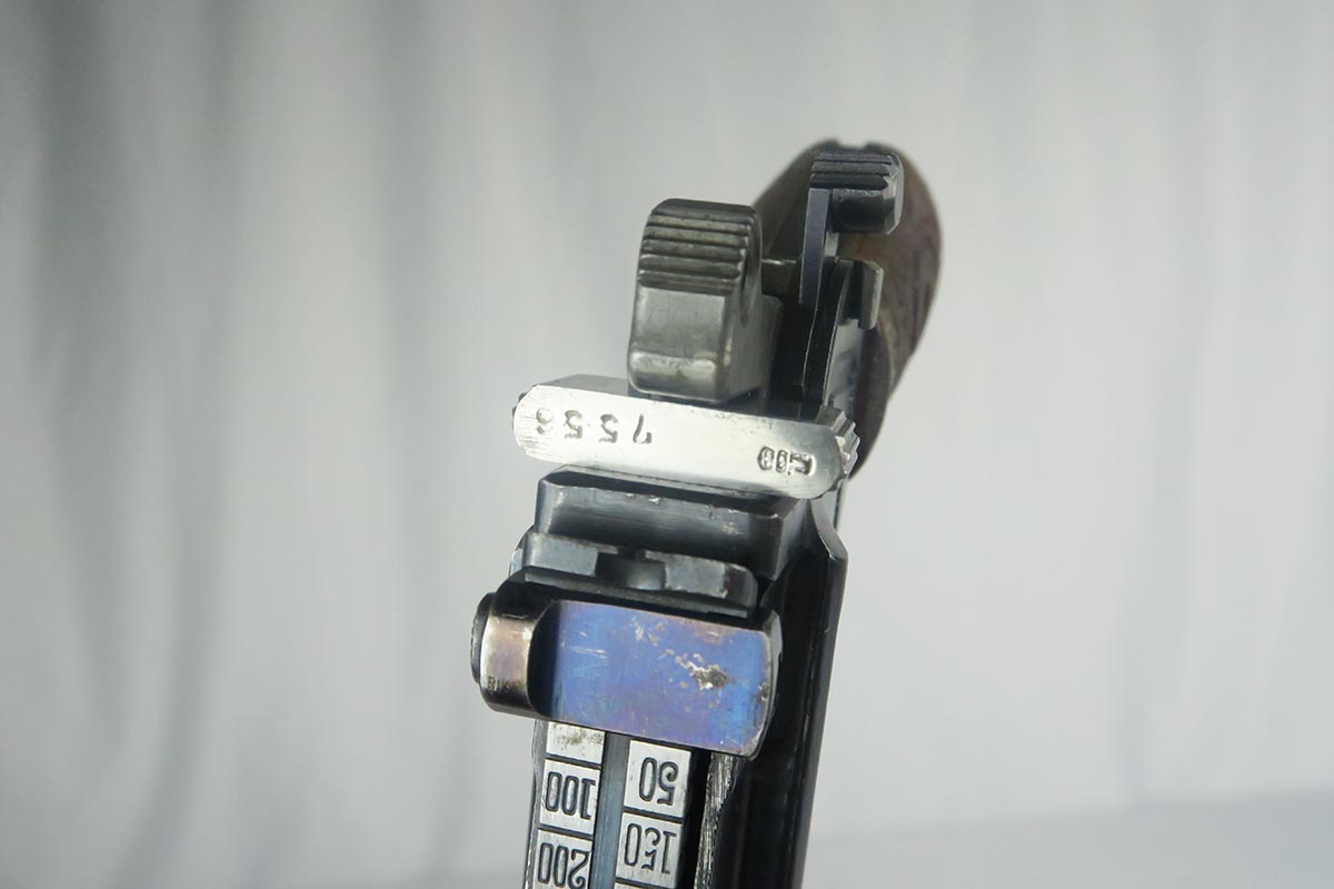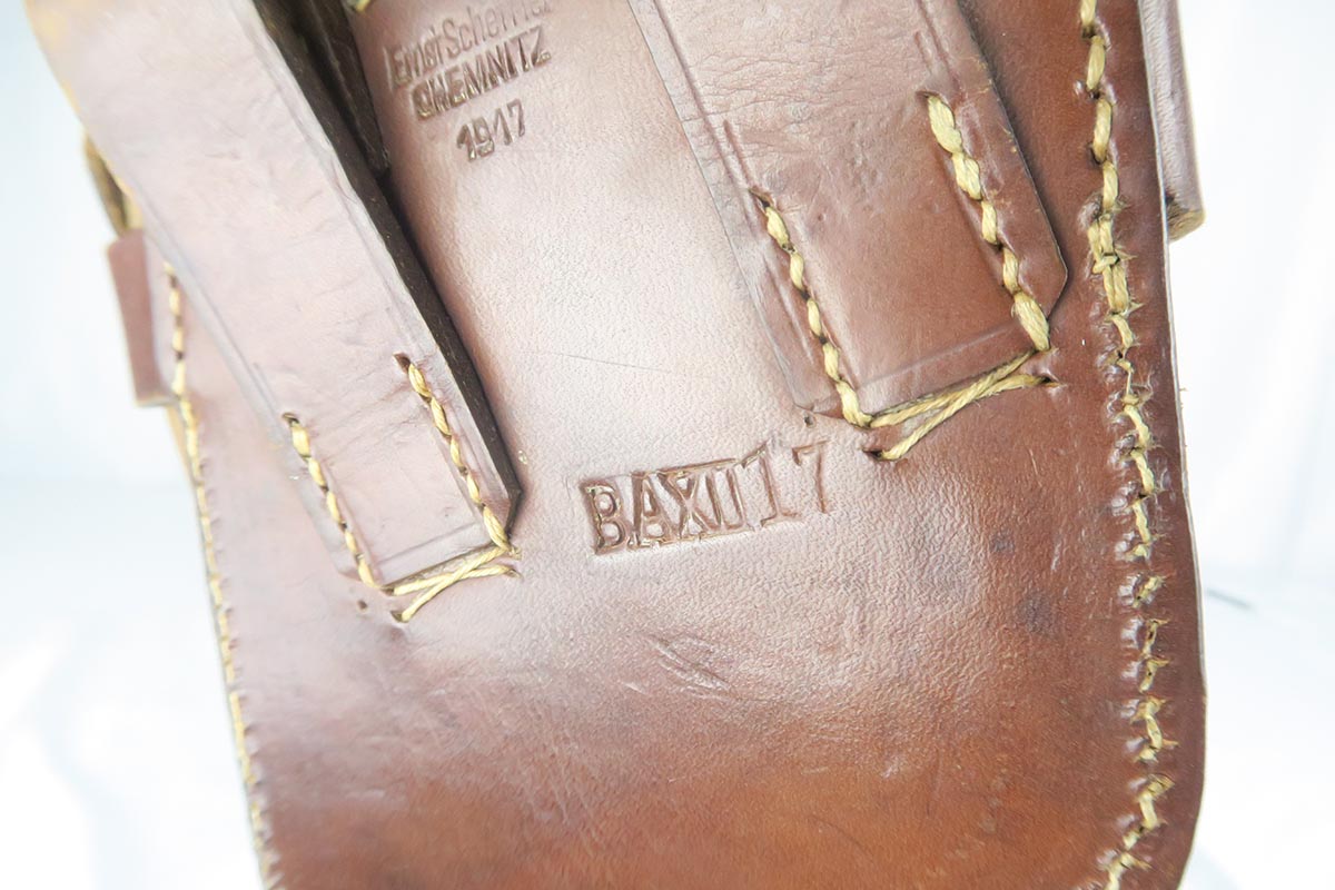 1/9/18 – This is an absolutely magnificent example of a WWI Mauser C96 “Red 9” pistol in 98-99% original condition with matching shoulder stock and leather harness. This gun is a scarce Prussian contract variation and has a large Prussian eagle stamped on the front of the magazine well. The gun is all matching and has only a hint of wear from being in a shoulder stock and a tiny nick/scratch on the left side of the frame that is not through the blue. It comes with the original matching grips in excellent condition. The fireblue is vivid on the small parts. The shoulder stock is in superb shape as well with a sharp Imperial proof mark in the wood and a matching serial number on the iron. It has no cracks or other noticeable defects aside from light field wear. The excellent leather harness is original and is maker marked and dated. It is without defects and comes with an original cleaning rod. The bore has strong rifling but shows some frosting and freckling in the grooves.