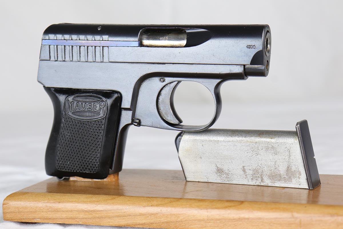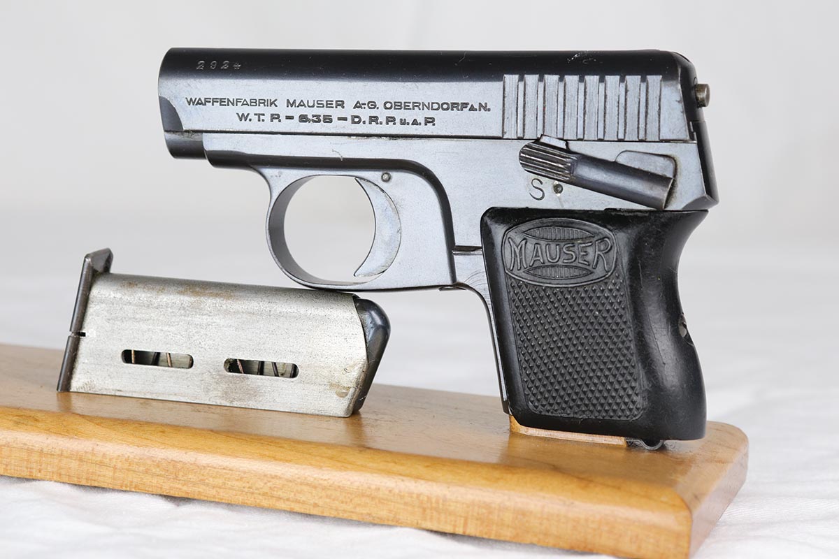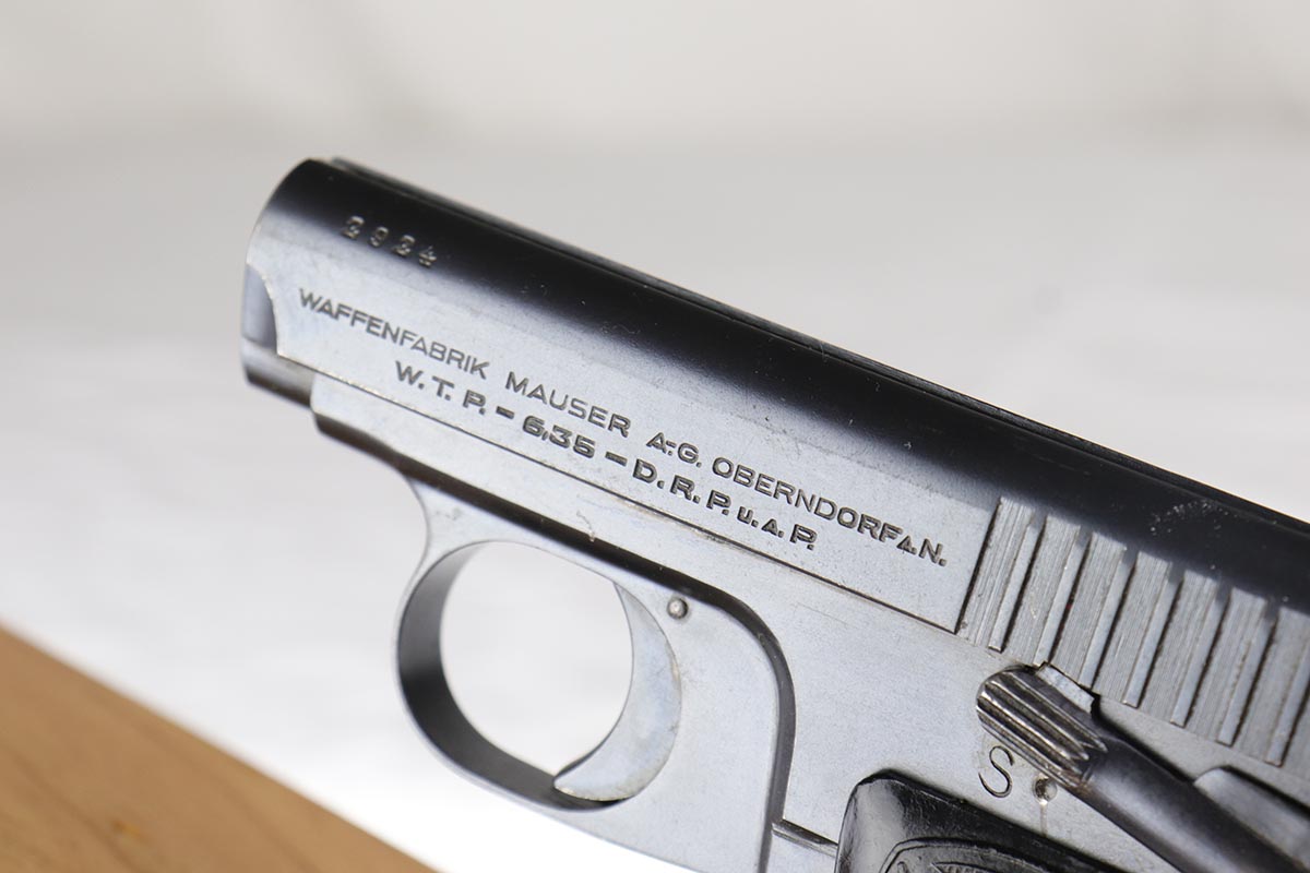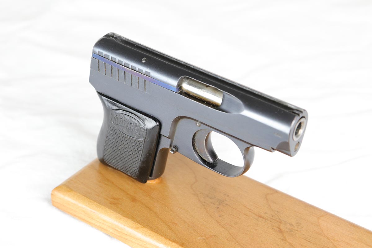 5/1/18 – This is a superb example of an early, desirable Mauser WTP I pistol, chambered in .25 ACP.  It was made in the 1920s and retains over 99% of the original “rust” blue.  Excellent grips and bore. These small “vest pocket” pistols became very popular self defense guns following WWI and competed with the likes of Walther #5, Sauer WTM and Browning FN1906 models. Examples in such pristine condition are almost impossible to find.