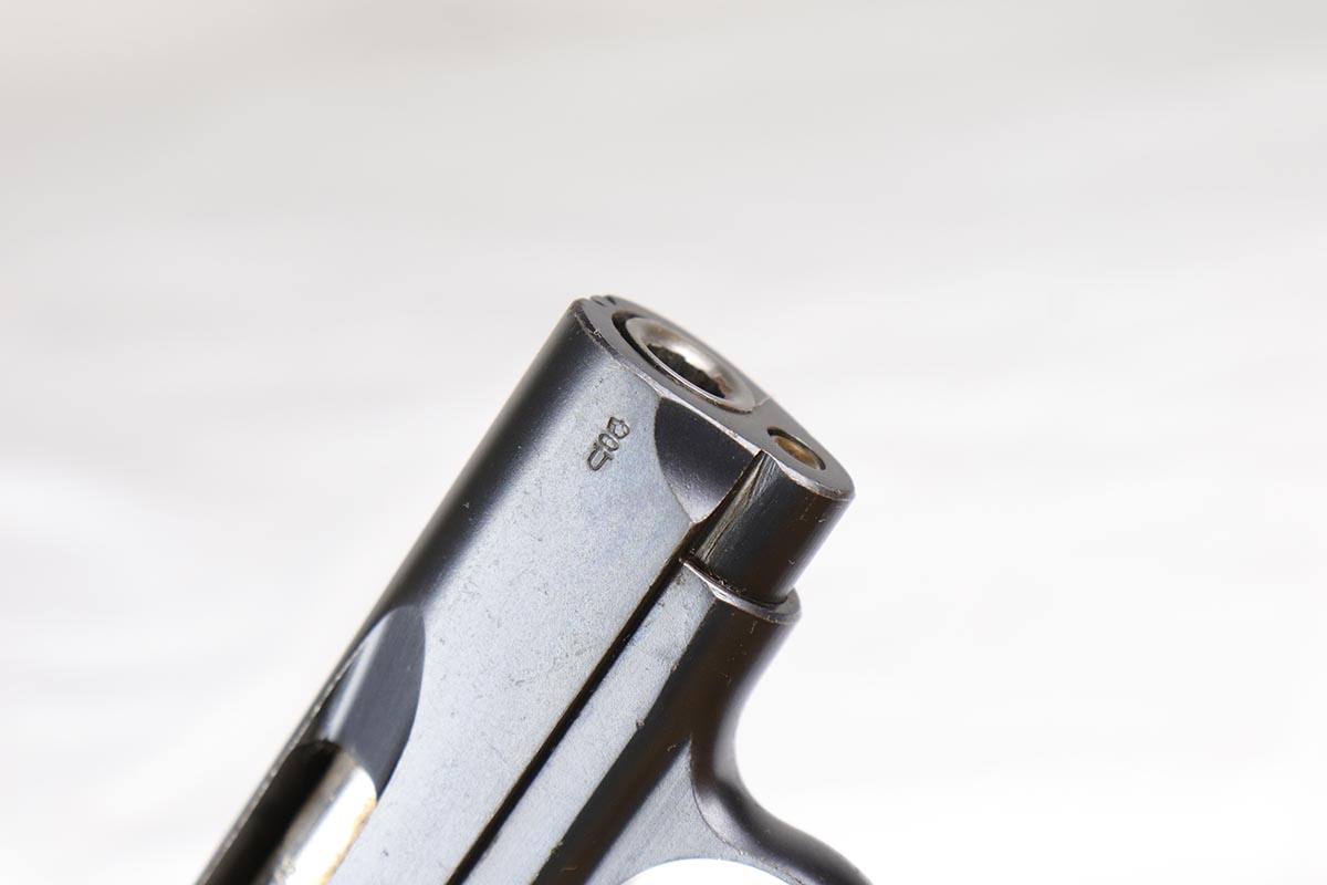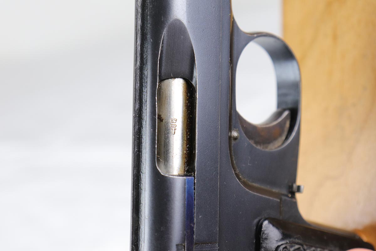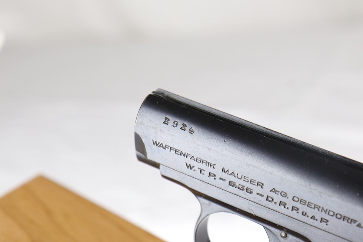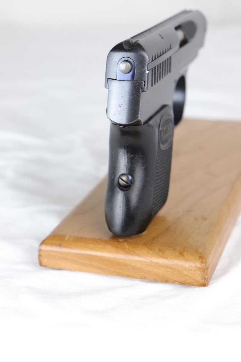 5/1/18 – This is a superb example of an early, desirable Mauser WTP I pistol, chambered in .25 ACP.  It was made in the 1920s and retains over 99% of the original “rust” blue.  Excellent grips and bore. These small “vest pocket” pistols became very popular self defense guns following WWI and competed with the likes of Walther #5, Sauer WTM and Browning FN1906 models. Examples in such pristine condition are almost impossible to find.