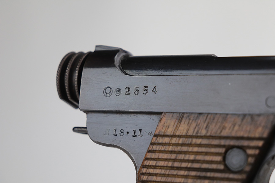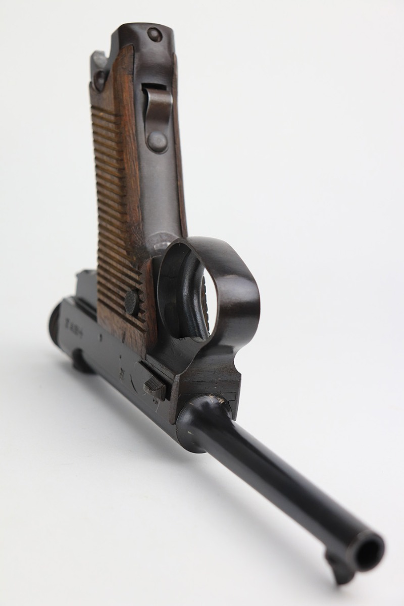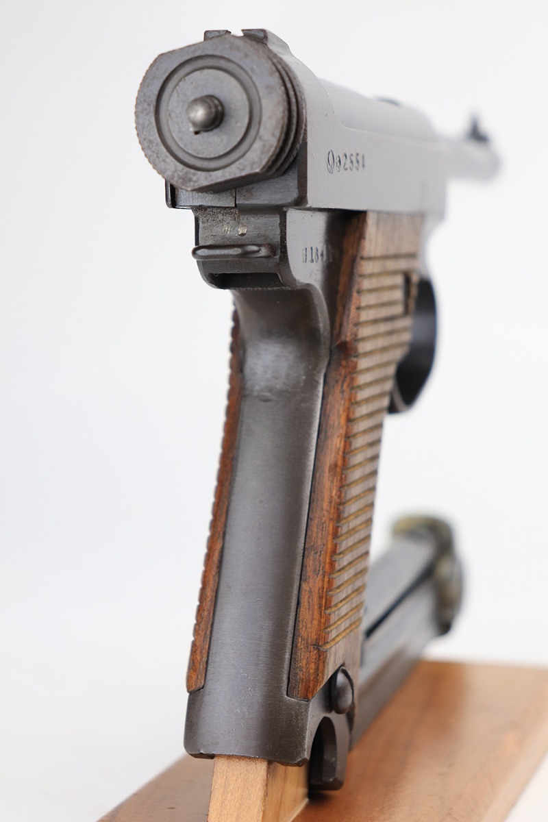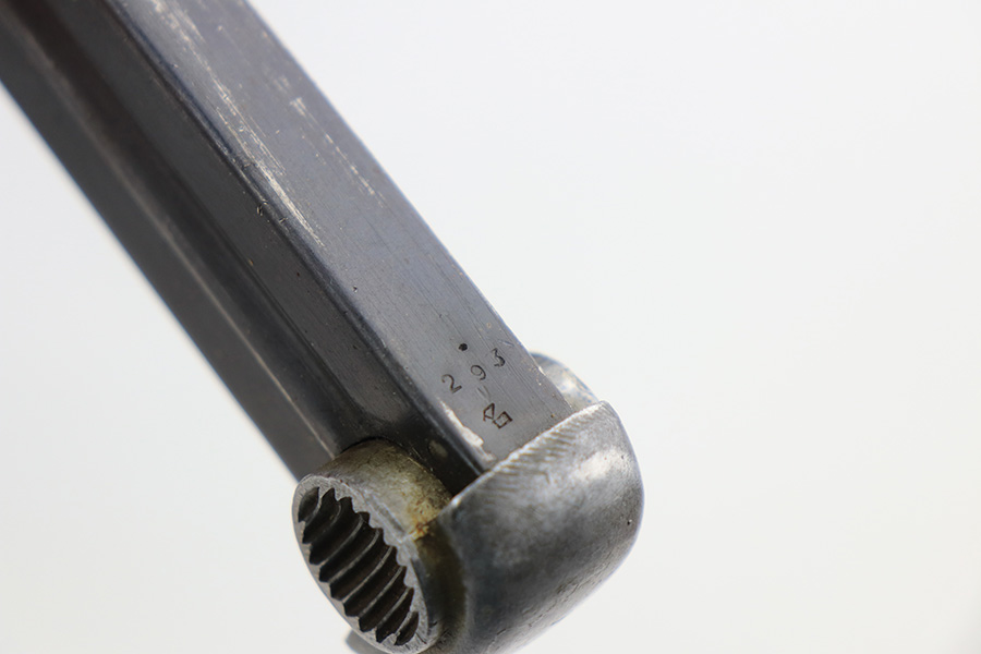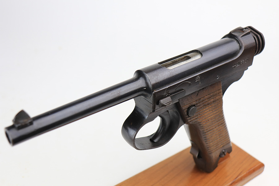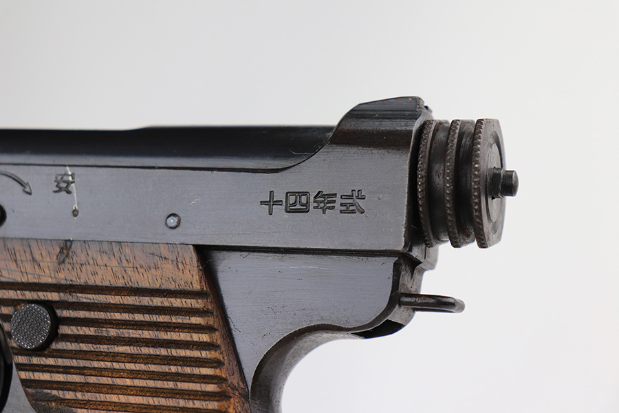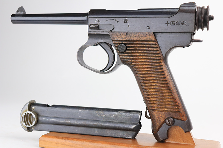 2/22/22 – This is a mint example of a Nambu Type 14 issued to the Japanese military in November of 1943. The gun is all matching and comes with a period-correct but mismatched magazine. There is also some numbering written in marker on the base of the magazine. The gun has retained nearly all of its original finish. There are just the slightest hints of thinning and light brown patina on the grip straps. Comes with excellent matching-numbered wood grips. The bore is mint.