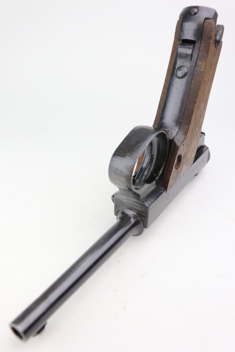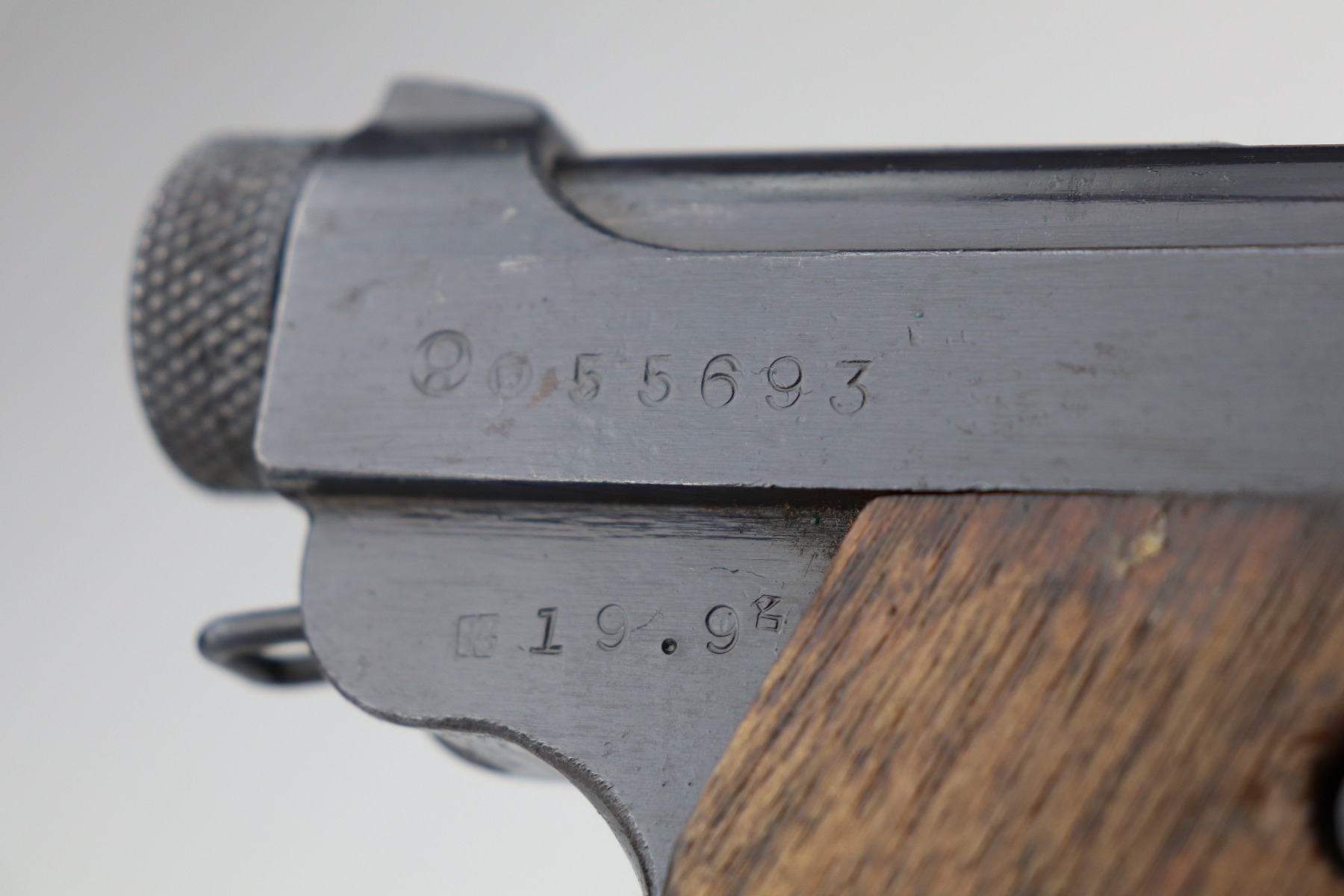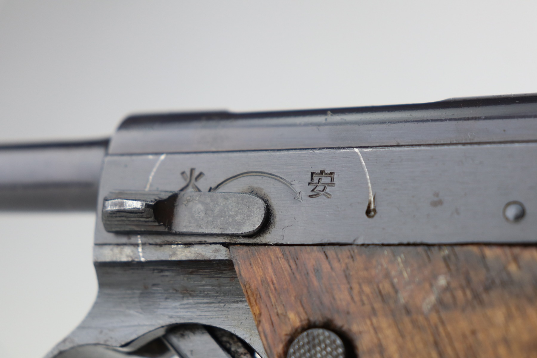 7/8/21 – This is a mint example of a Nambu Type 14 issued to the Japanese military in September of 1944. It is all matching and comes with a matching magazine. It comes with desirable late-war slab style wood grips. The grips do not match the gun but match each other. The gun has retained about 99% of its finish. There is just one handling mark on the left side of the barrel. The bore is mint.