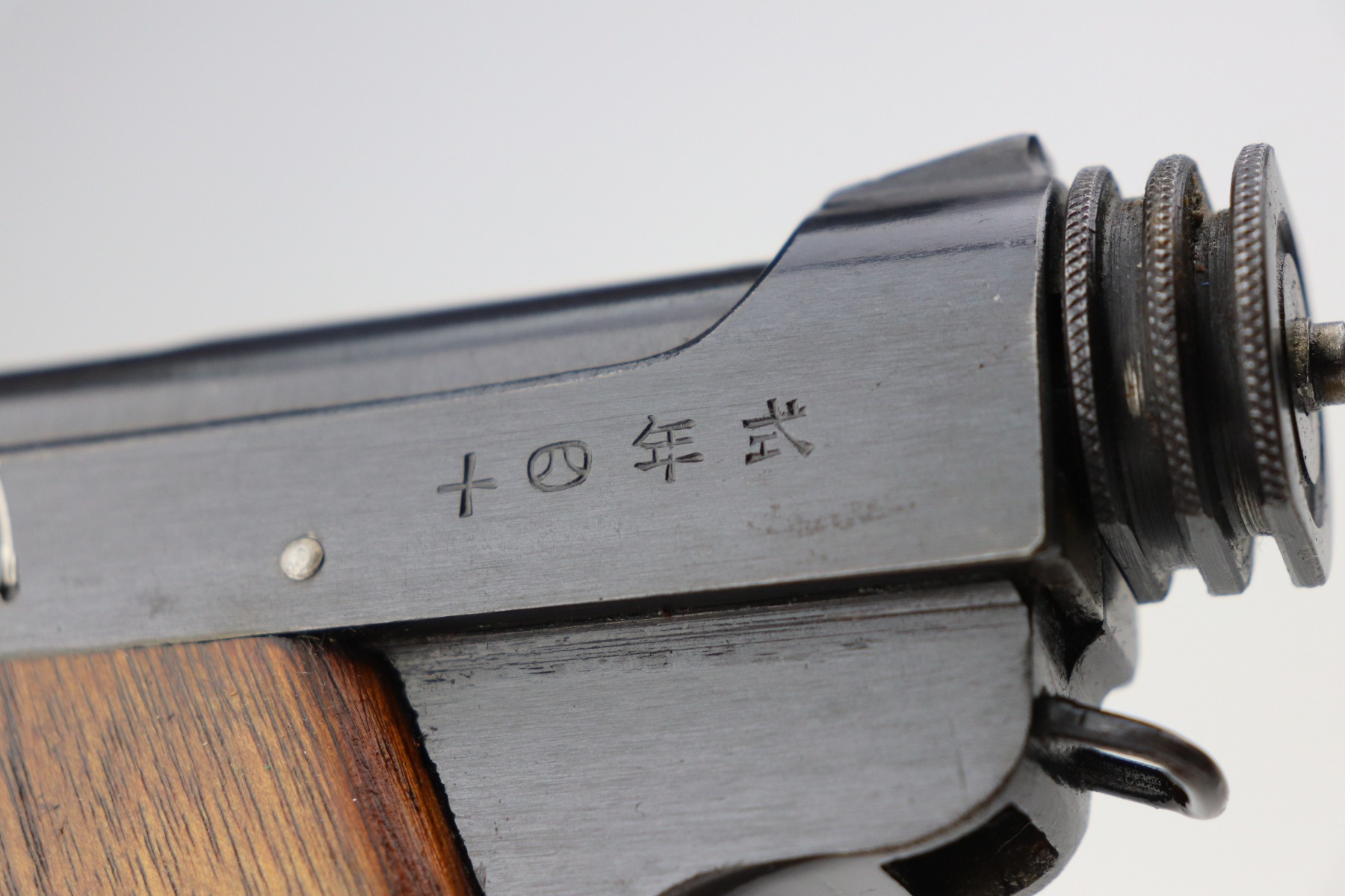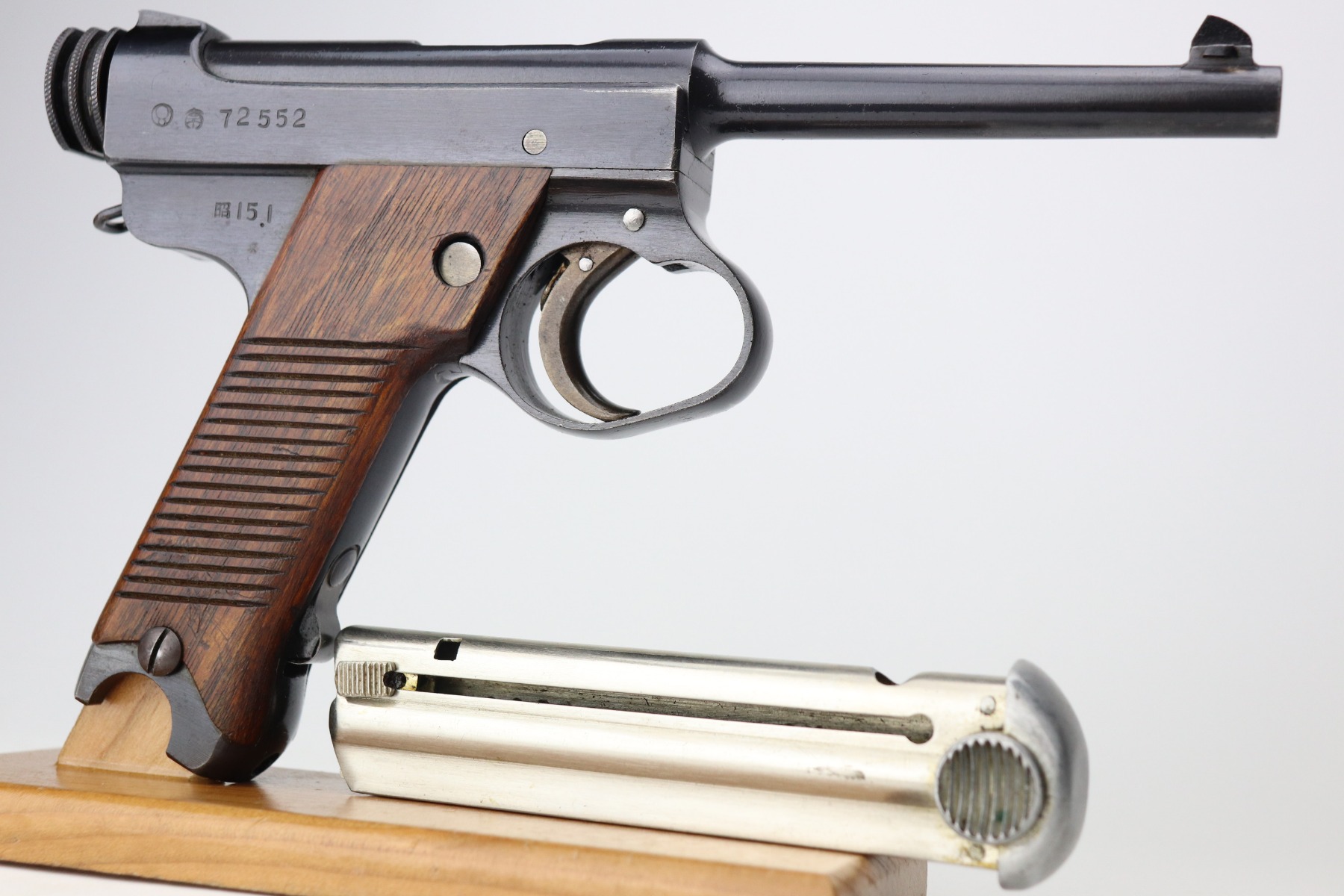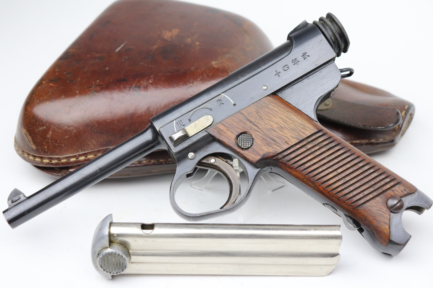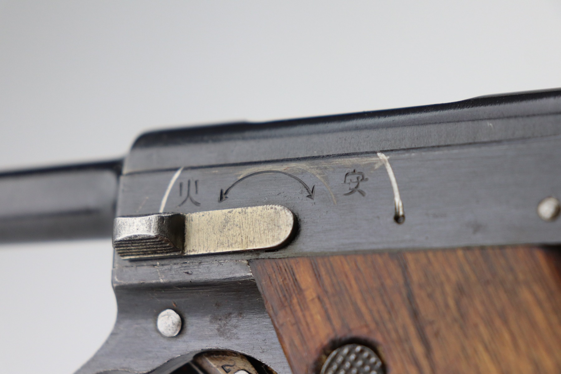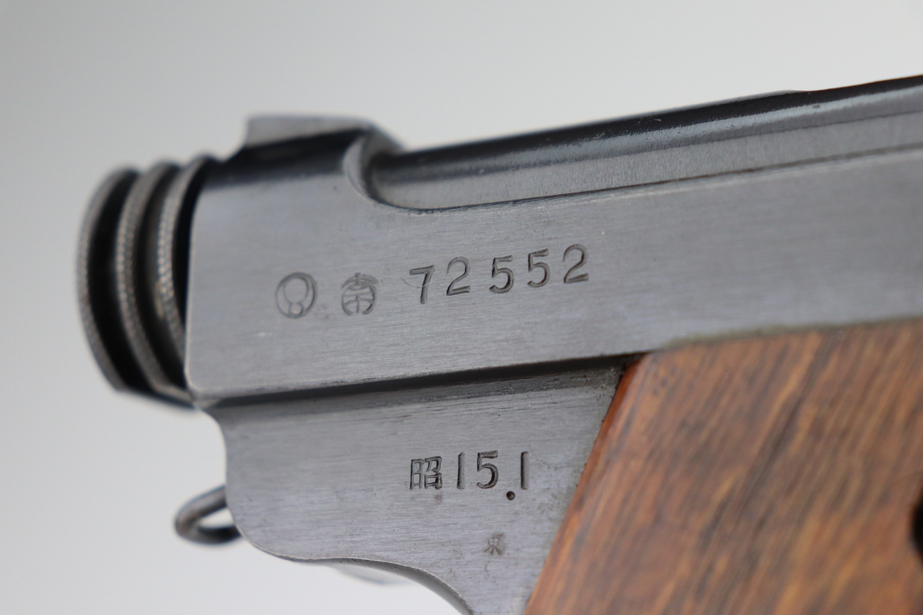 2/9/21 – This is a mint example of a Nambu Type 14 Rig issued to the Japanese military in January of 1940. It is all matching. The rig comes with an excellent original holster and a period-correct magazine that does not match the gun. The gun is in mint condition, retaining 99% of its bluing. There is just a hint of wear on some of the high edges and a few small areas of spotty oxidation on the barrel. The bore is mint. Excellent grips.