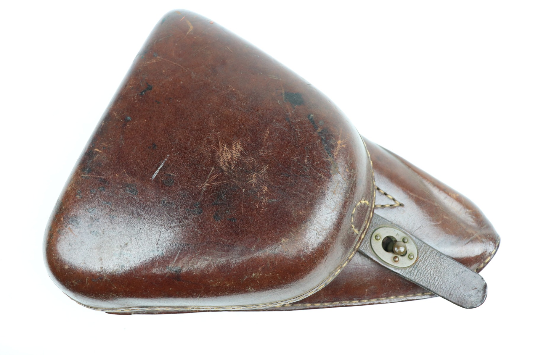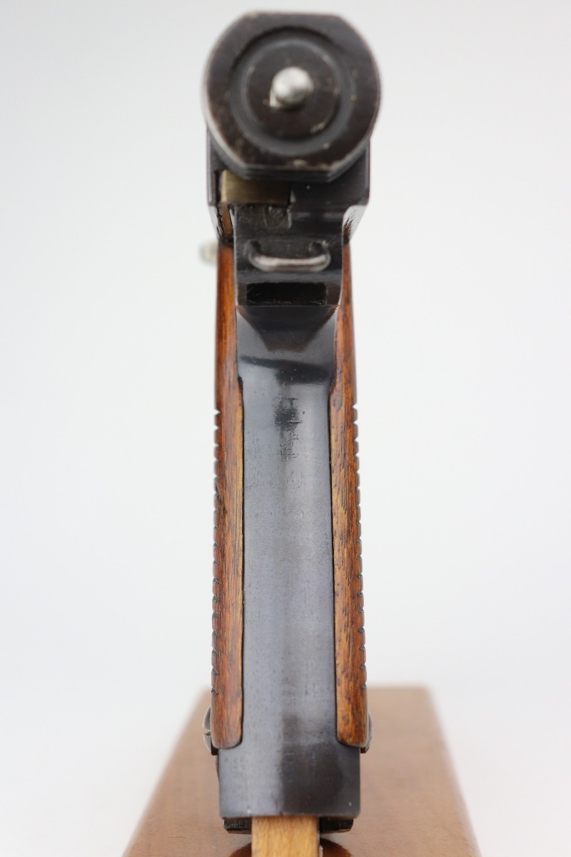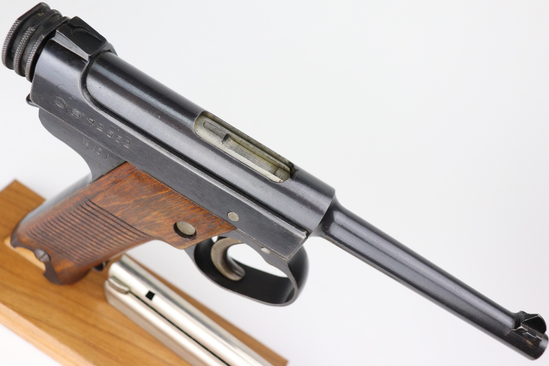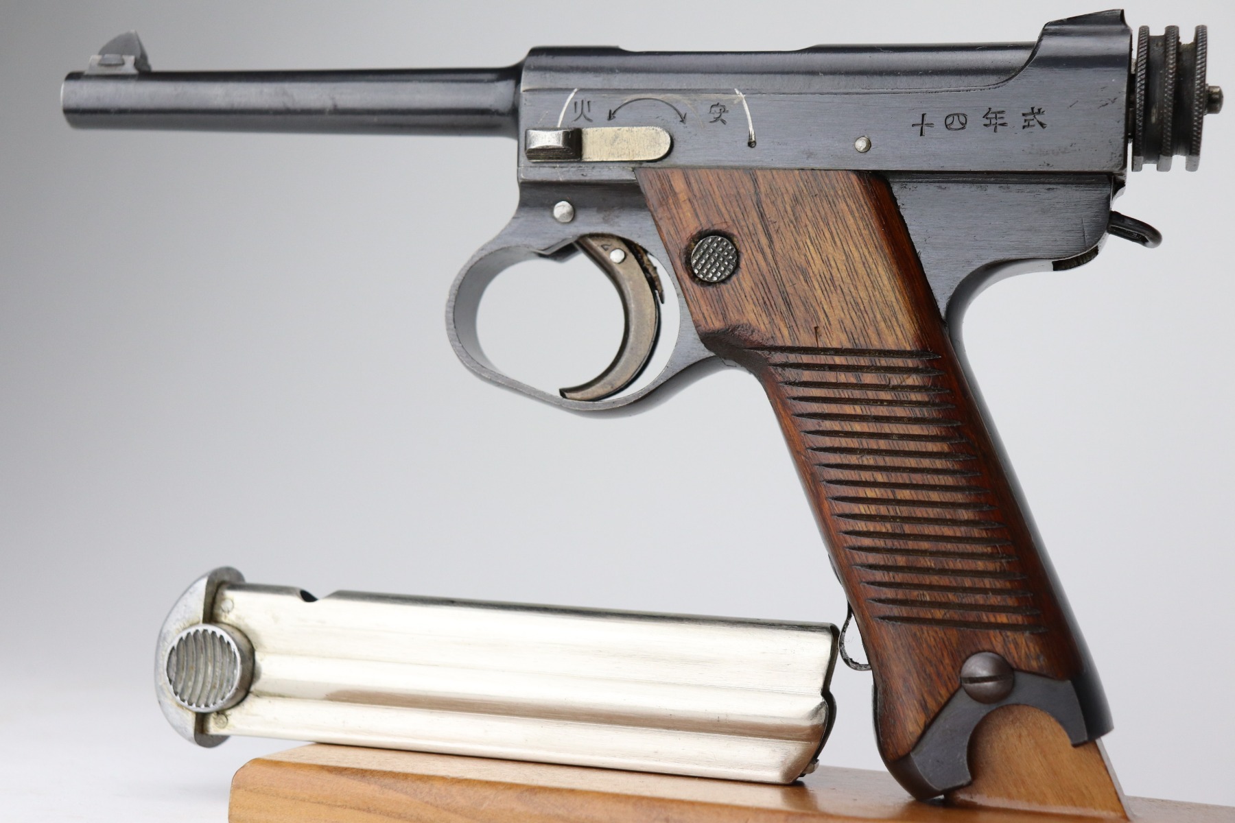 2/9/21 – This is a mint example of a Nambu Type 14 Rig issued to the Japanese military in January of 1940. It is all matching. The rig comes with an excellent original holster and a period-correct magazine that does not match the gun. The gun is in mint condition, retaining 99% of its bluing. There is just a hint of wear on some of the high edges and a few small areas of spotty oxidation on the barrel. The bore is mint. Excellent grips.