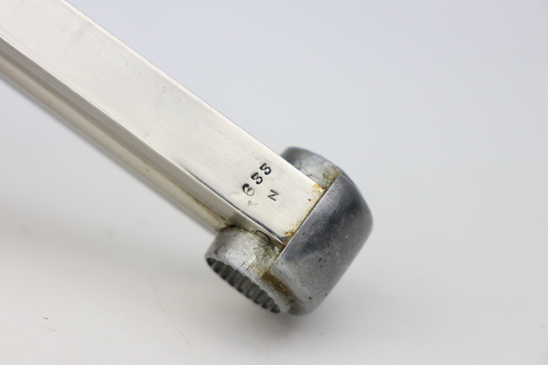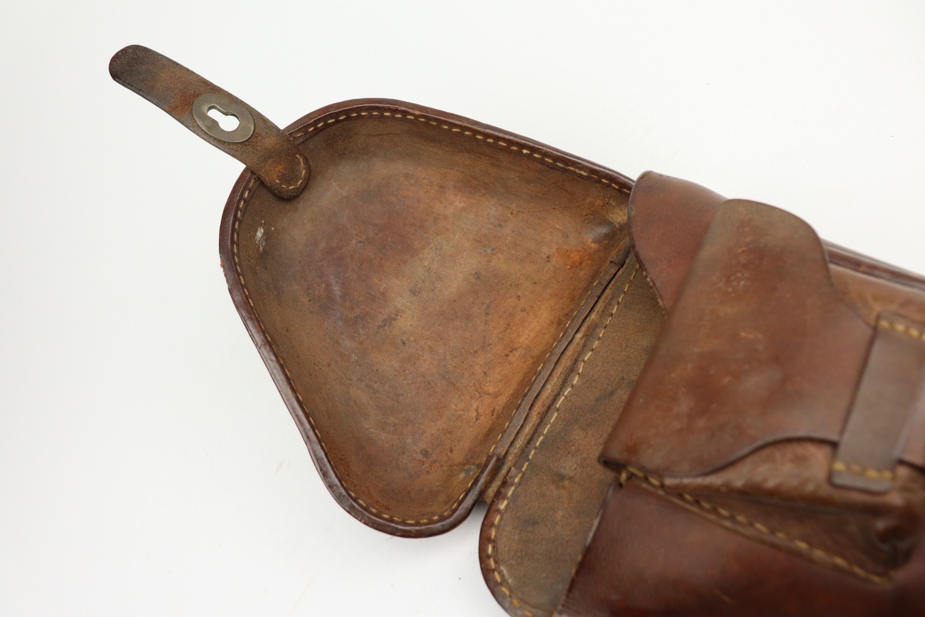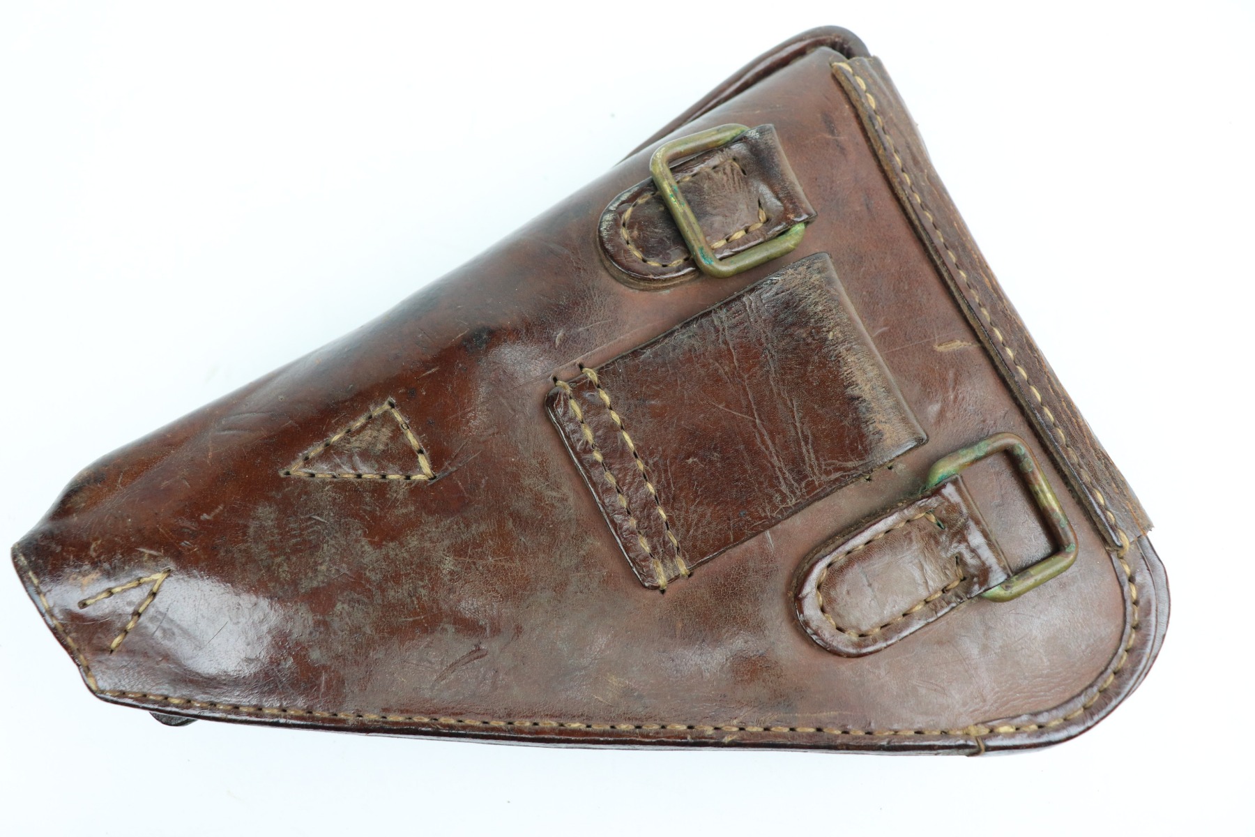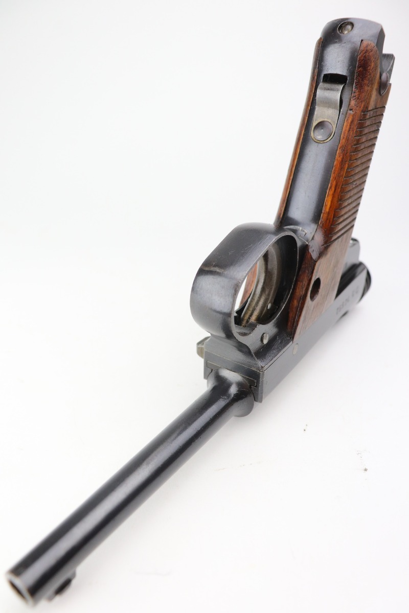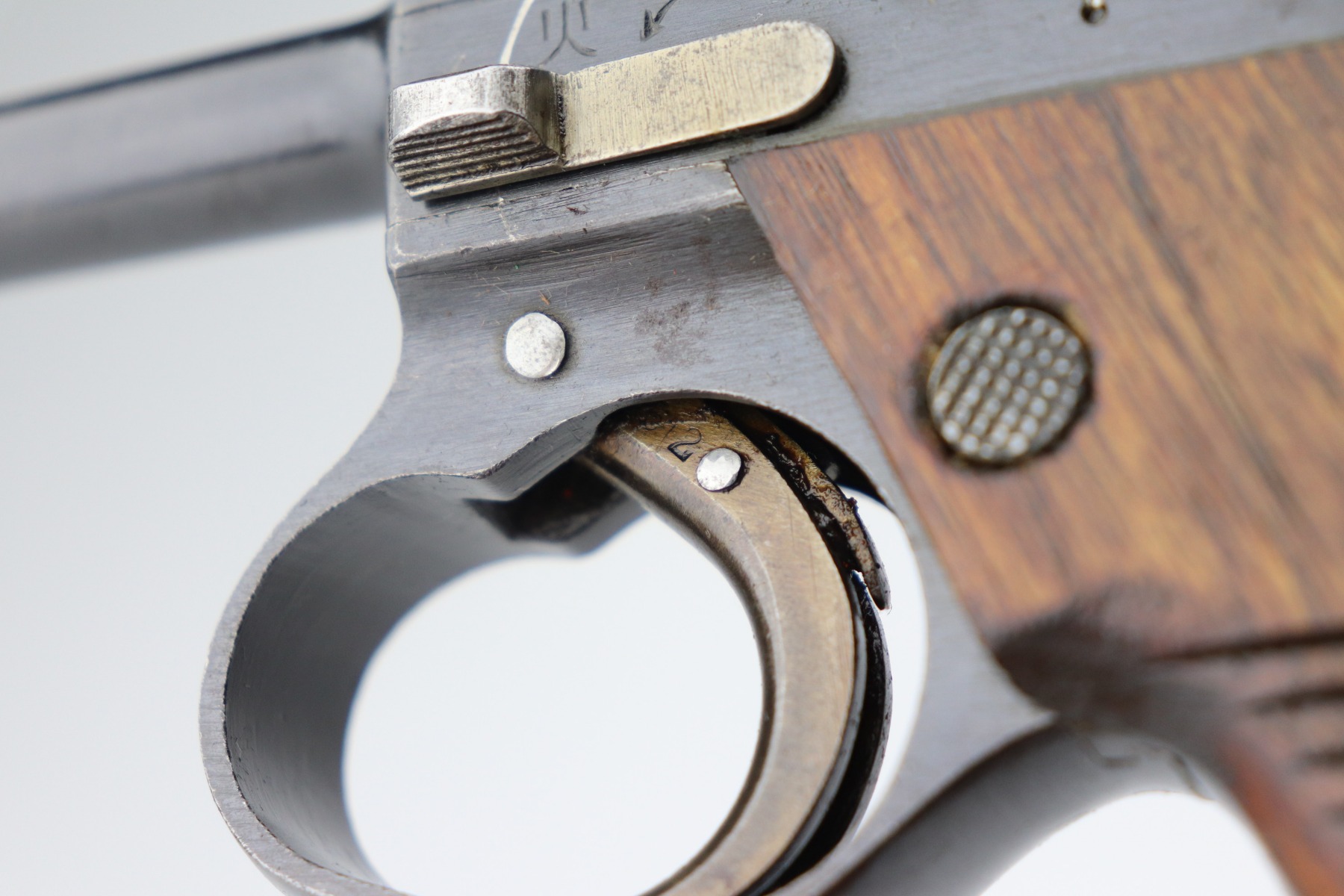 2/9/21 – This is a mint example of a Nambu Type 14 Rig issued to the Japanese military in January of 1940. It is all matching. The rig comes with an excellent original holster and a period-correct magazine that does not match the gun. The gun is in mint condition, retaining 99% of its bluing. There is just a hint of wear on some of the high edges and a few small areas of spotty oxidation on the barrel. The bore is mint. Excellent grips.