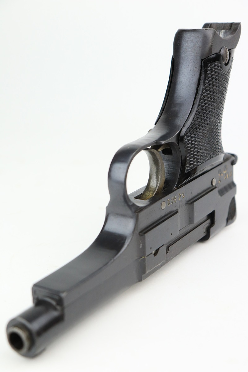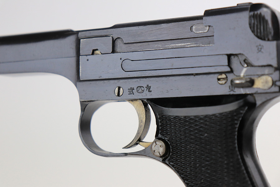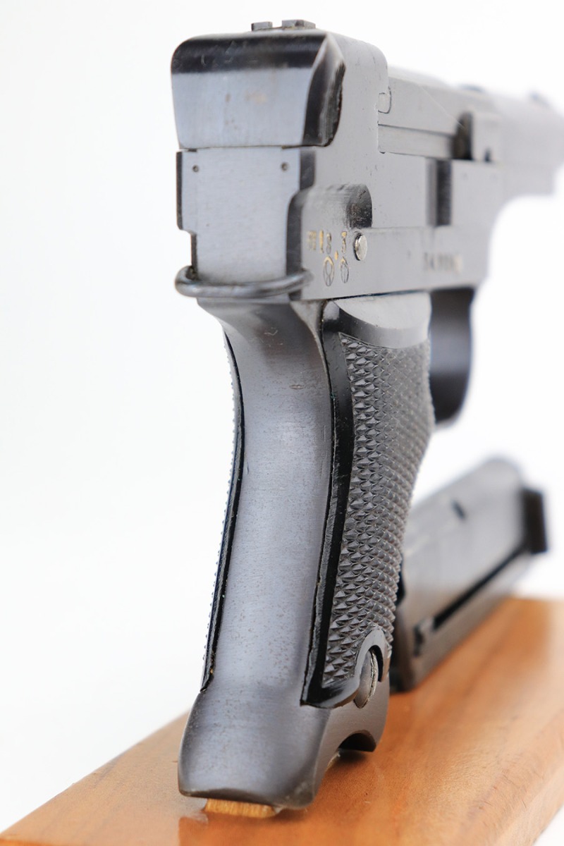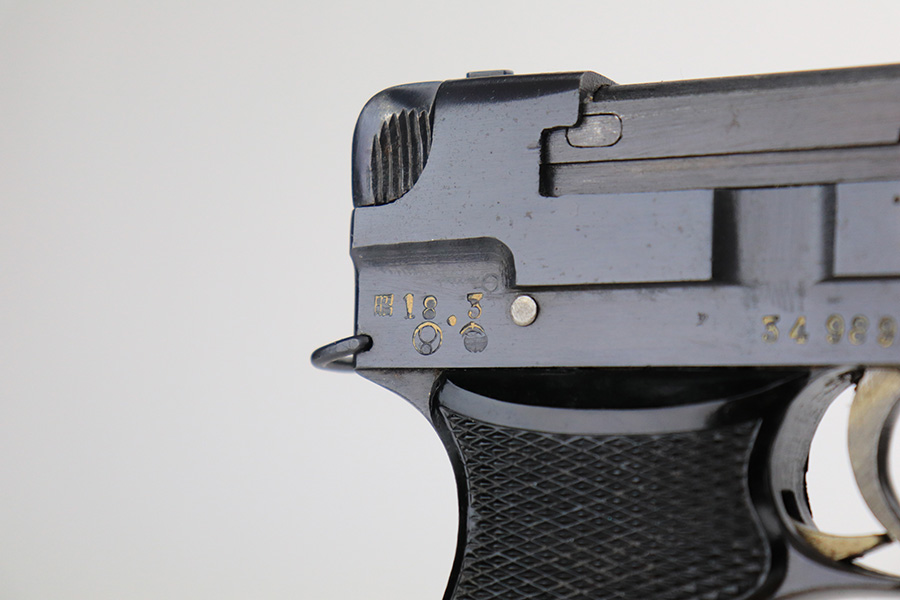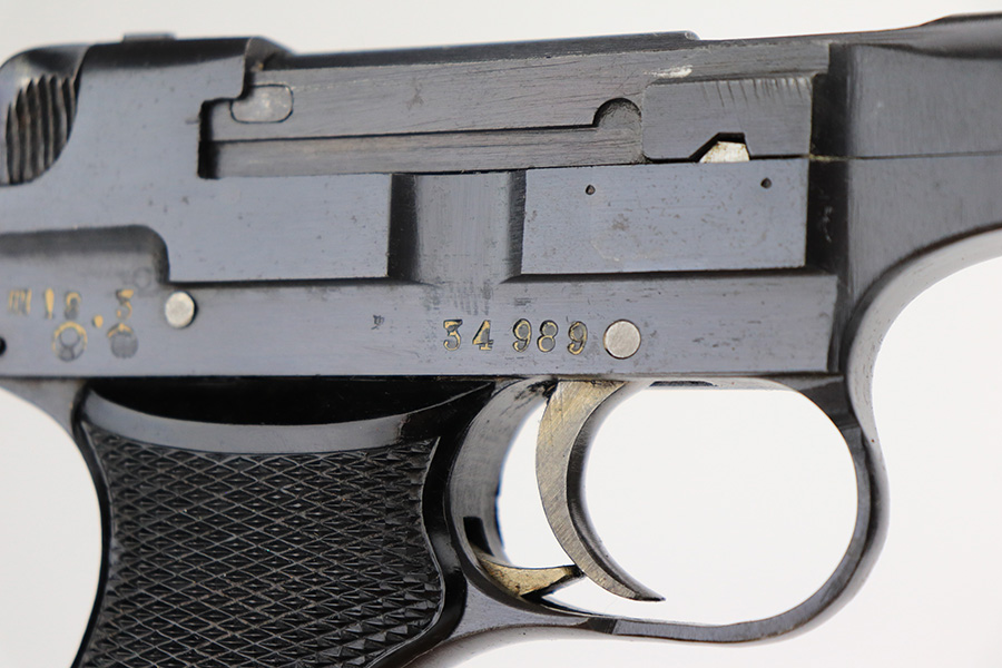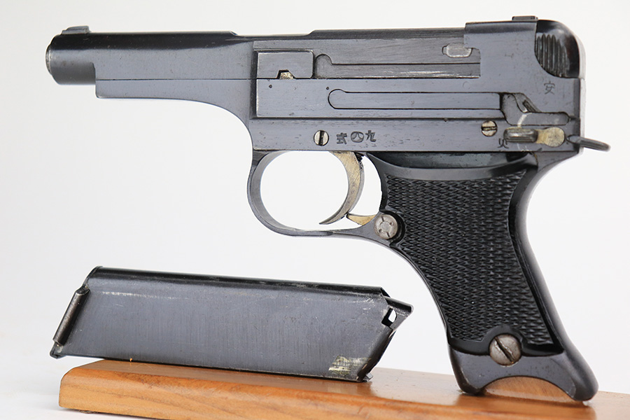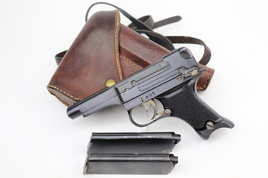 5/19/22 – This is a mint example of a Nambu Type 94 issued to the Japanese military in March of 1943. It is all matching and comes as a rig with a minty scarce leather shoulder holster (with shoulder strap), one original matching-numbered magazine, and one period-correct magazine that is not matching but very close in number. There is a faint ink stamp on the inside of the holster dating it to November of 1943. The gun itself has retained virtually all of its bluing with just very minor freckling on the grip straps. Comes with excellent period-correct black bakelite grips. Stone-mint bore.