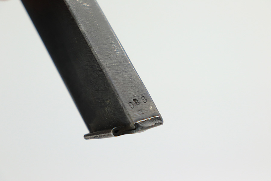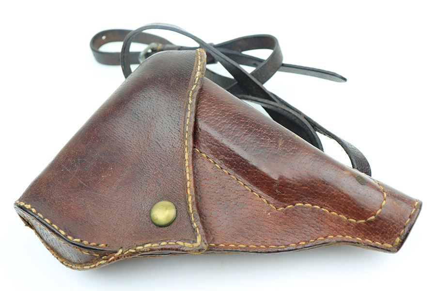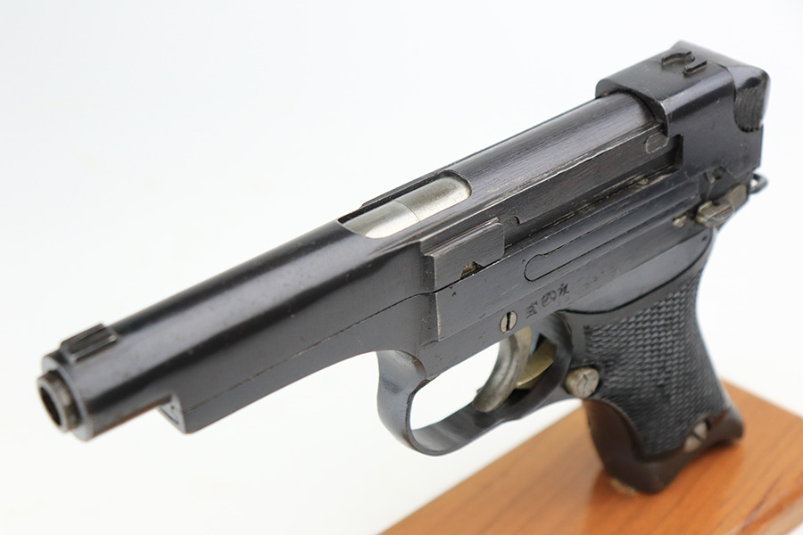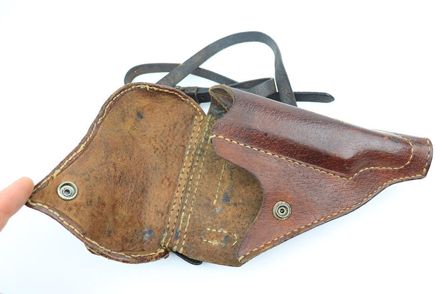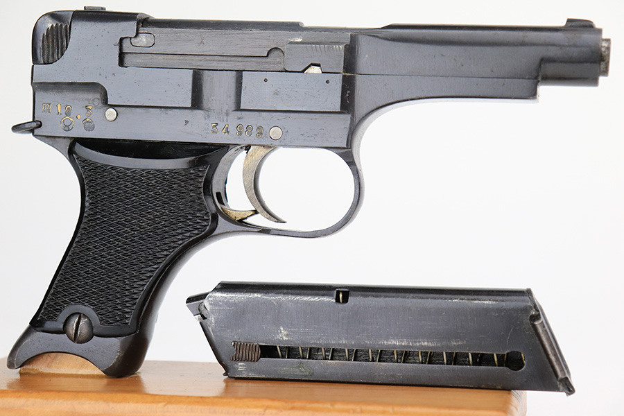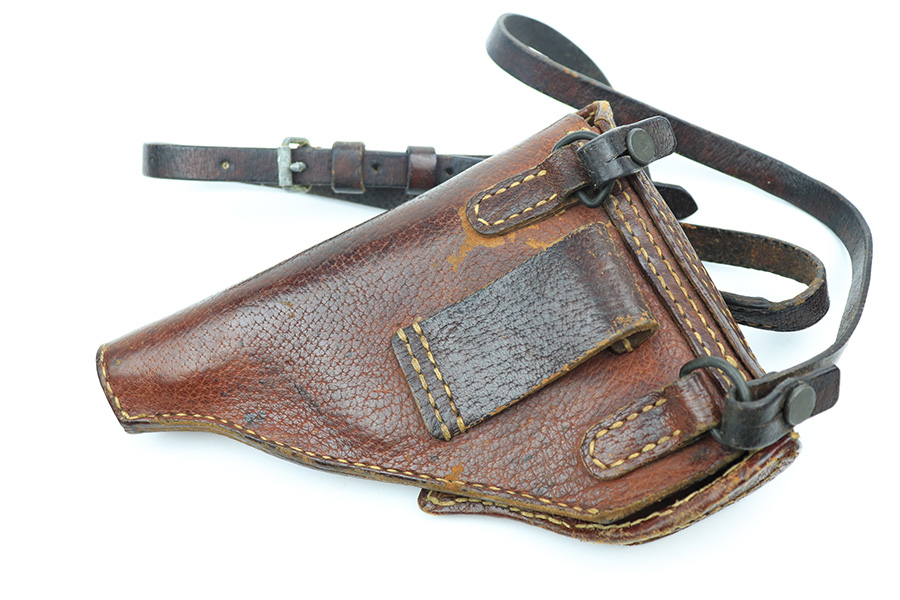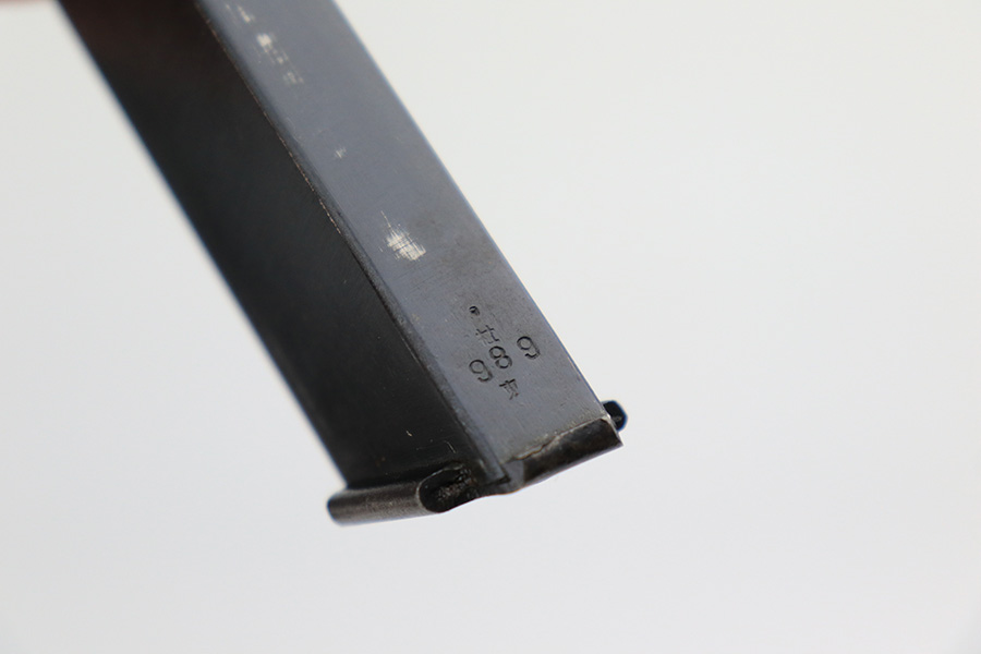 5/19/22 – This is a mint example of a Nambu Type 94 issued to the Japanese military in March of 1943. It is all matching and comes as a rig with a minty scarce leather shoulder holster (with shoulder strap), one original matching-numbered magazine, and one period-correct magazine that is not matching but very close in number. There is a faint ink stamp on the inside of the holster dating it to November of 1943. The gun itself has retained virtually all of its bluing with just very minor freckling on the grip straps. Comes with excellent period-correct black bakelite grips. Stone-mint bore.